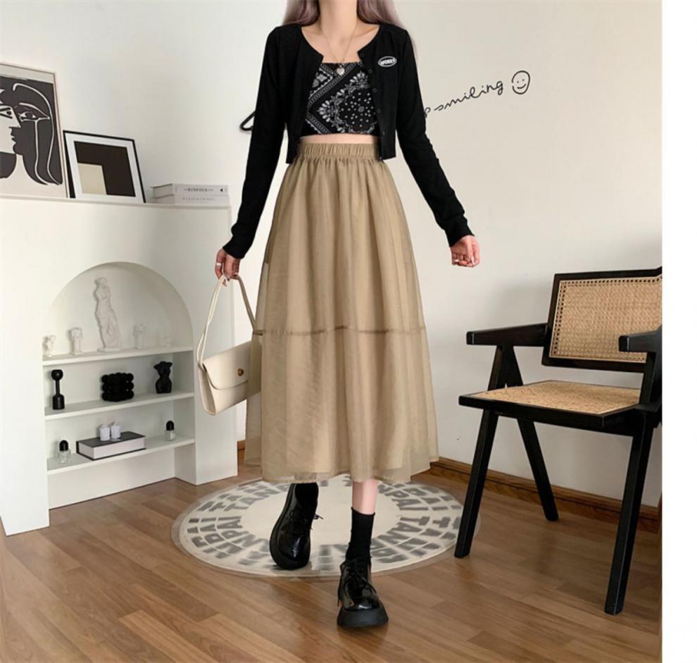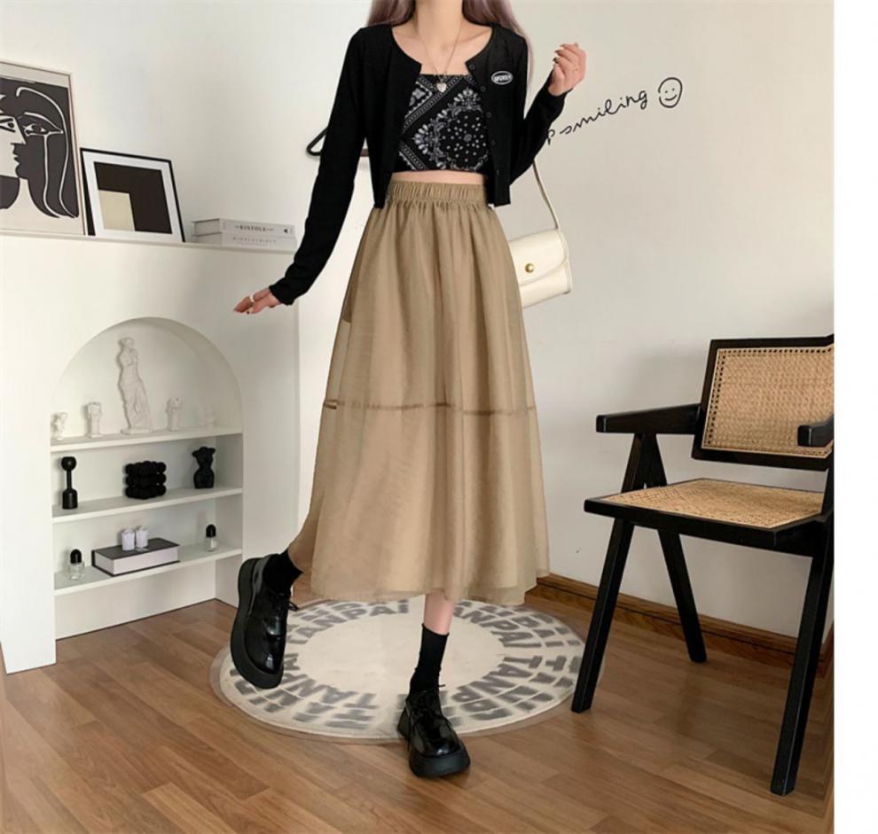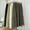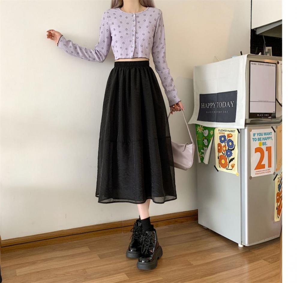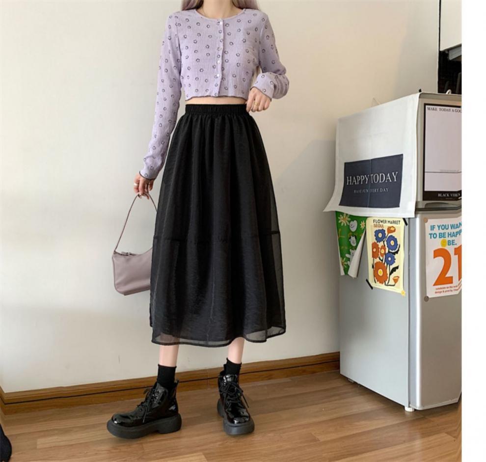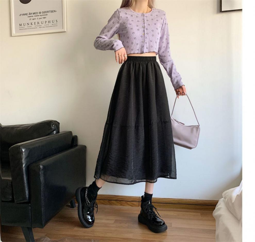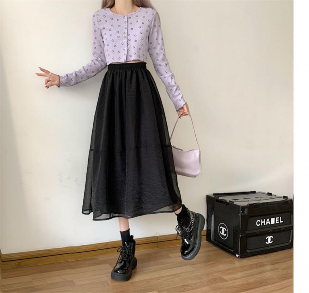 Falda de media pierna de estilo A para mujer, estilo veraniego, de cintura alta, ajustada, de organza, con bolsillos y solapa, empalmada, de largo medio y dobladillo grande.