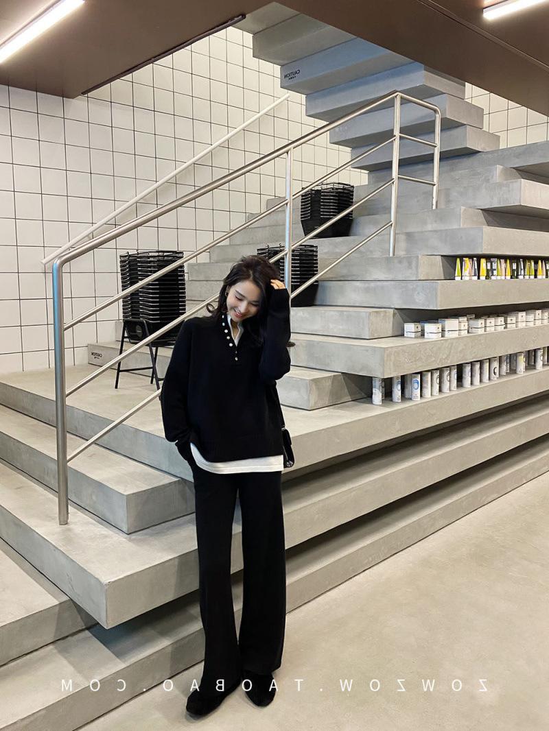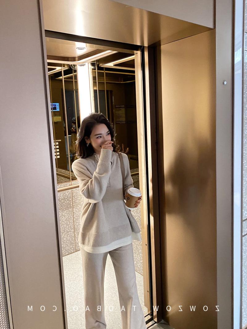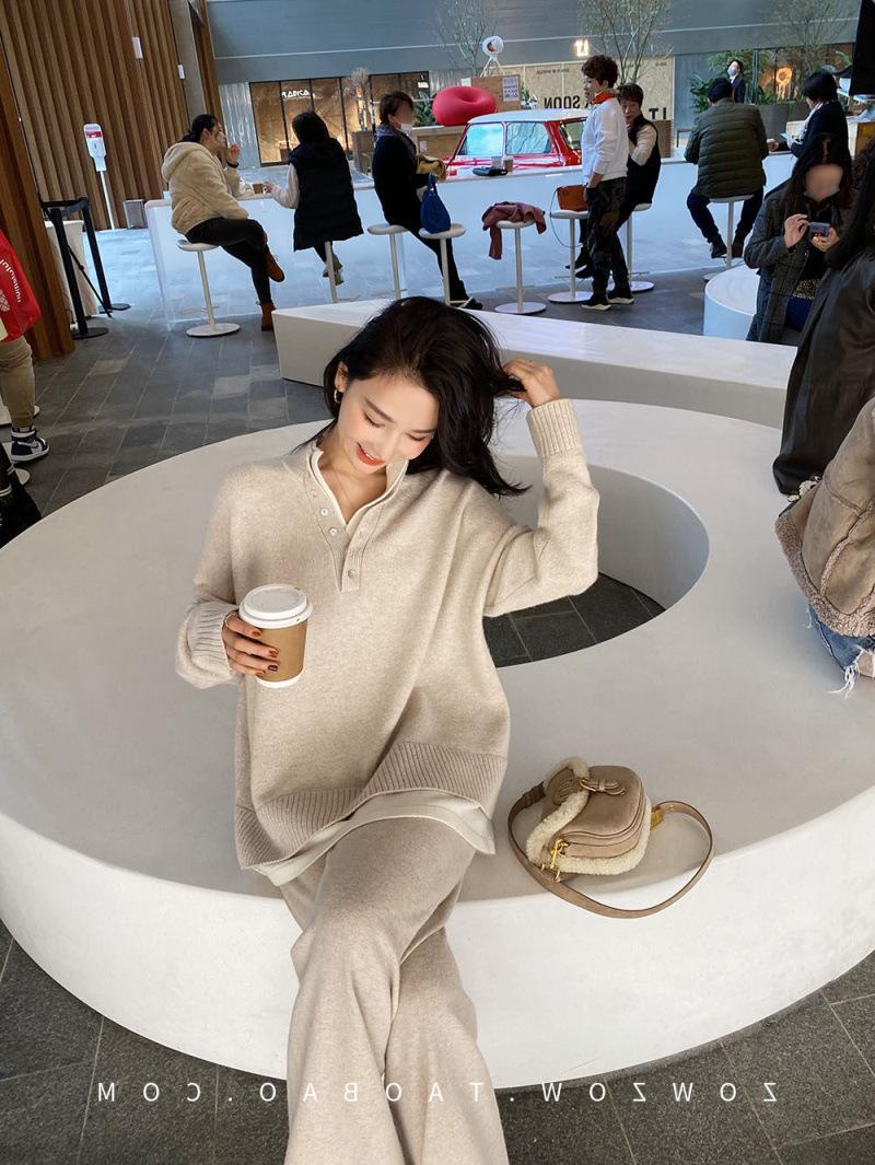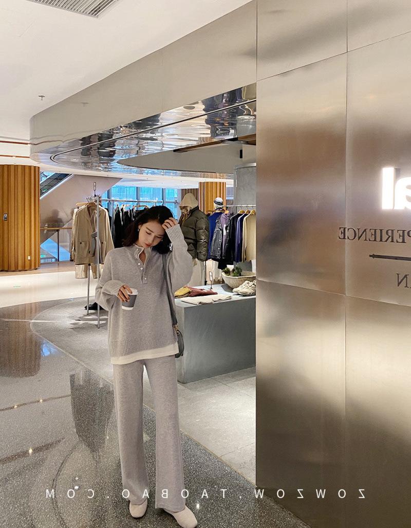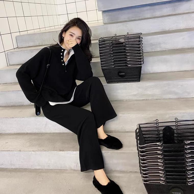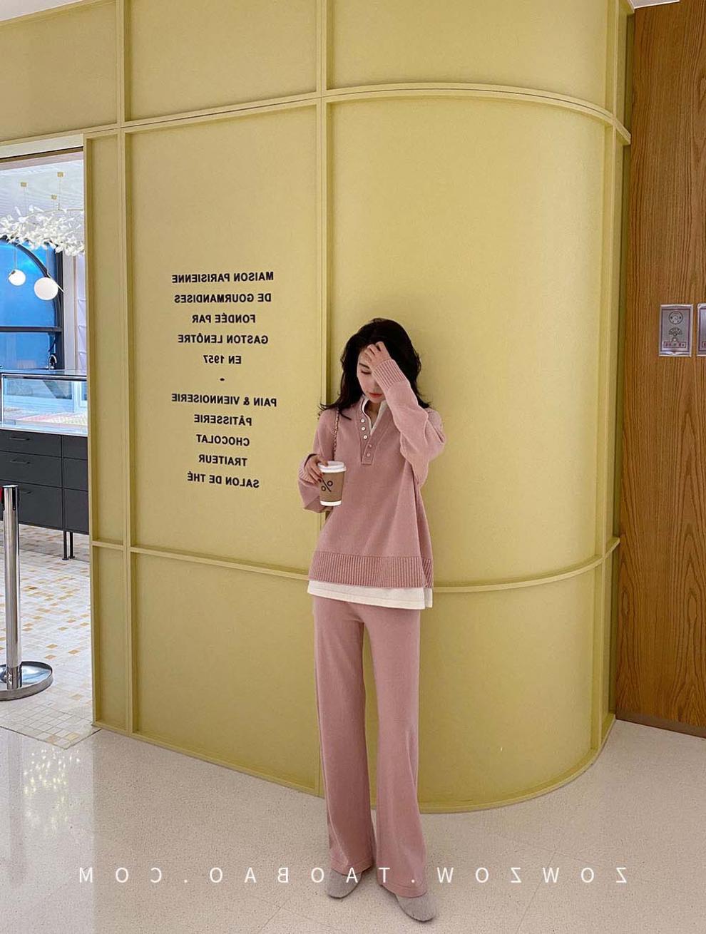Traje deportivo antiedad de estilo occidental, primavera y otoño 2023, ropa de mujer, suéter de punto de dos piezas falso, pantalones de pierna ancha, traje casual de dos piezas