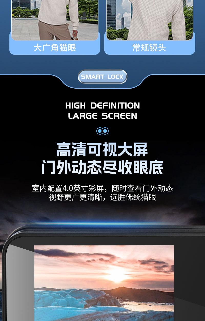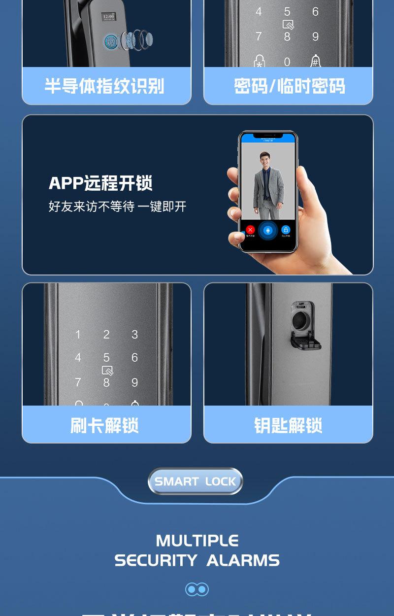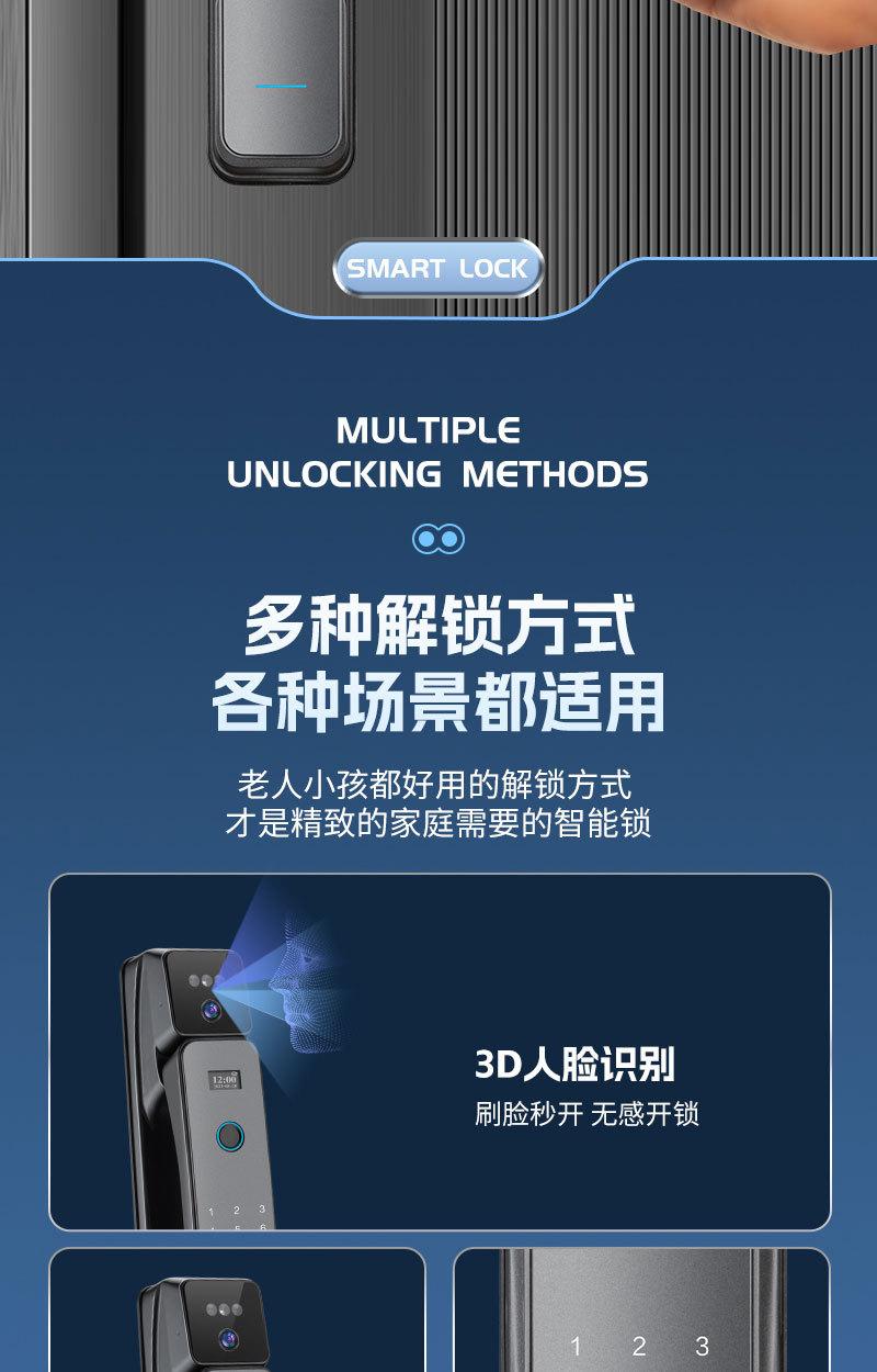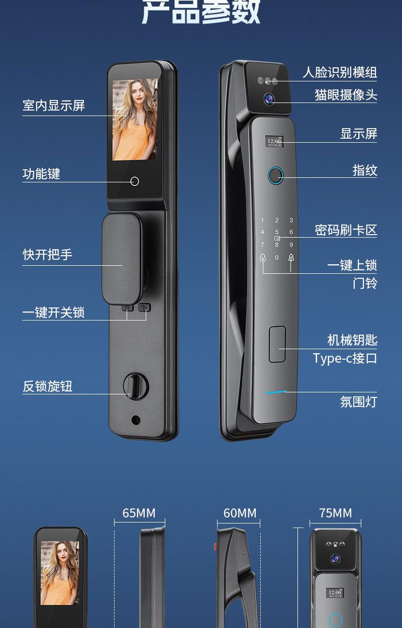 Fingerprint, Water proof, Password, With key, Visible cat eye, Face recognition, No need to open holes, Remote unlocking