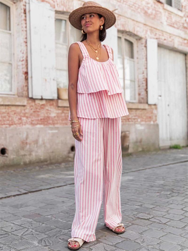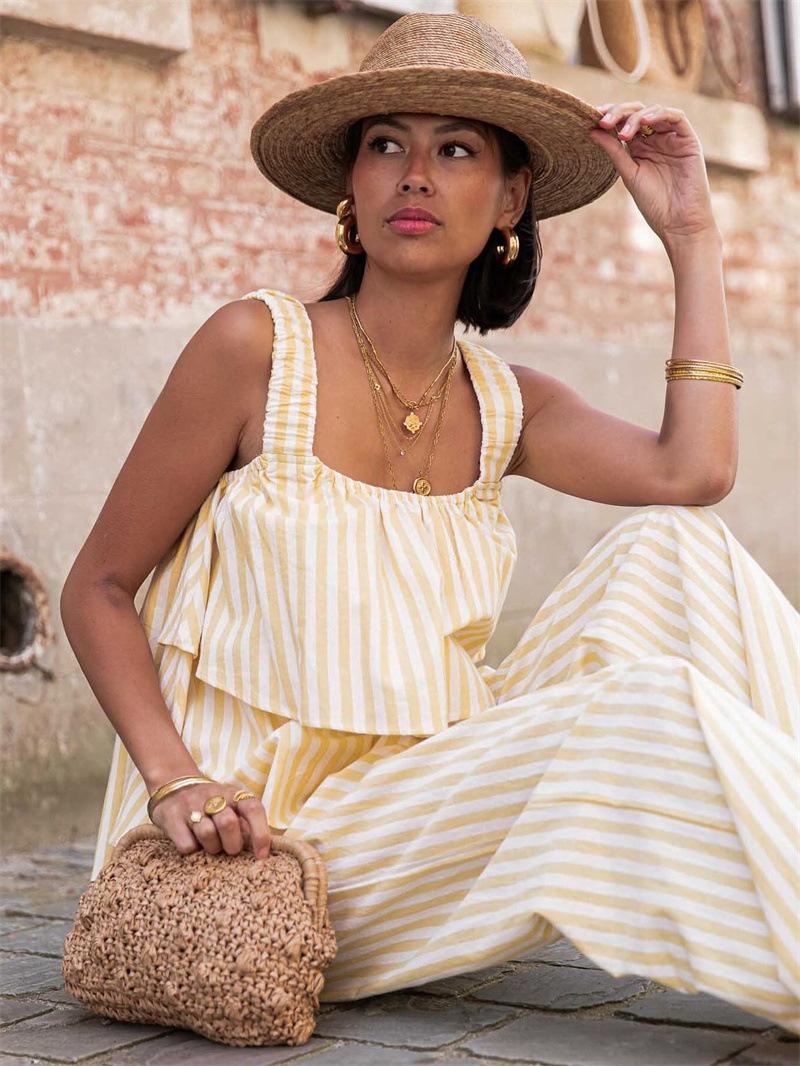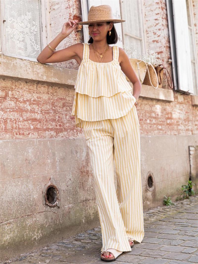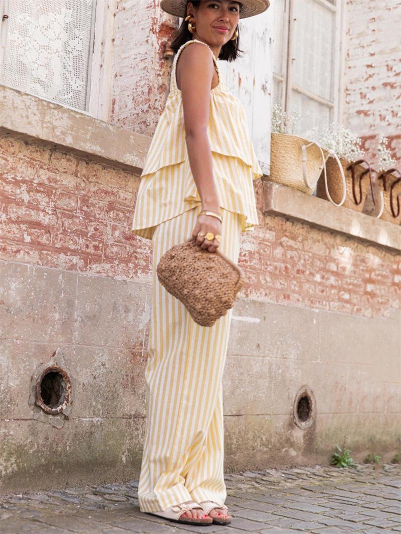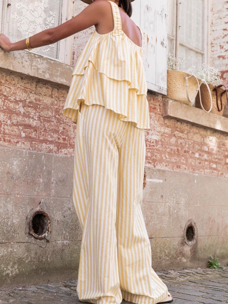 Verano 2024 Amazon Rayas Tirantes Volante Top Pantalón Traje Sexy Estilo Resort Conjunto de Dos Piezas