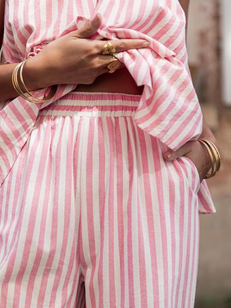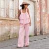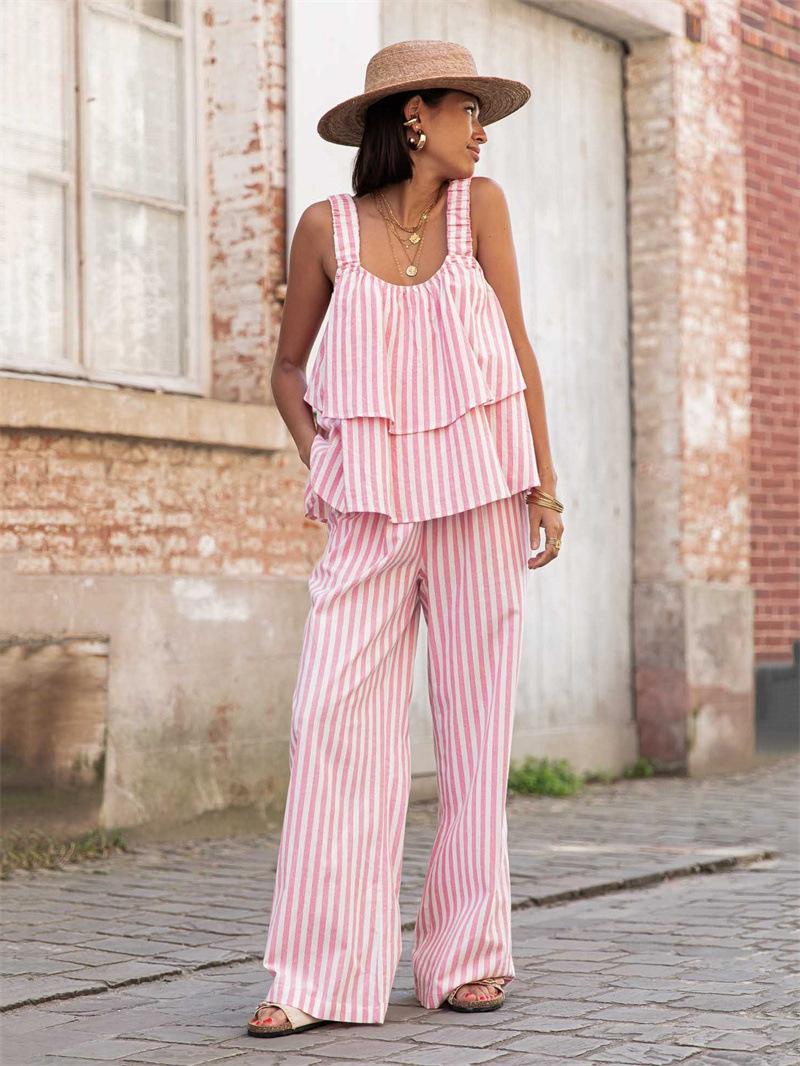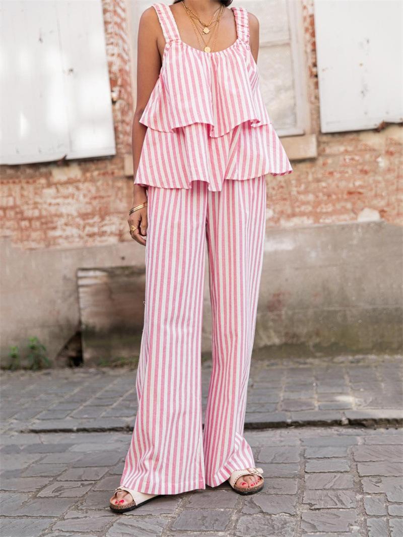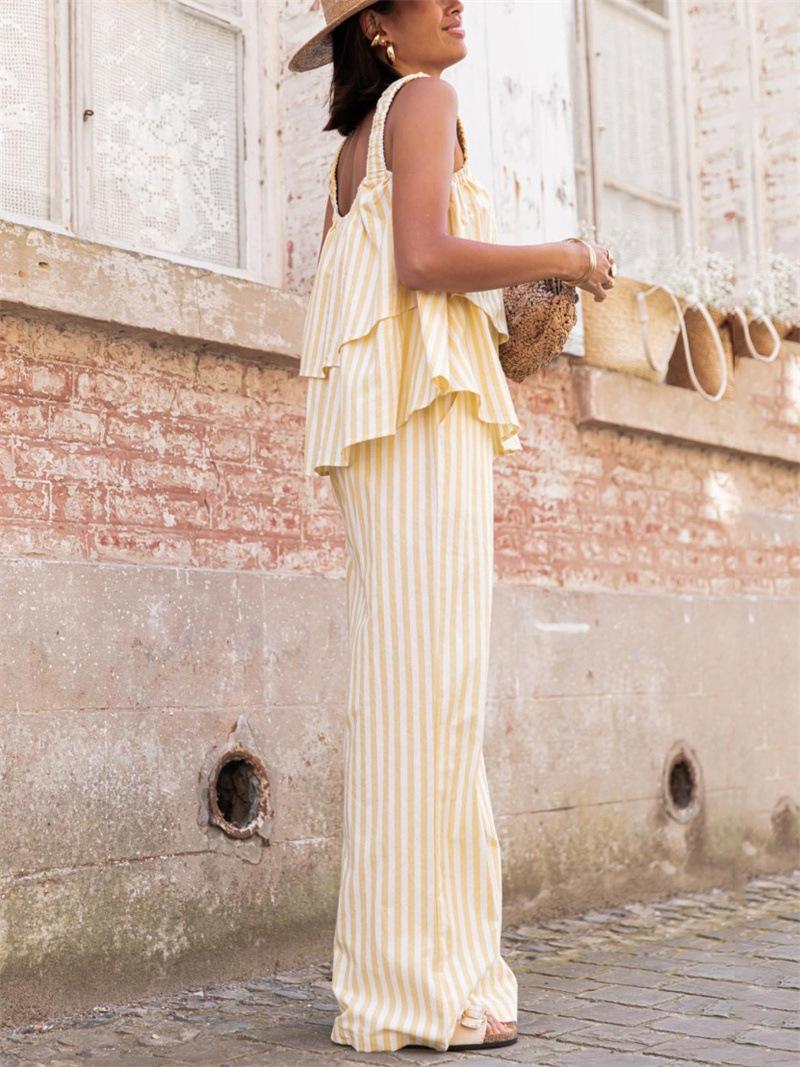 Verano 2024 Amazon Rayas Tirantes Volante Top Pantalón Traje Sexy Estilo Resort Conjunto de Dos Piezas