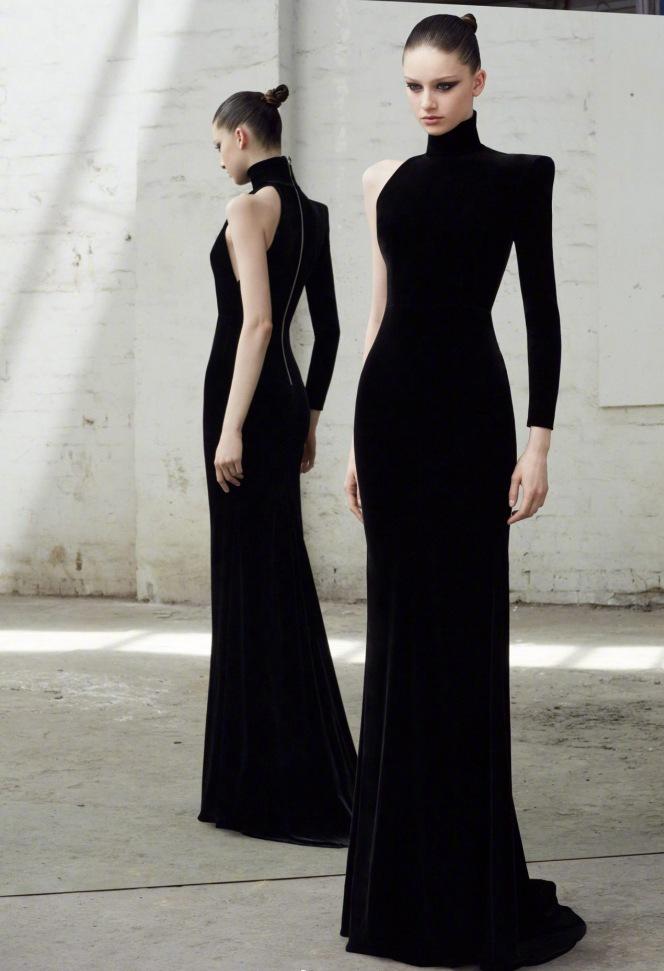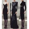 Desfile de Moda 2023: Vestido de noche ajustado con cola de pez, cuello alto, manga larga y un solo hombro, falda negra