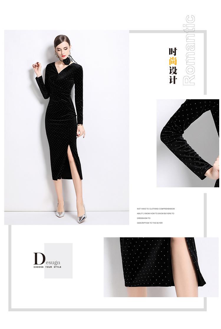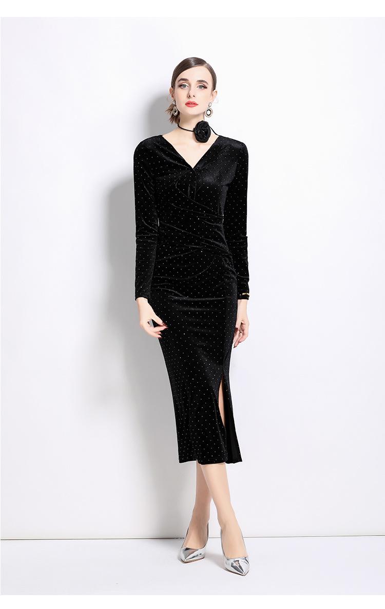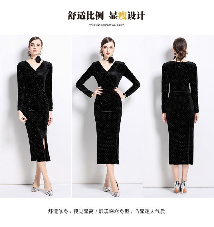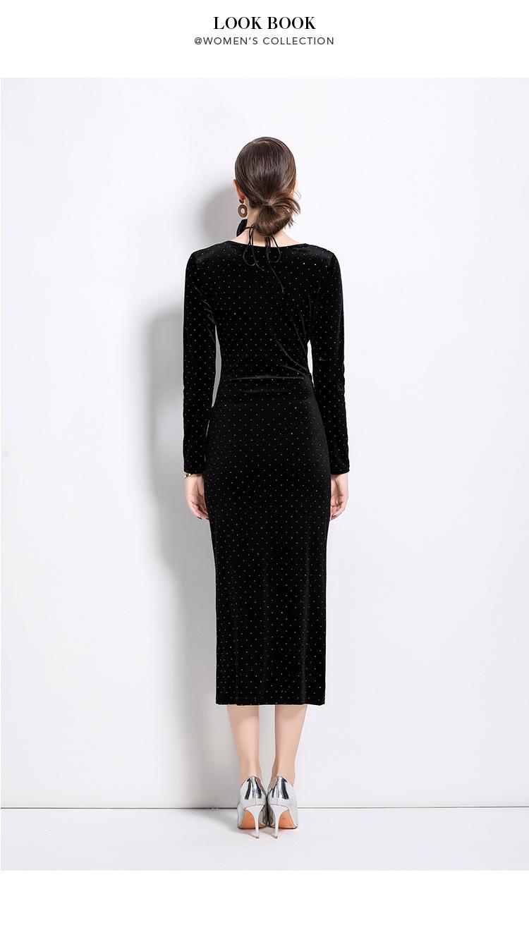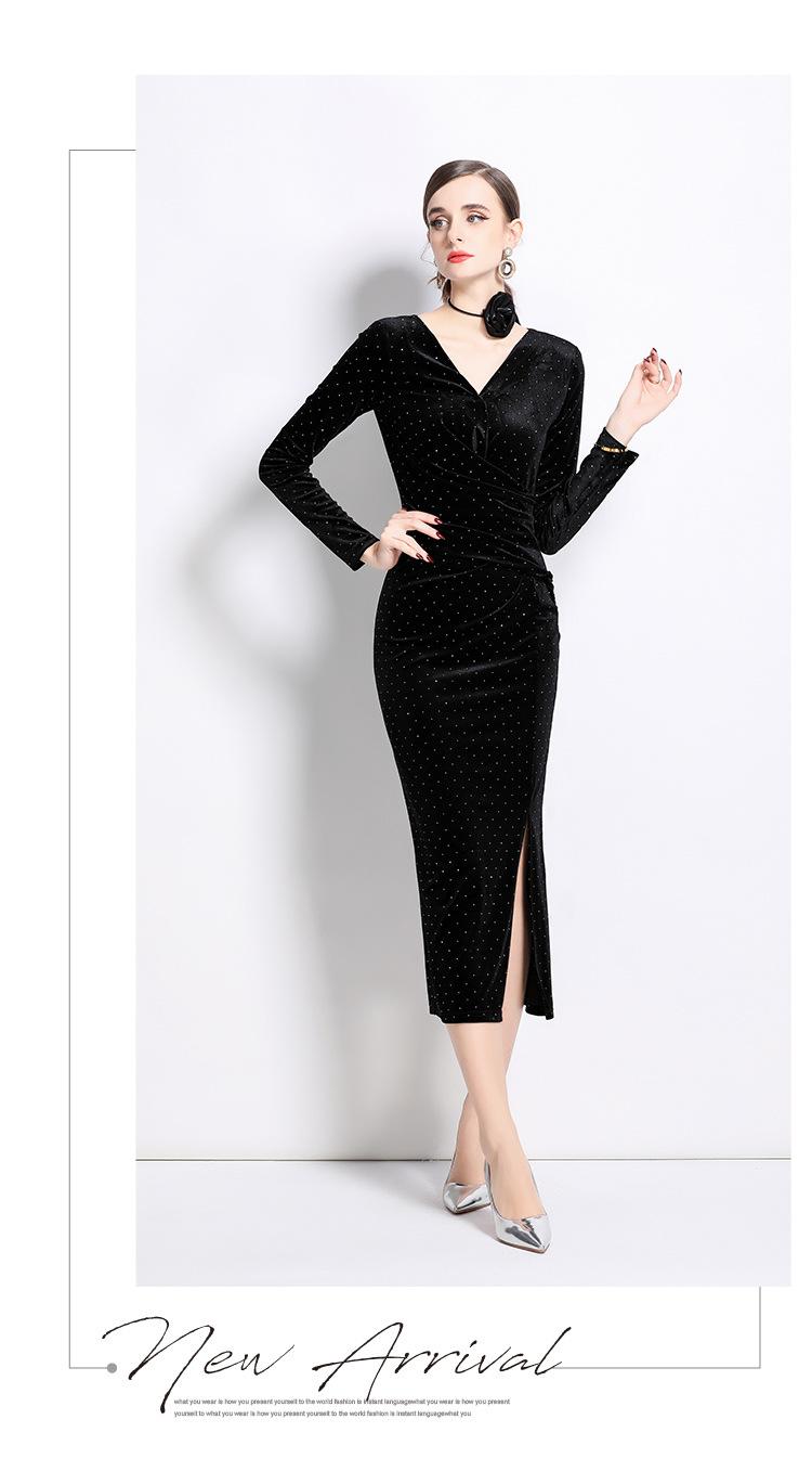 Vestido ajustado de terciopelo con escote en V francés y manga larga, estilo Hepburn, primavera y verano 2025