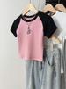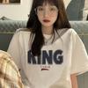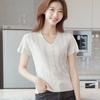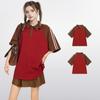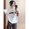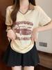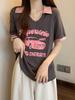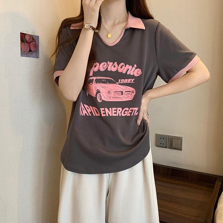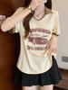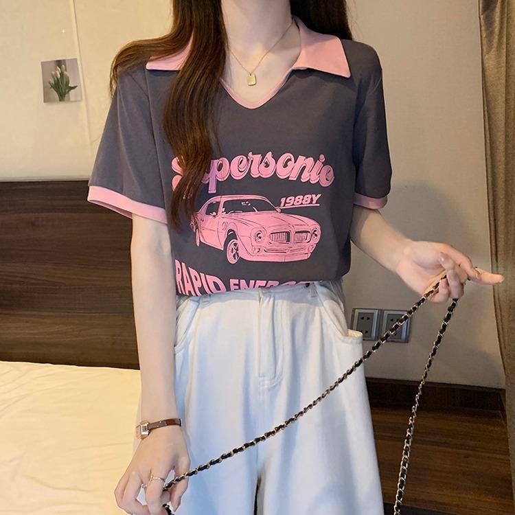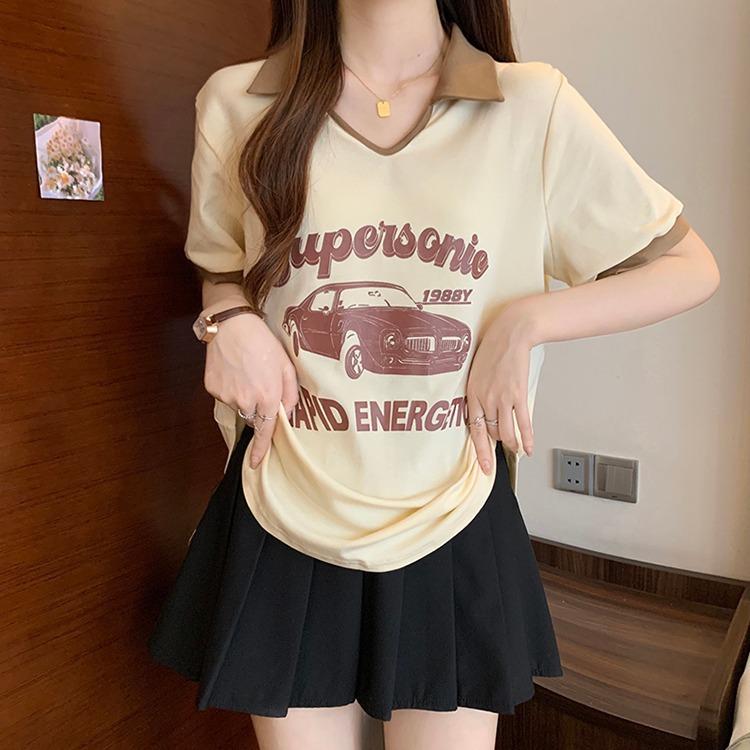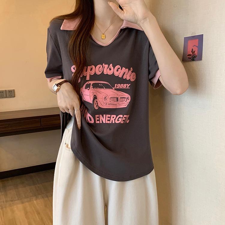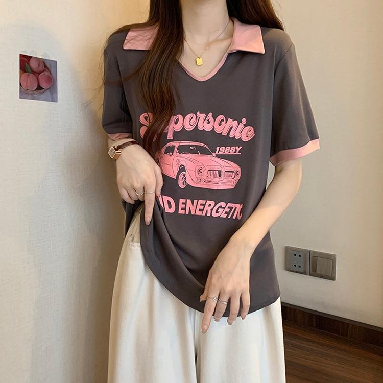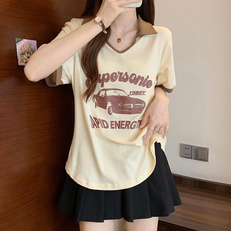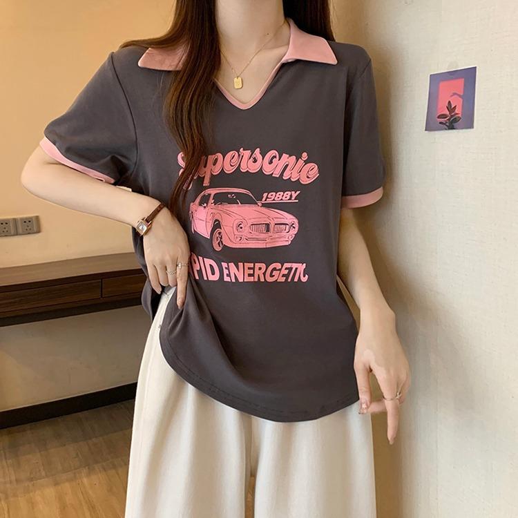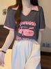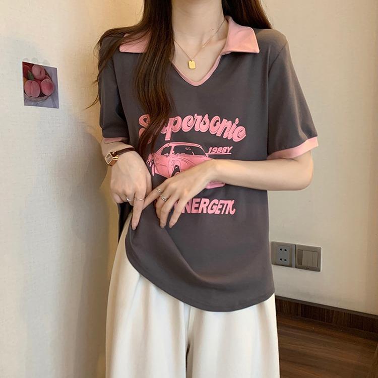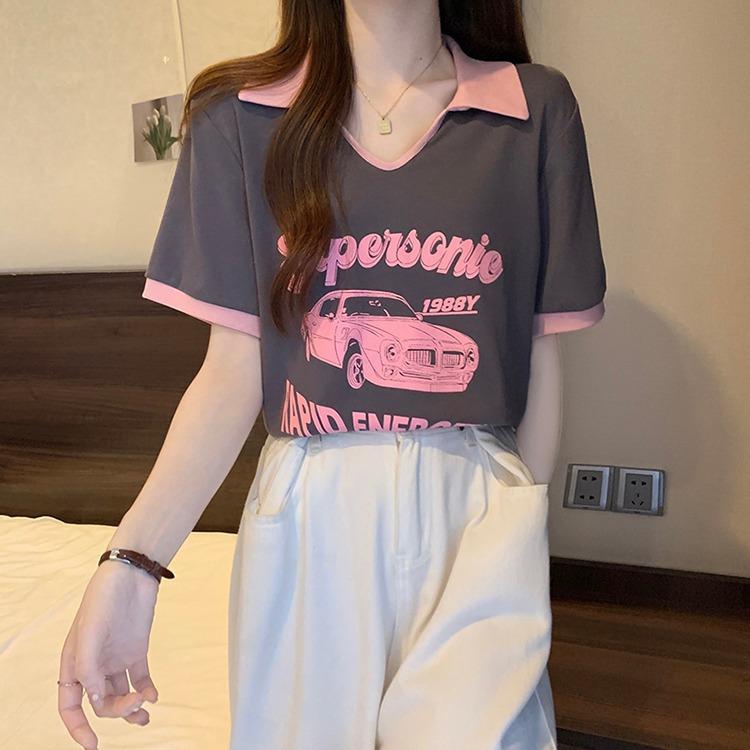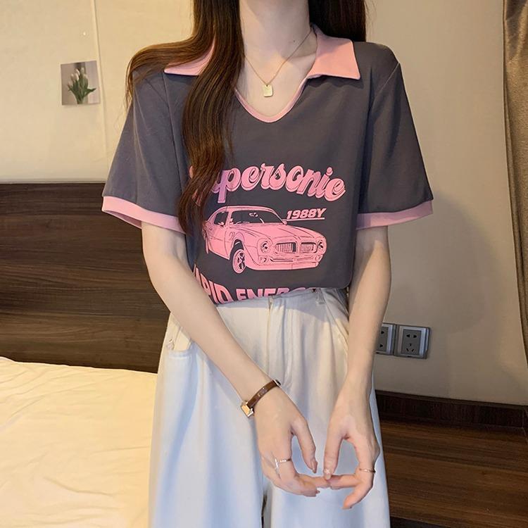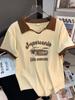 Camiseta de algodón de verano para mujer, diseño de nicho de manga corta, holgada, estilo americano, estilo retro, polo con hombros descubiertos y cuello en V.