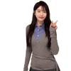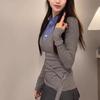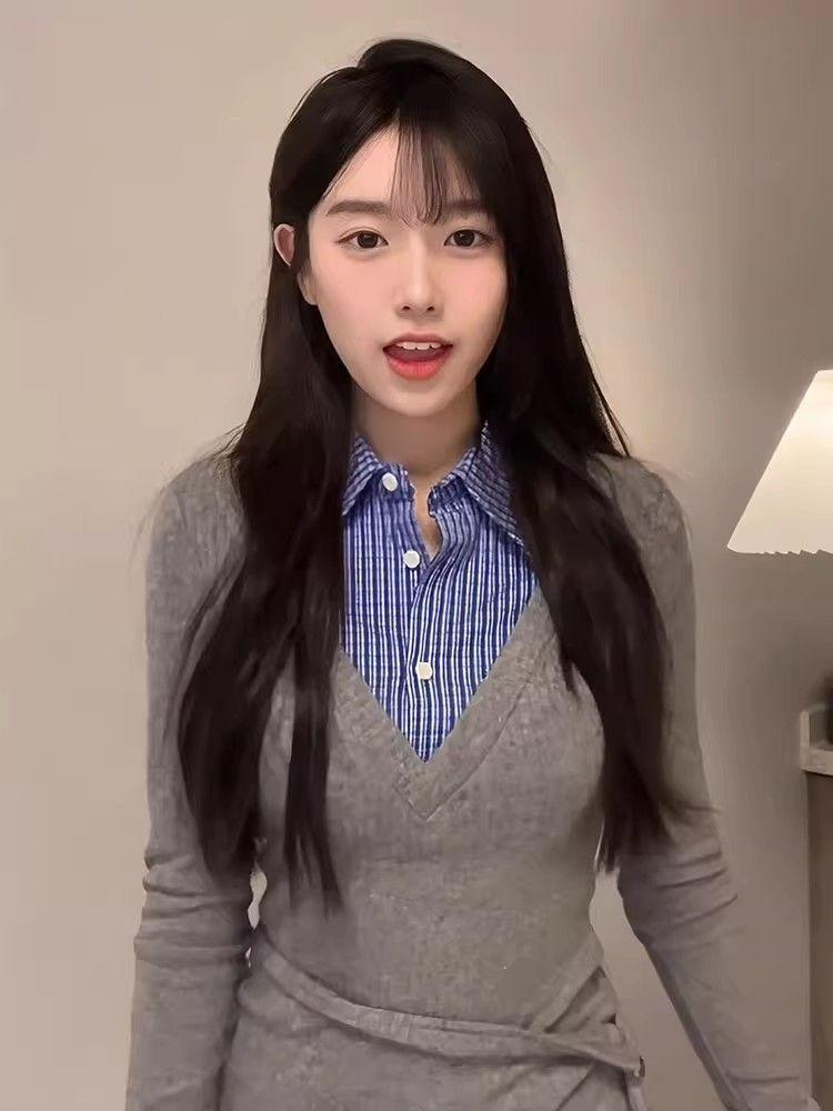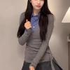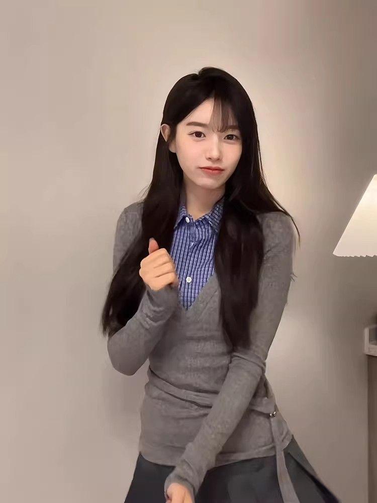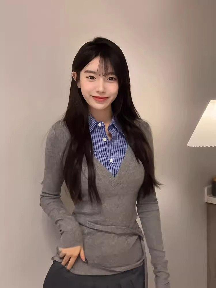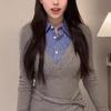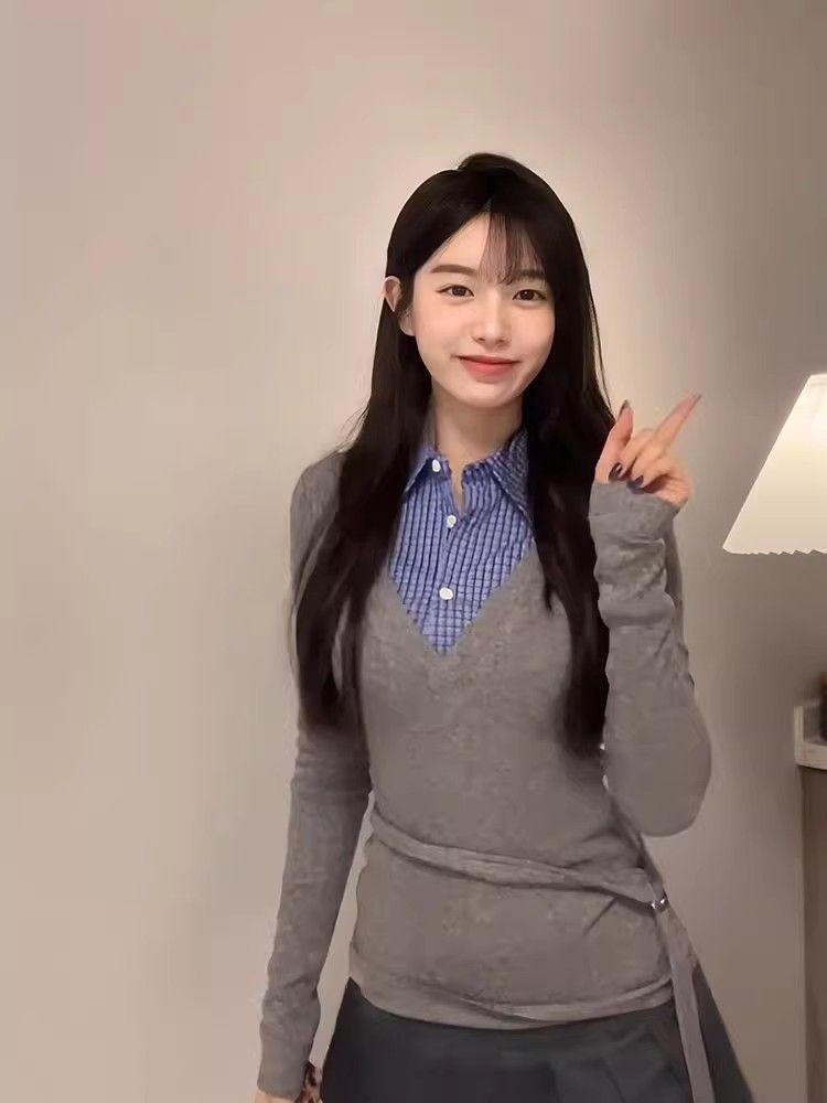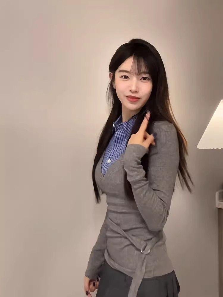 Estilo Universitario Coreano Top Gris Falso de Dos Piezas para Mujer Primavera y Otoño Nuevo Costuras en Color de Contraste Manga Larga Camiseta Base Interior Trendy