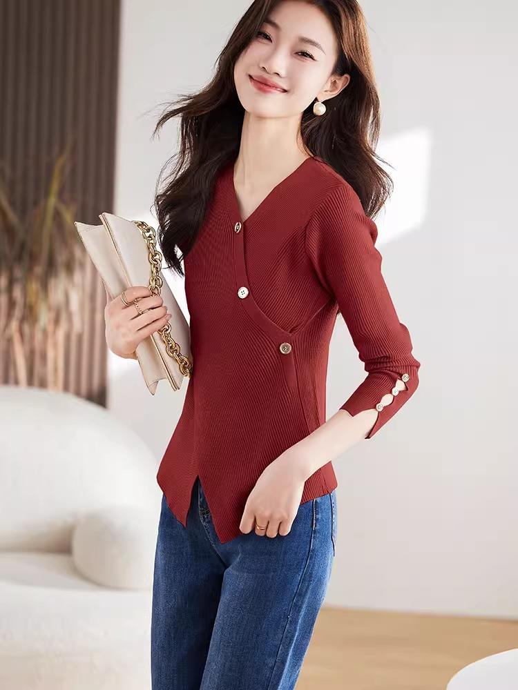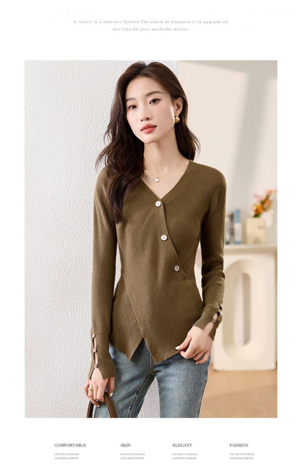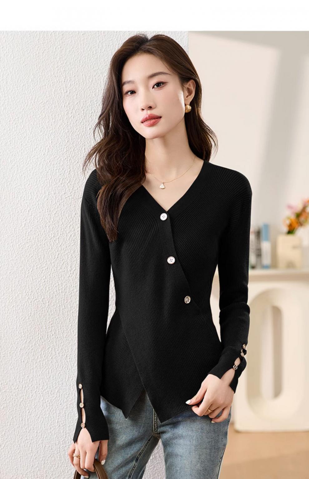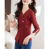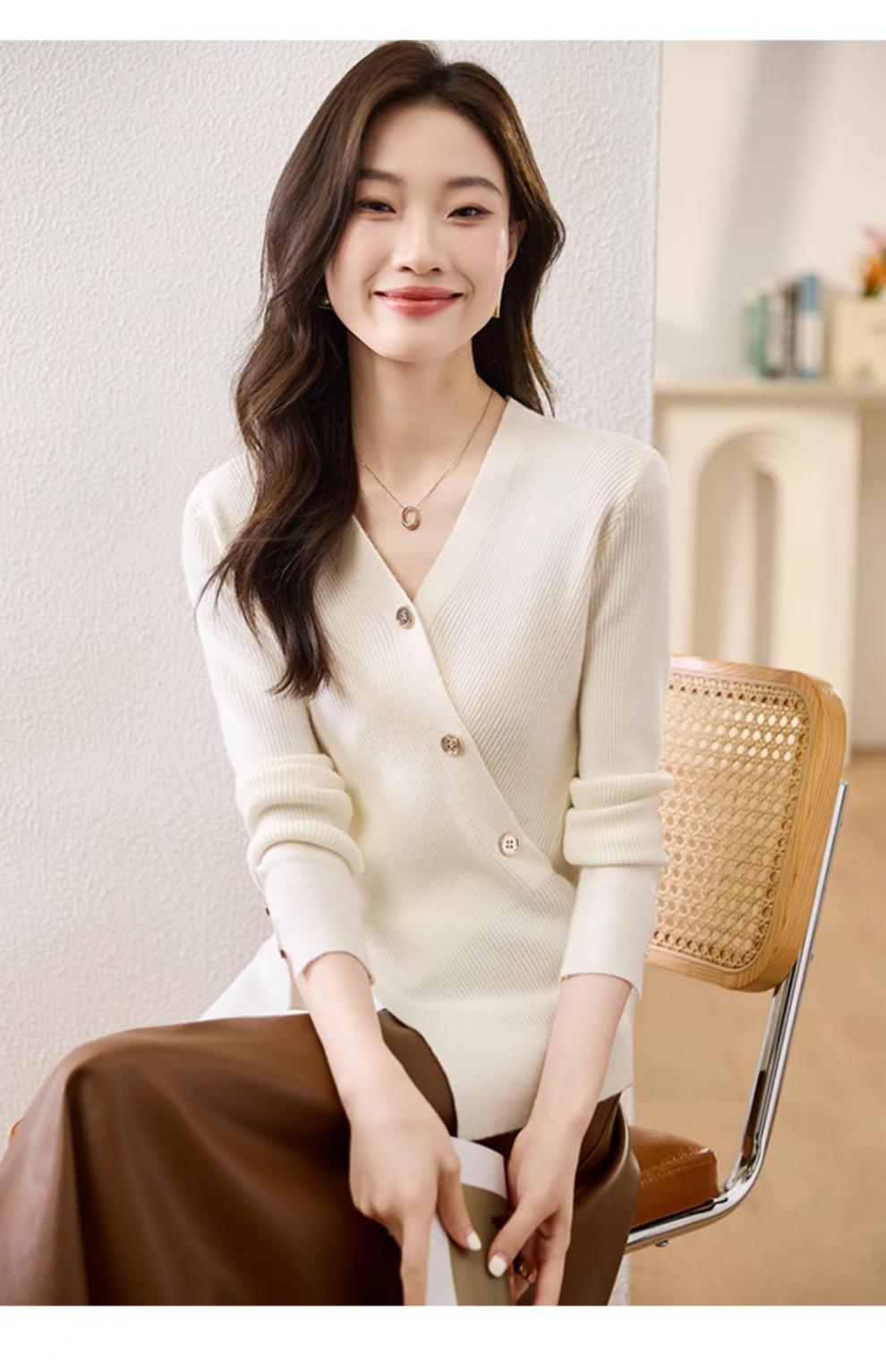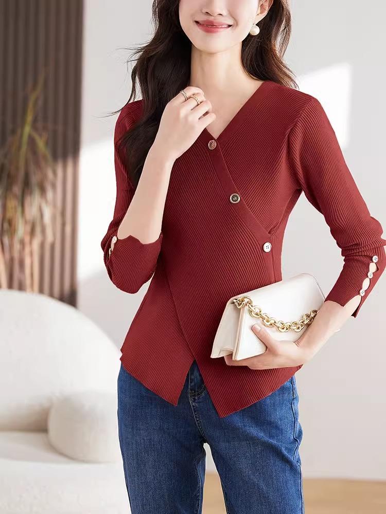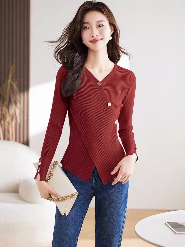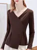 Primavera y otoño 2024: blusas asimétricas de manga larga con cuello en V para mujer, camisetas de punto con bajo y camisetas ajustadas.