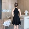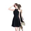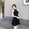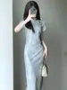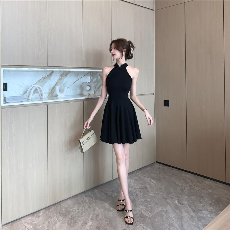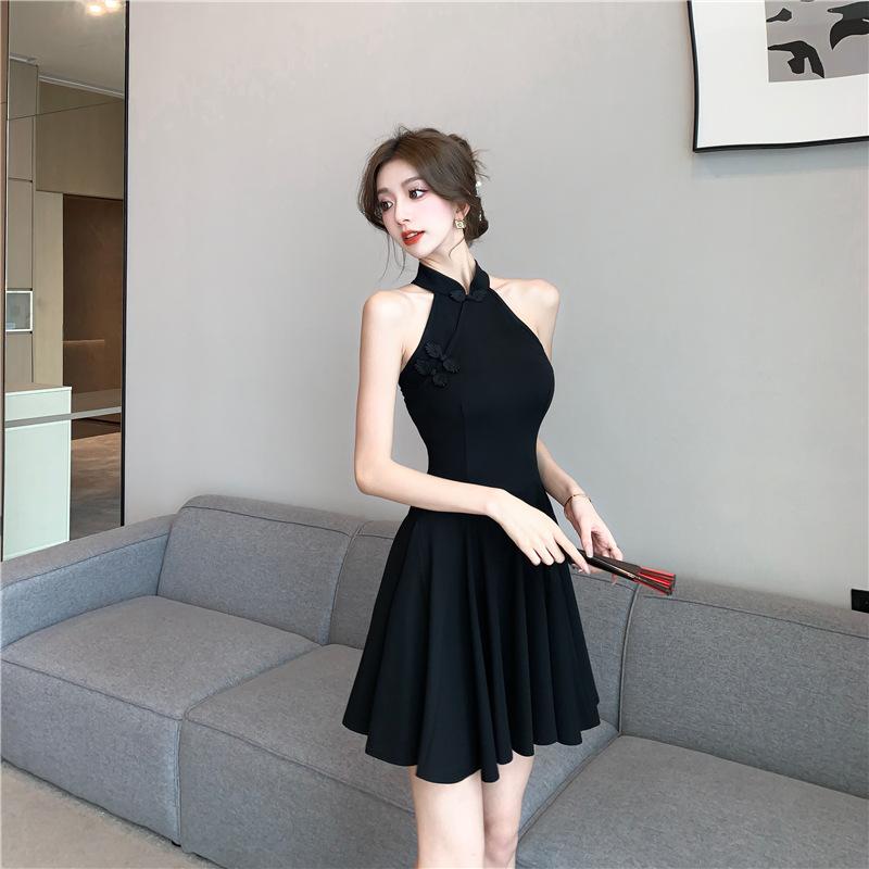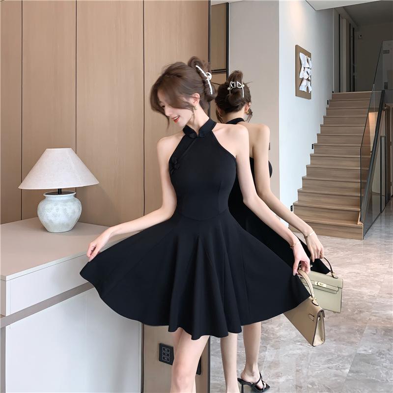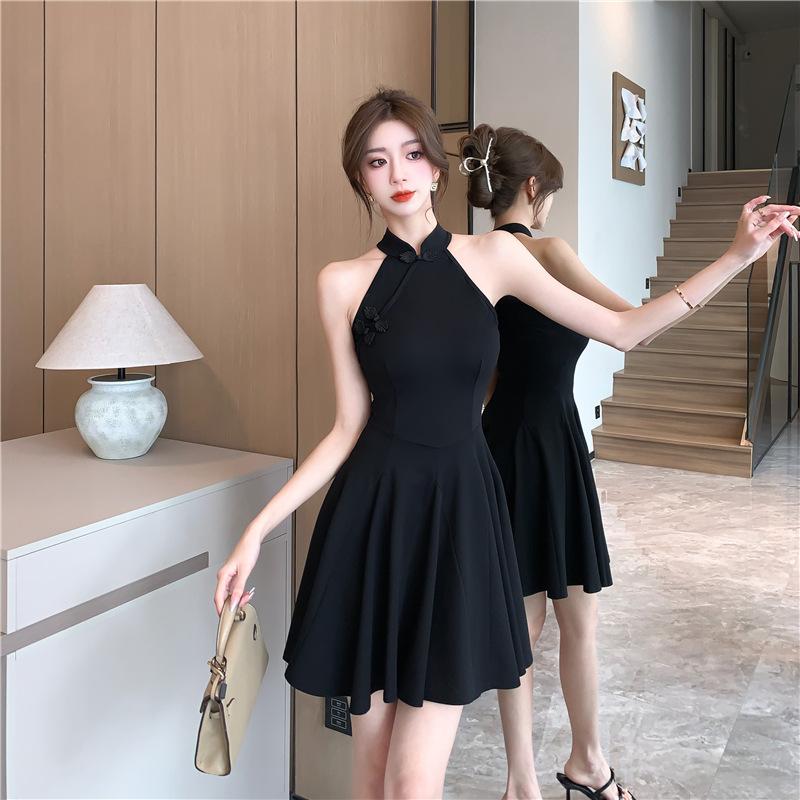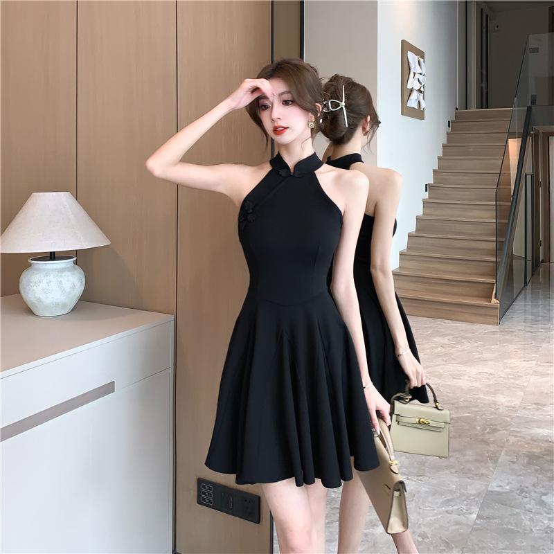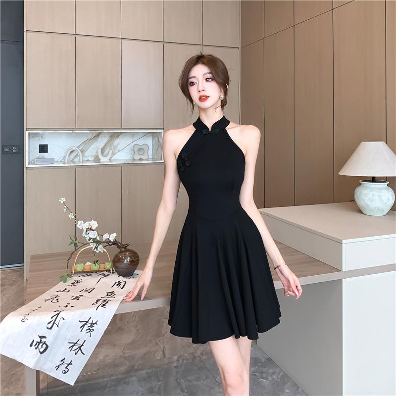 Vestido cheongsam negro oscuro, elegante, tridimensional, sin mangas, adelgazante, estilo chino, estilo nacional francés, cintura alta, amplio vuelo, 2025