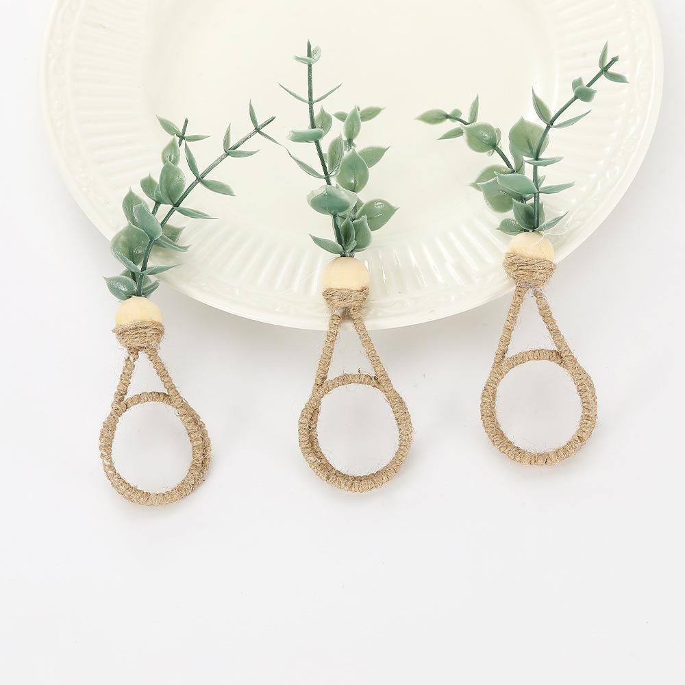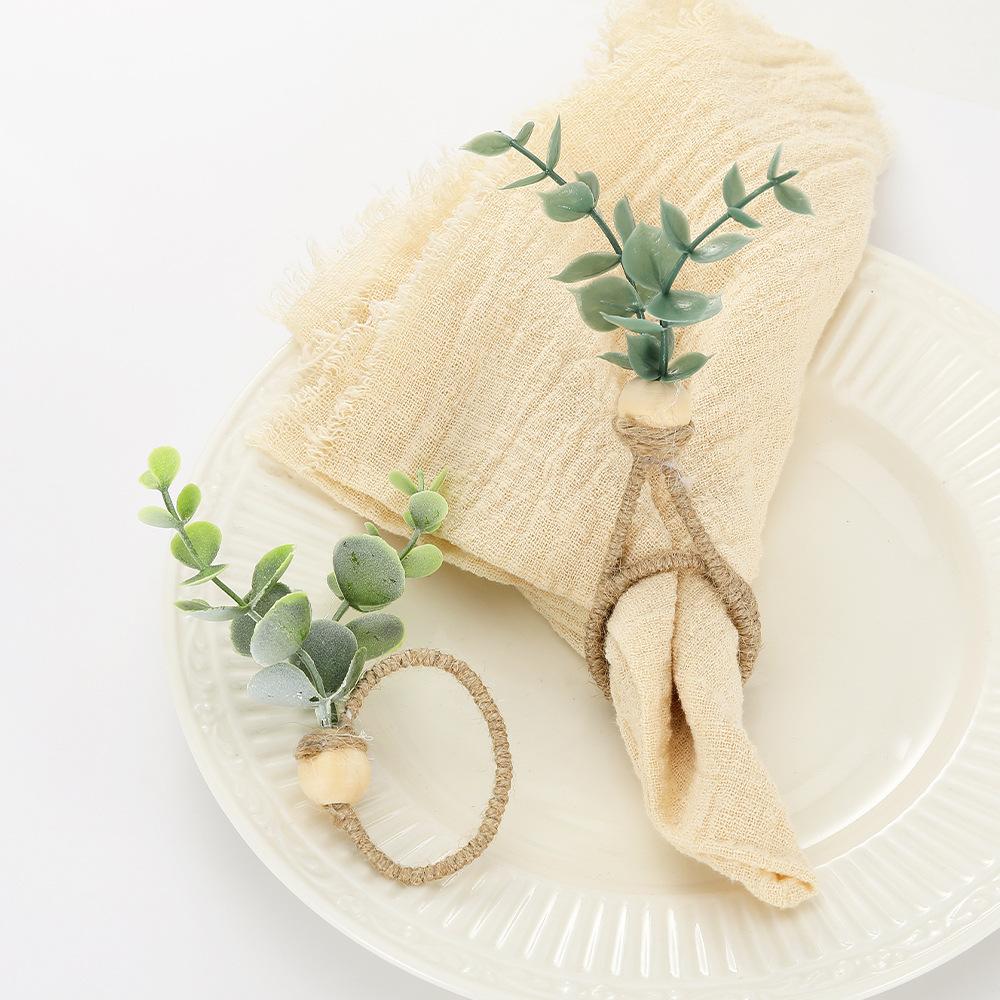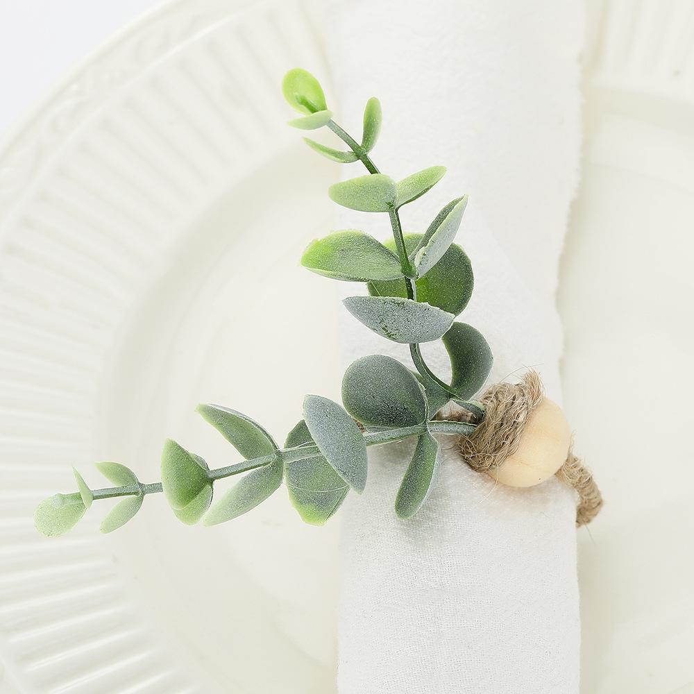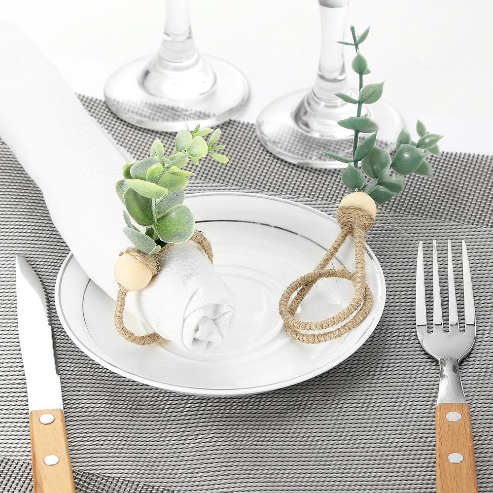 Hebilla de servilleta con forma de rama de eucalipto con simulación creativa, anillo de servilleta ecológico para hotel, anillo de tela para la boca con cuerda de cáñamo y vino tinto, fabricantes al por mayor