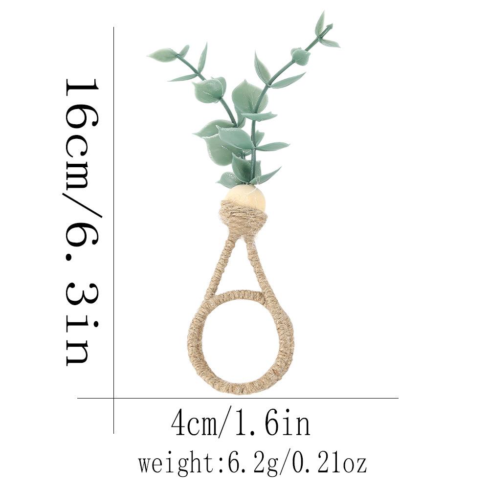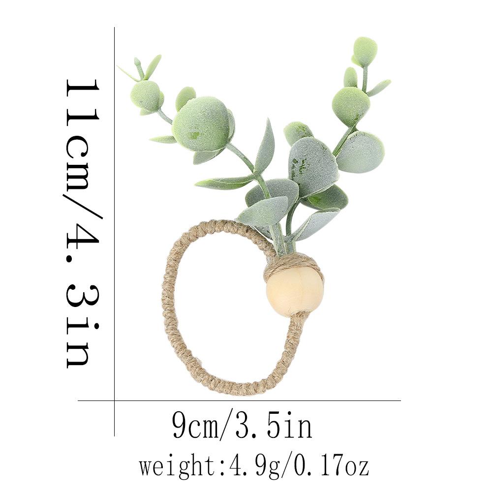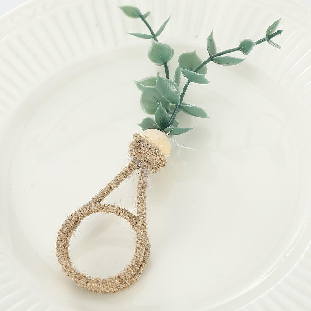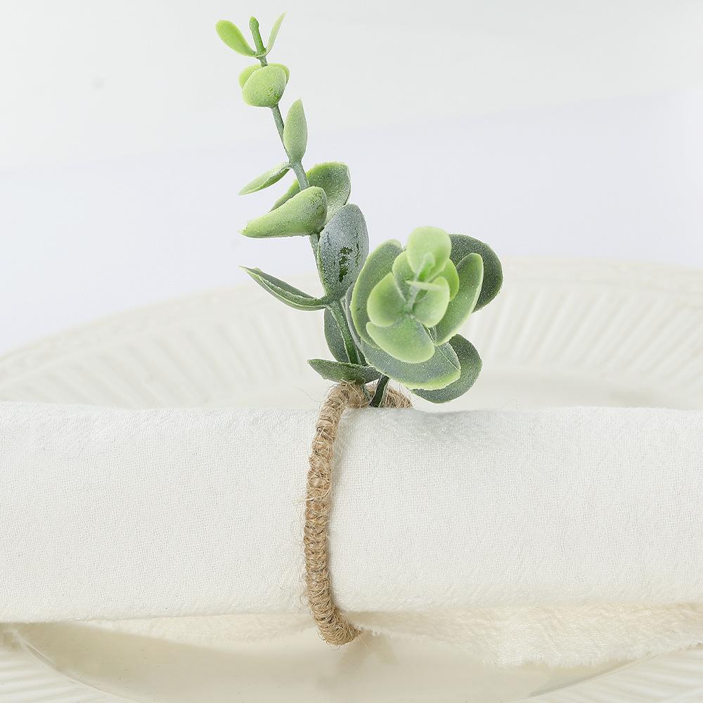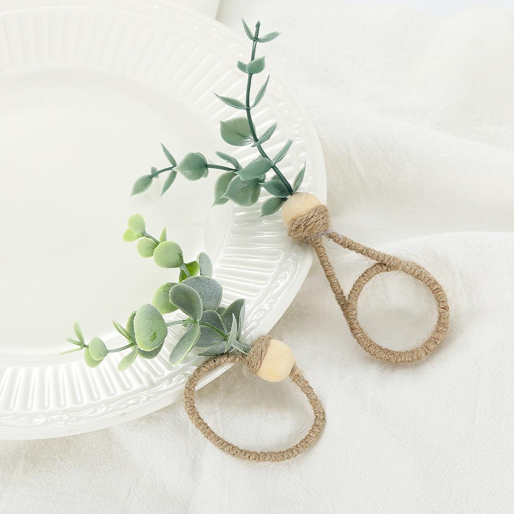 Hebilla de servilleta con forma de rama de eucalipto con simulación creativa, anillo de servilleta ecológico para hotel, anillo de tela para la boca con cuerda de cáñamo y vino tinto, fabricantes al por mayor