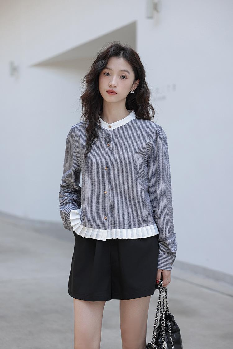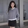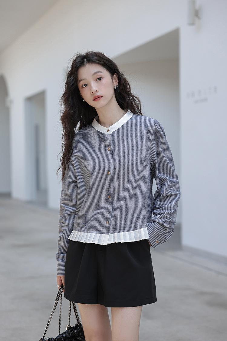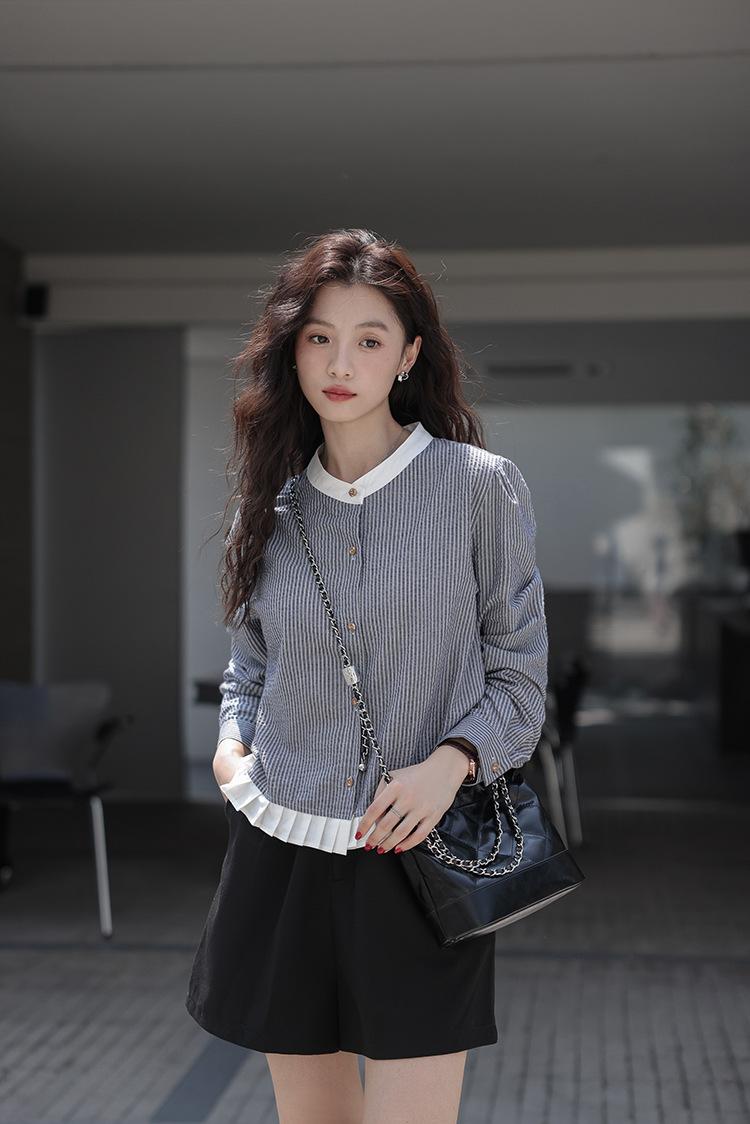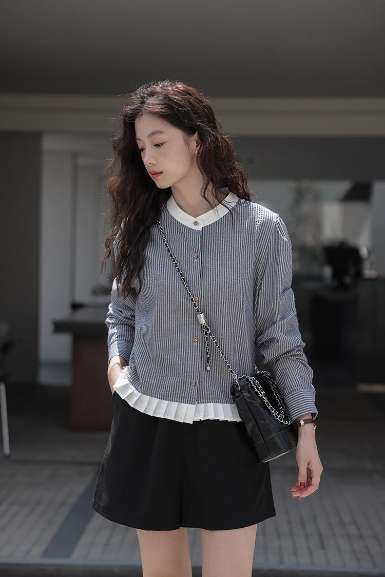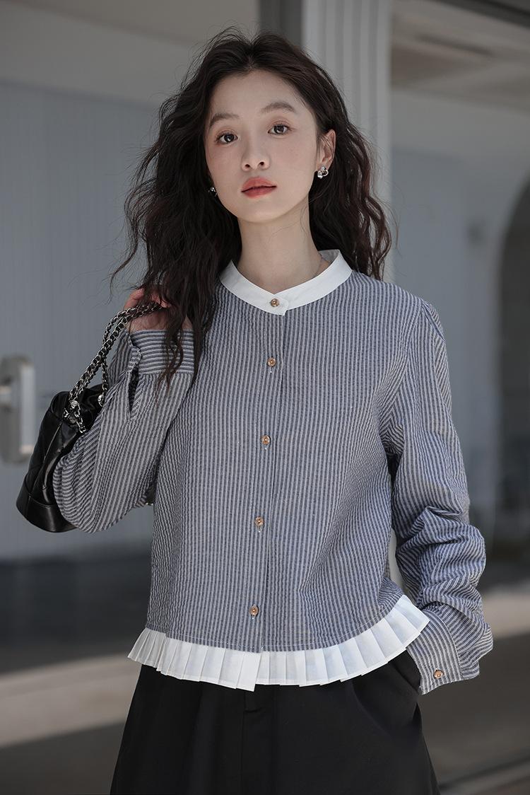 Camisa de manga larga a rayas para mujer, estilo coreano, elegante, de moda, con cuello redondo y diseño de dos piezas a juego, estilo falso, otoño 2024