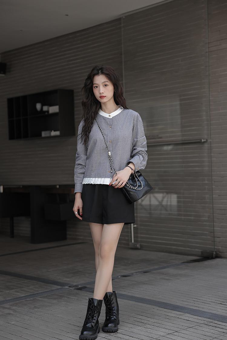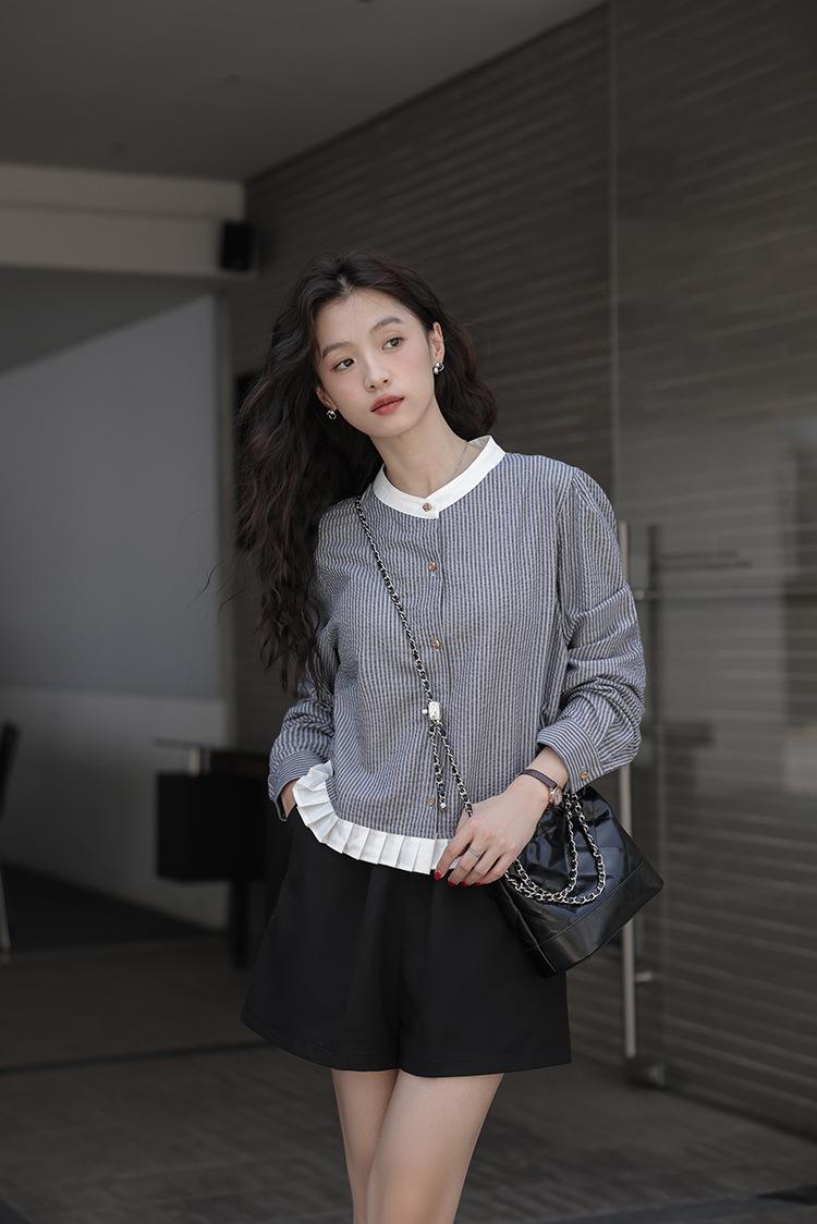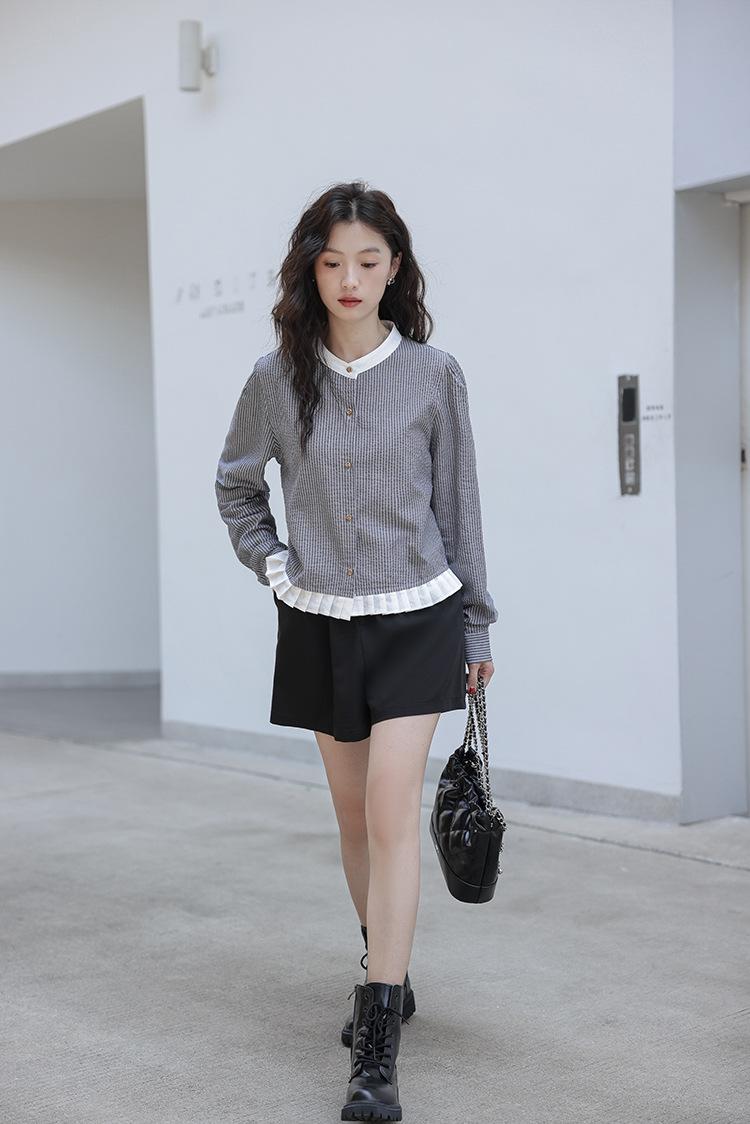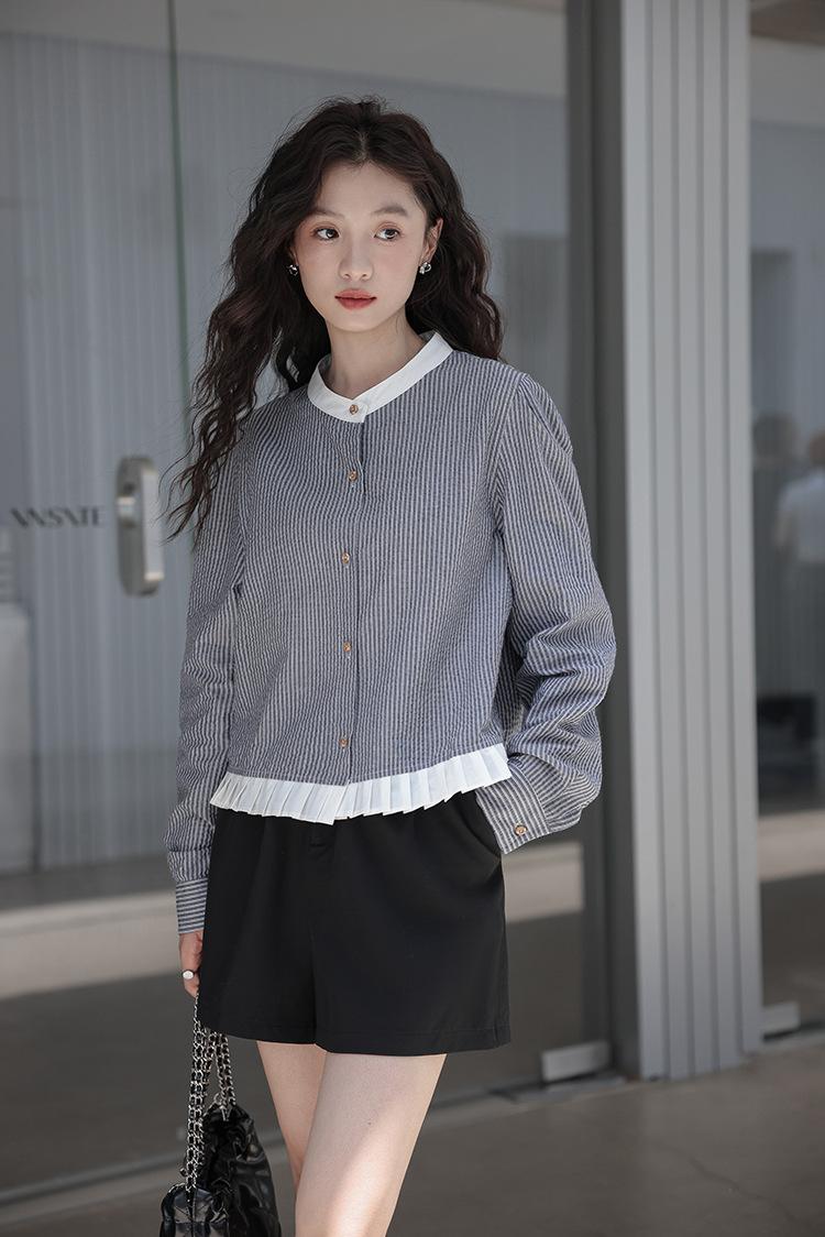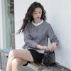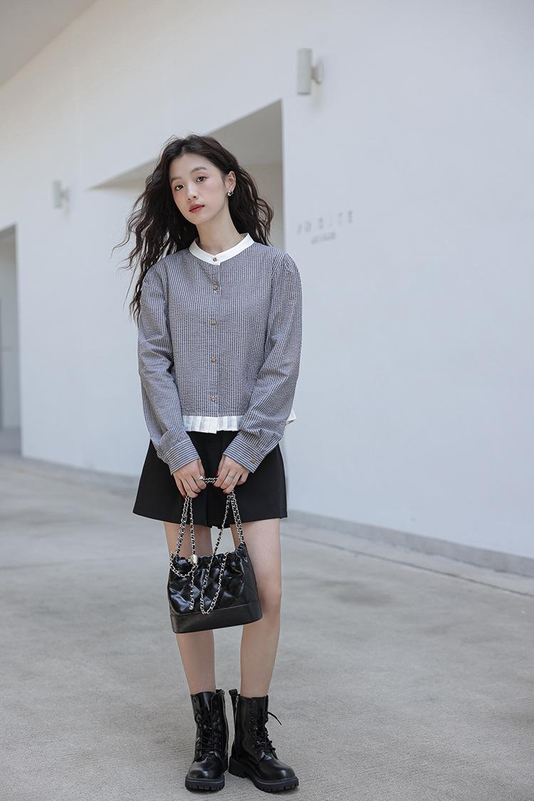Camisa de manga larga a rayas para mujer, estilo coreano, elegante, de moda, con cuello redondo y diseño de dos piezas a juego, estilo falso, otoño 2024