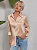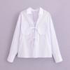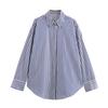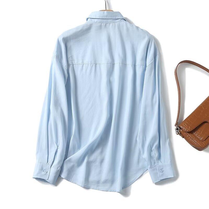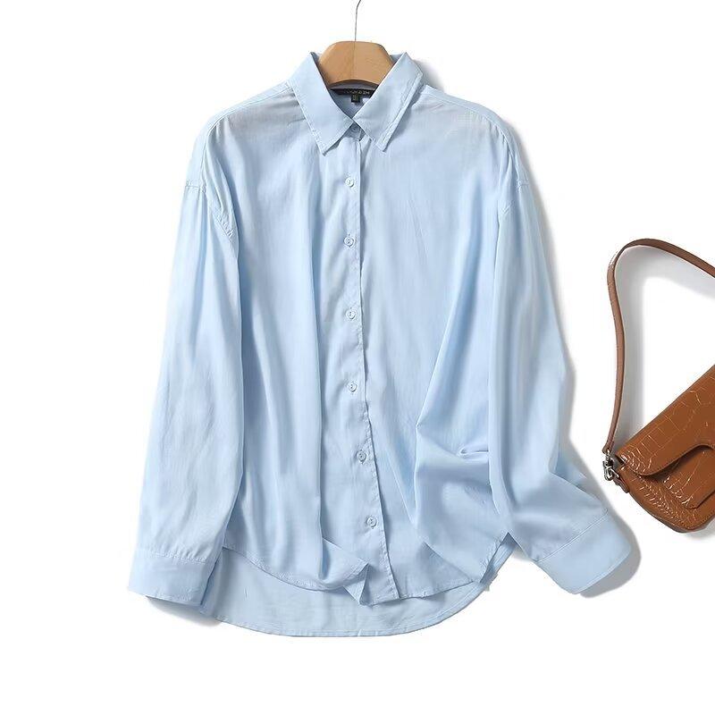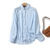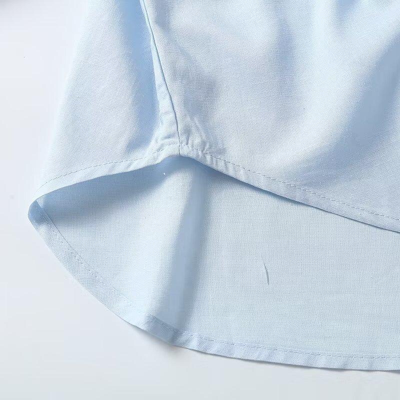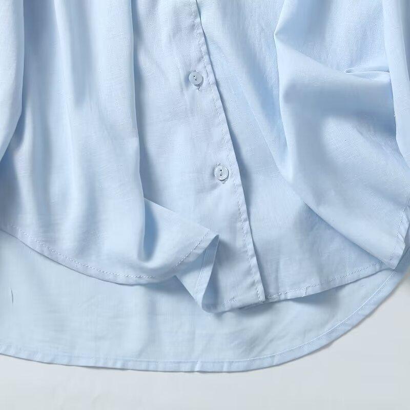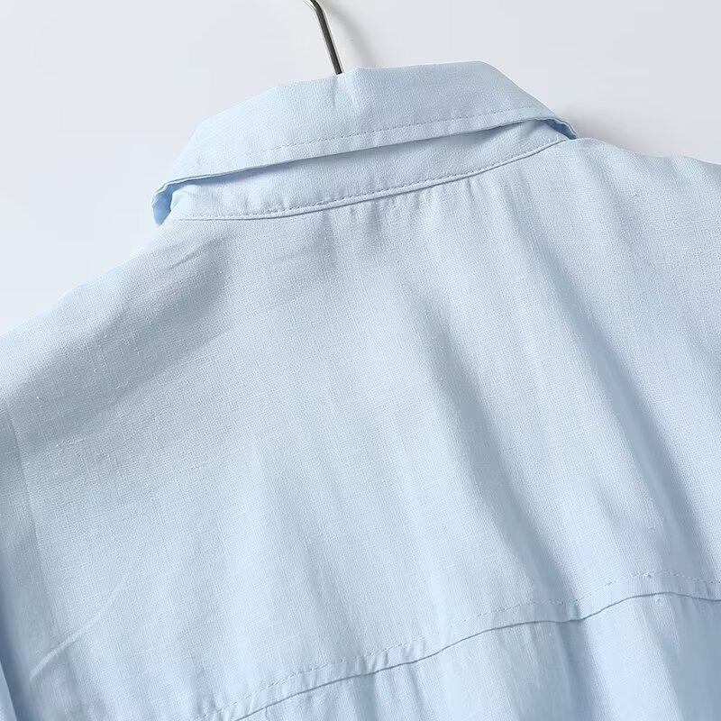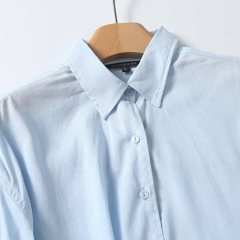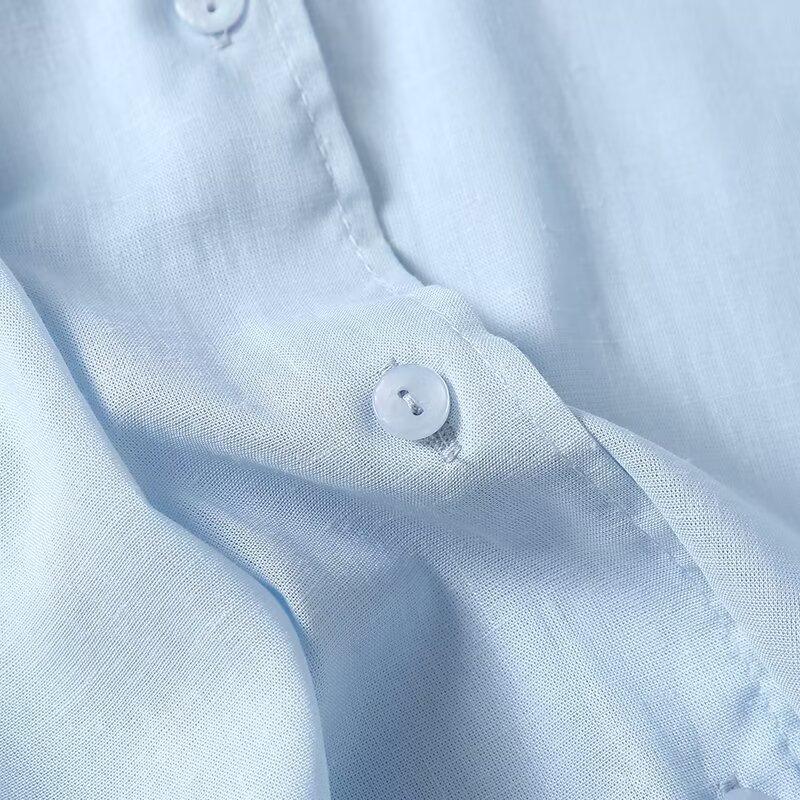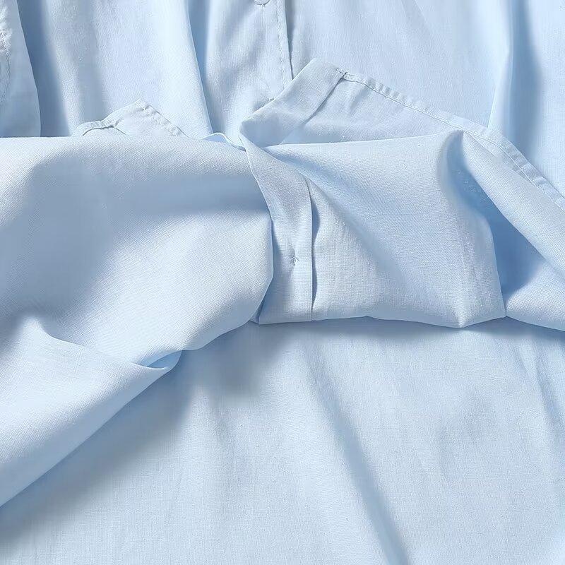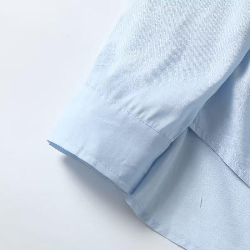 Camisa de manga larga de lino informal sencilla de color azul claro sólido con solapa estilo viajero transfronterizo europeo y americano para mujer, primavera 2024