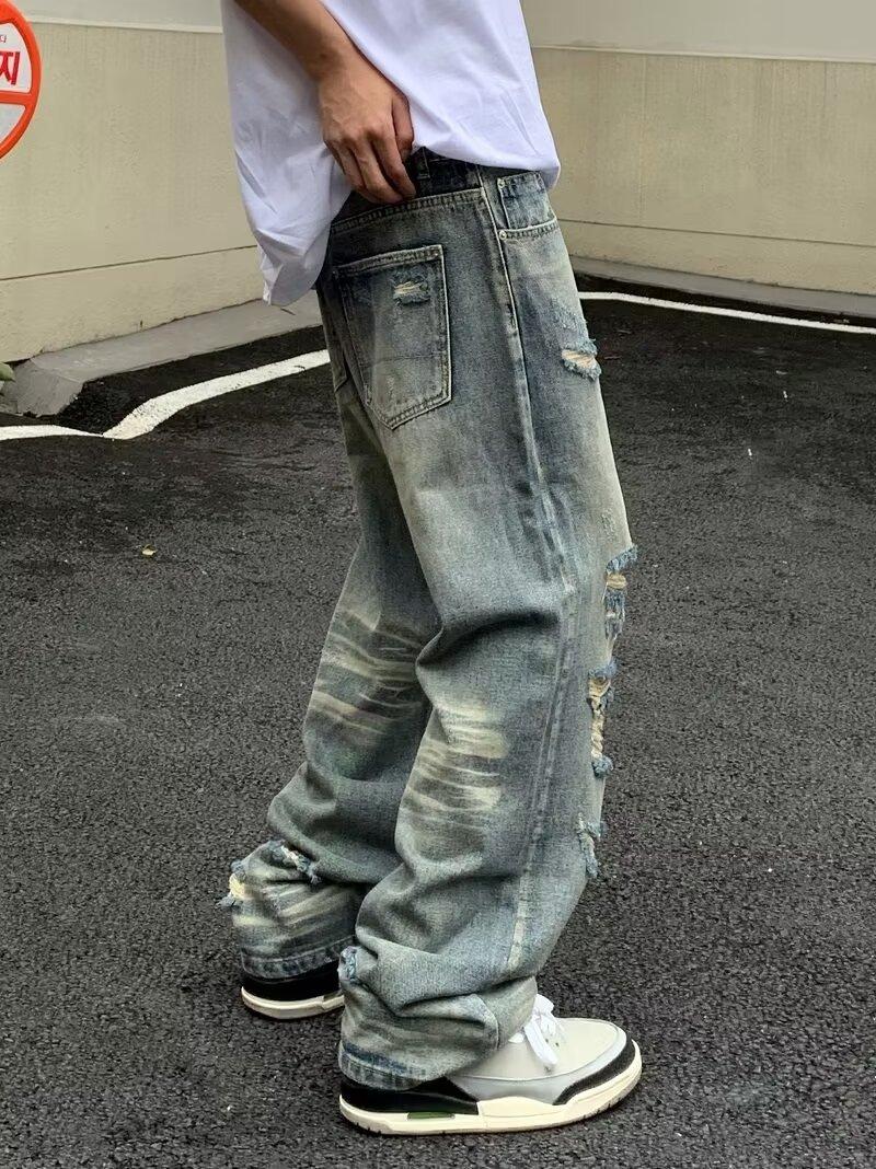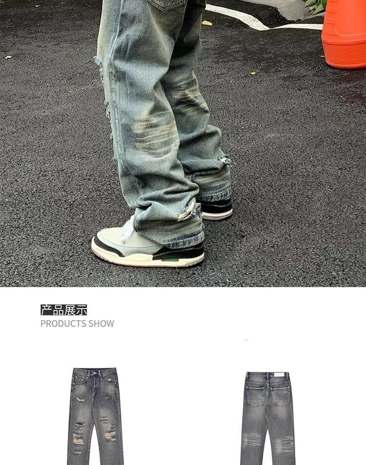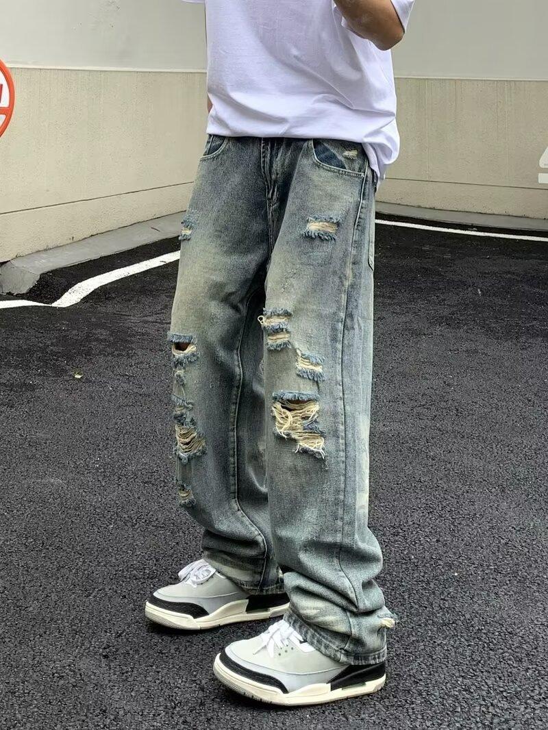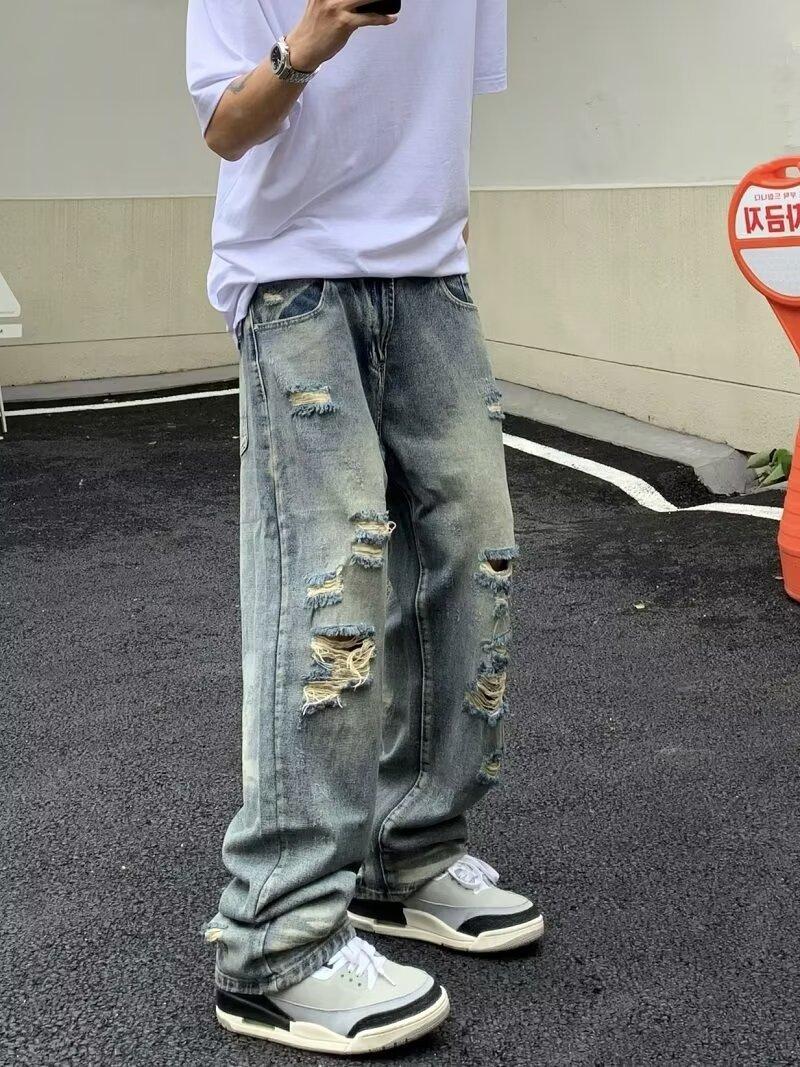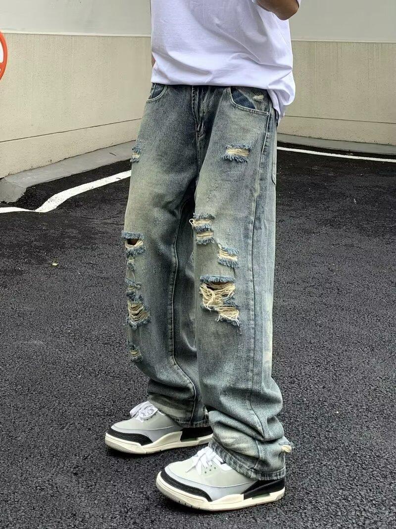 Compra Pantalones vaqueros rotos para hombre, primavera y otoño, verano, finos, estilo americano, retro, de marca, de calle, holgados, rectos, informales, largos al por mayor en Joom.pro