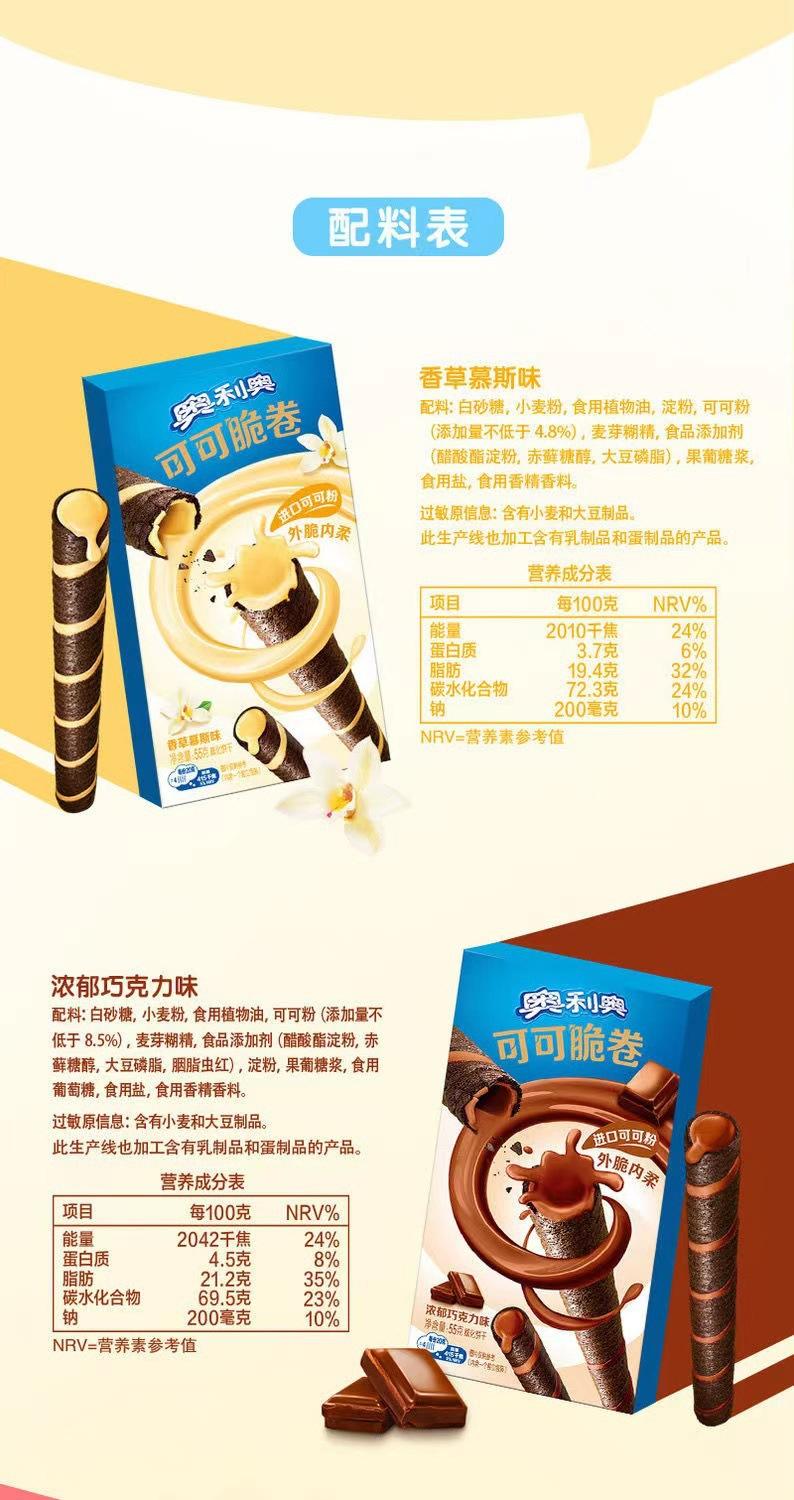 Resolver los problemas posventa del consumidor de manera oportuna. Responder preguntas con entusiasmo. Tomar el servicio como fundamento. Sobrevivir con integridad. Los rollos de cacao Oreo vienen empacados en 24 cajas. El contenido neto por caja es de 50g