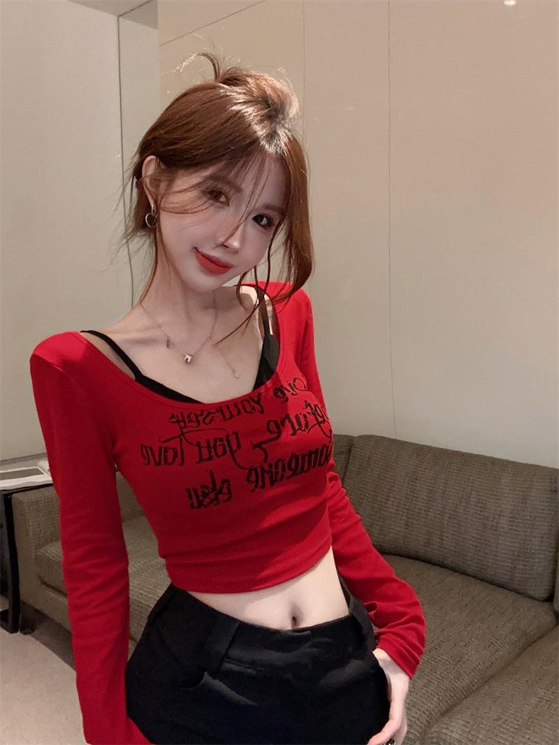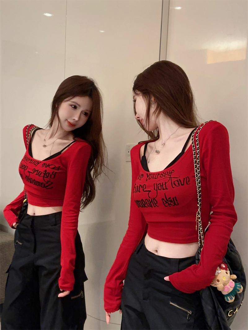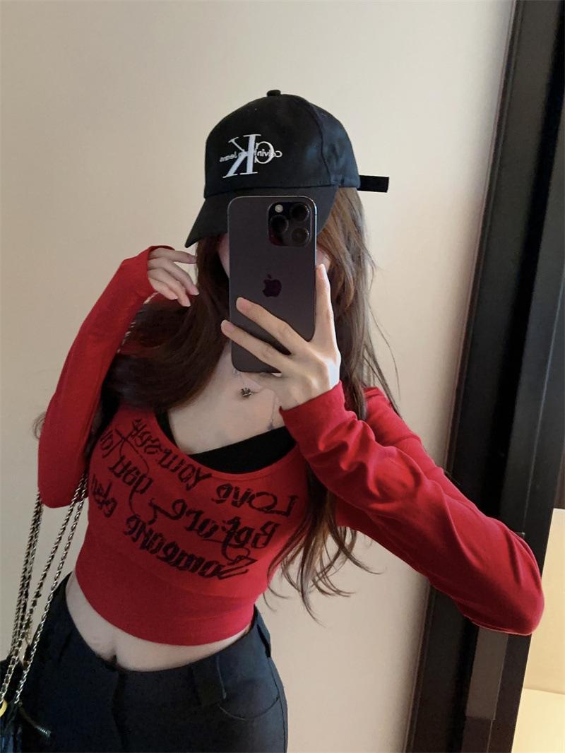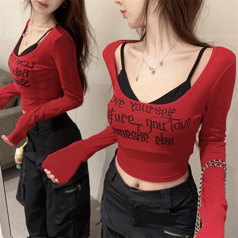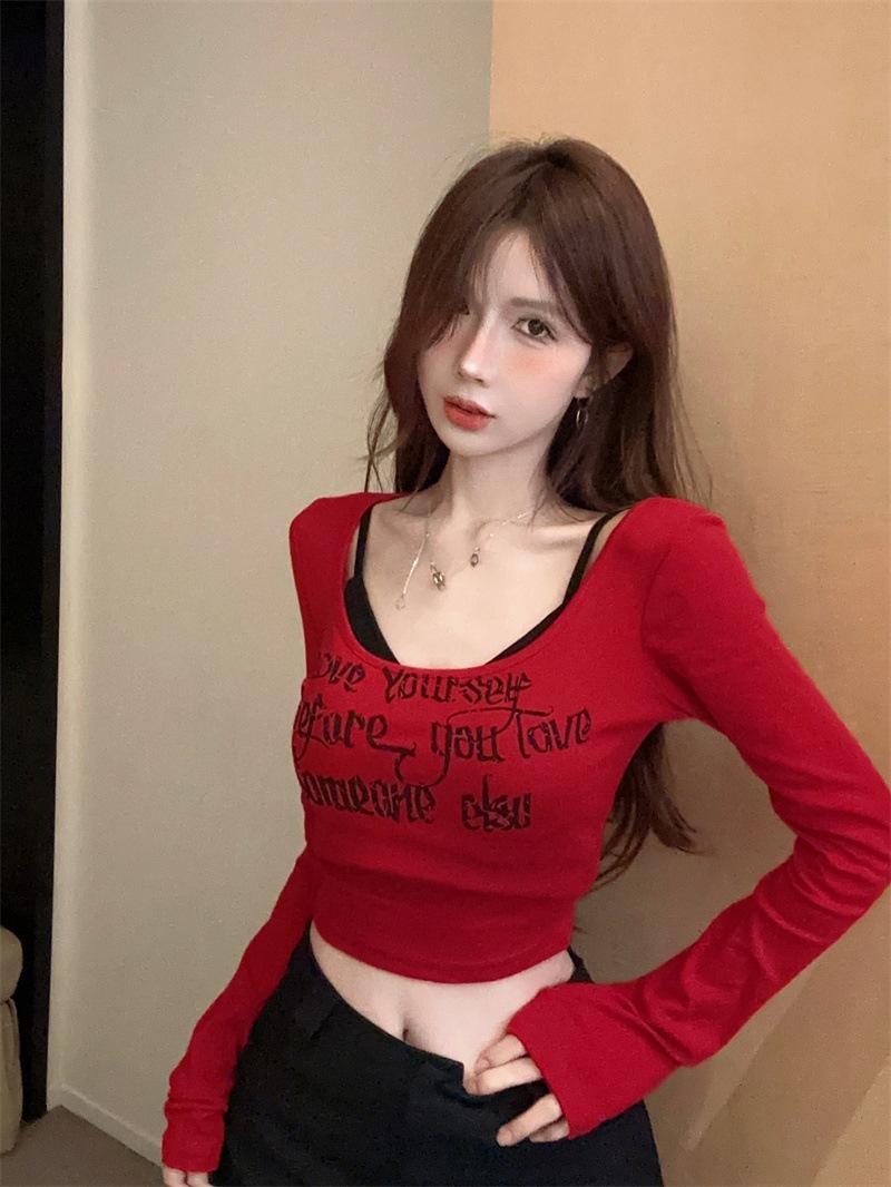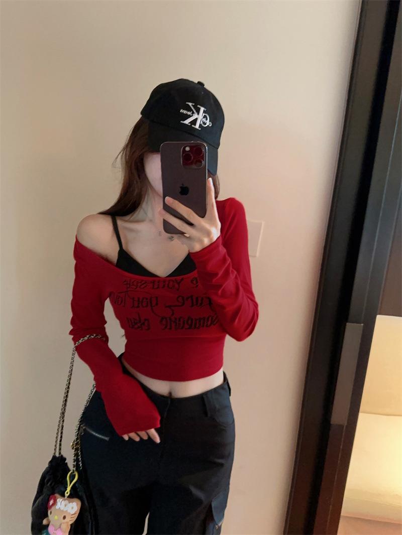 Camiseta de manga larga roja americana de otoño para mujer, sexy, con hombros descubiertos, estilo Spice Girl, ajustada, con cuello en U.