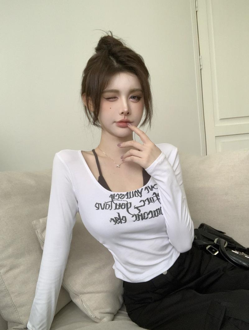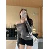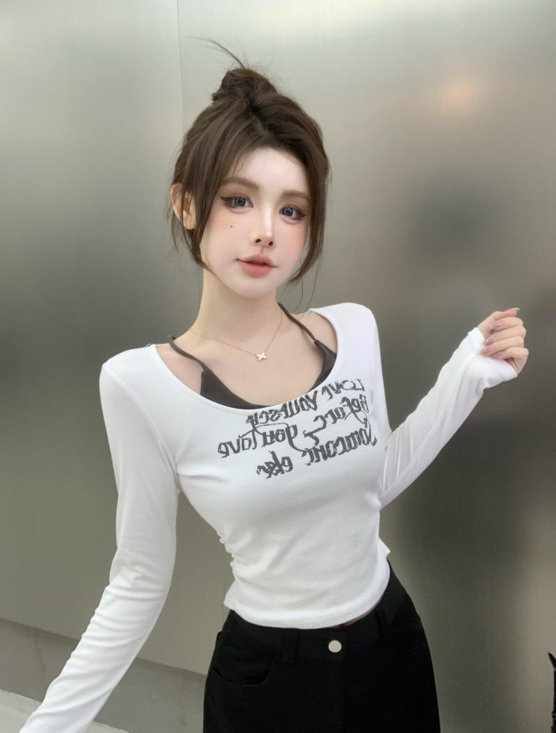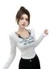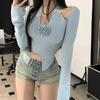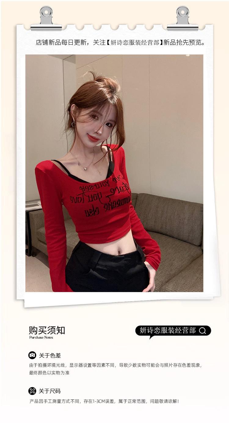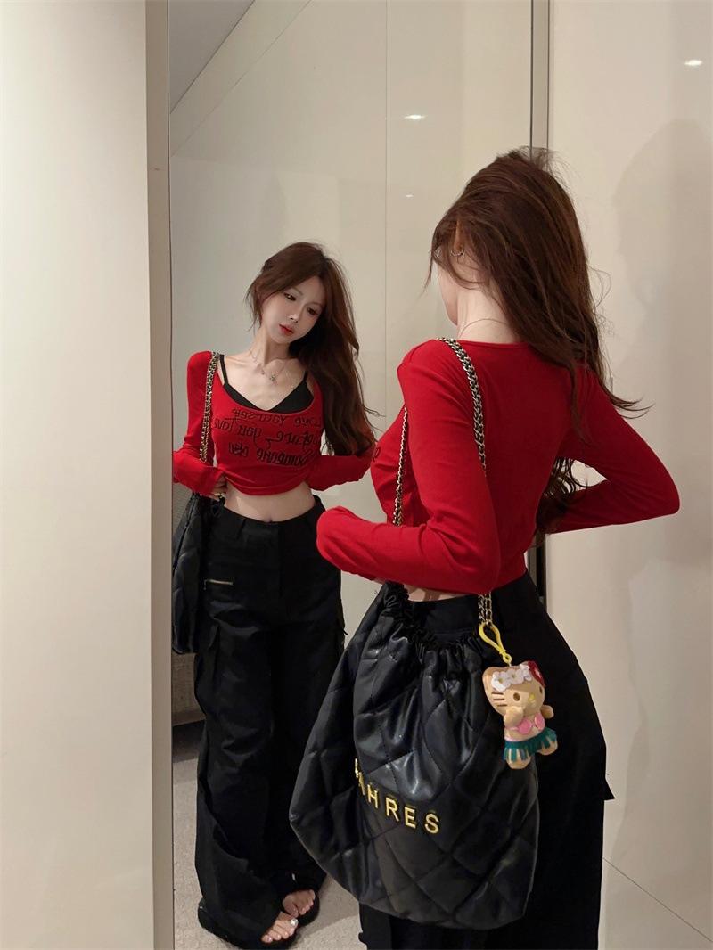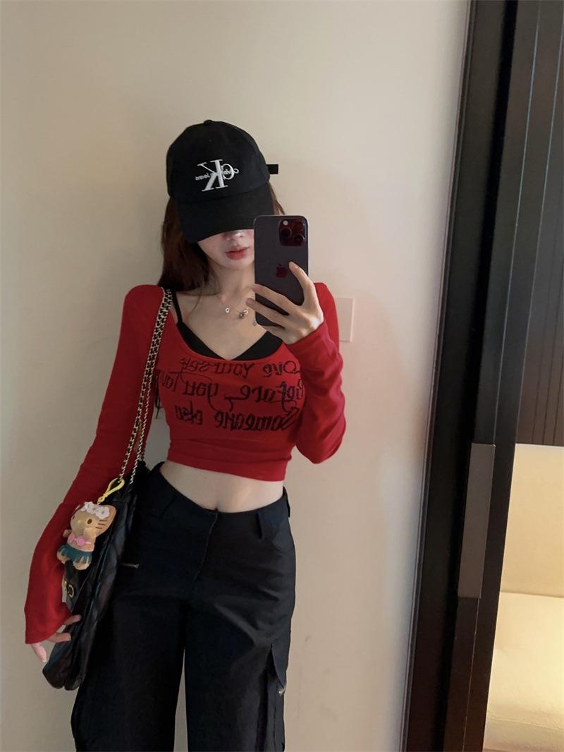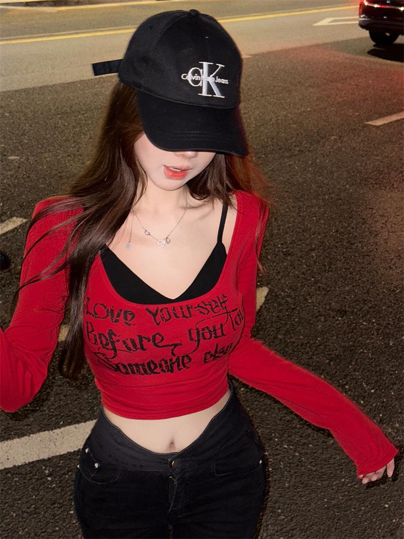 Camiseta de manga larga roja americana de otoño para mujer, sexy, con hombros descubiertos, estilo Spice Girl, ajustada, con cuello en U.