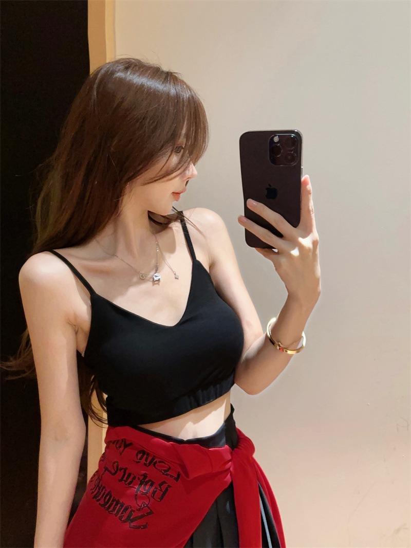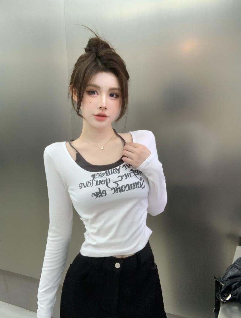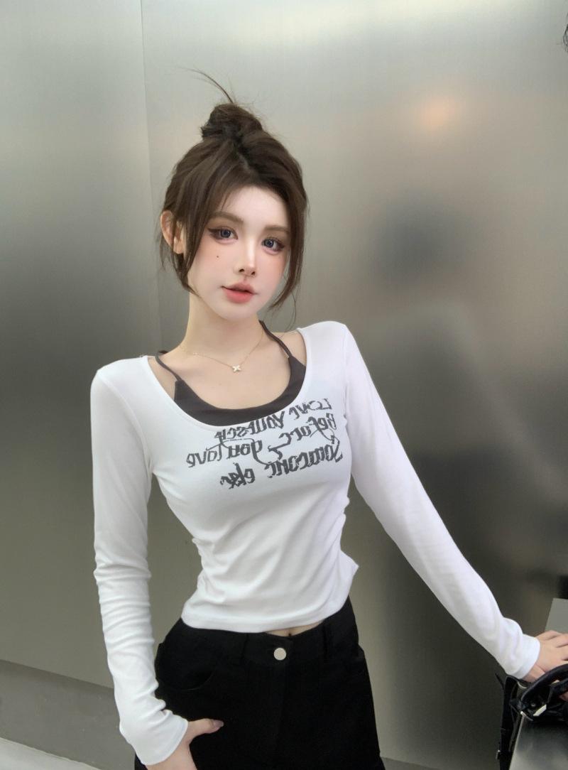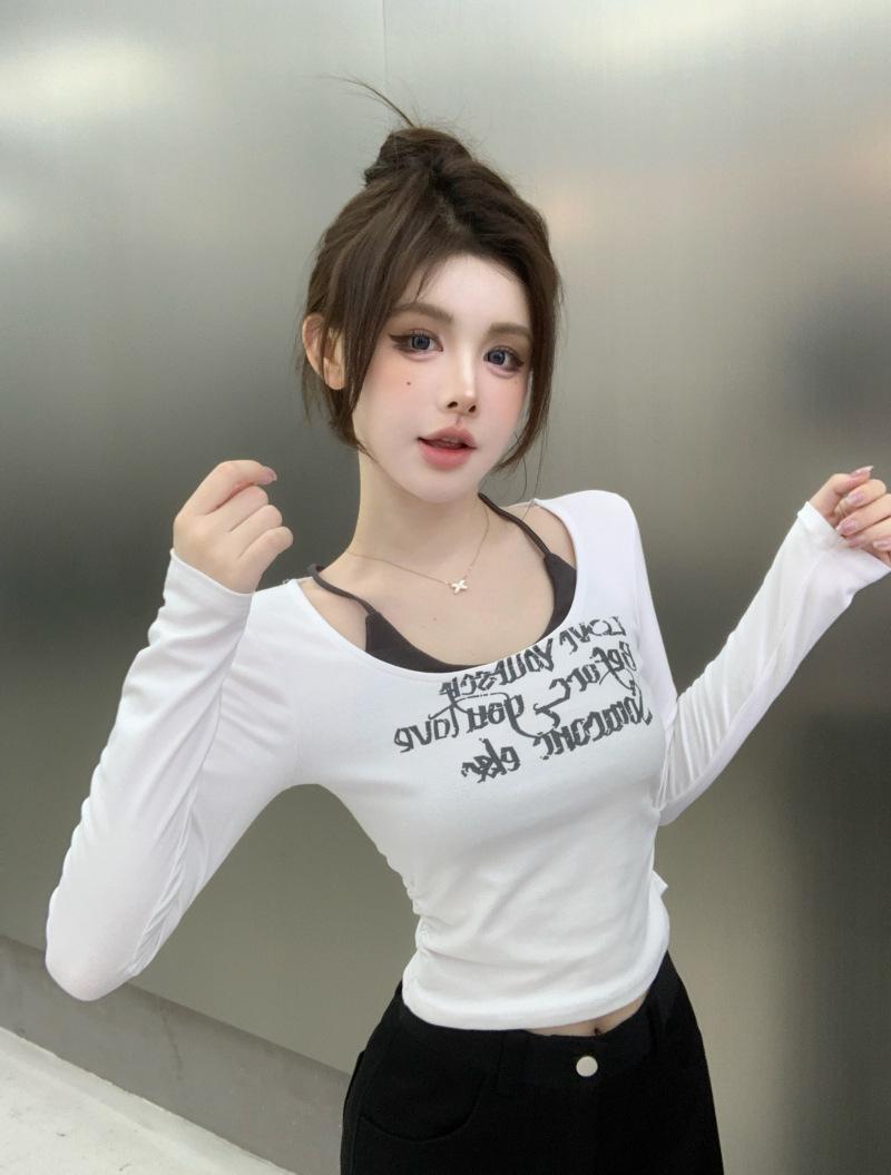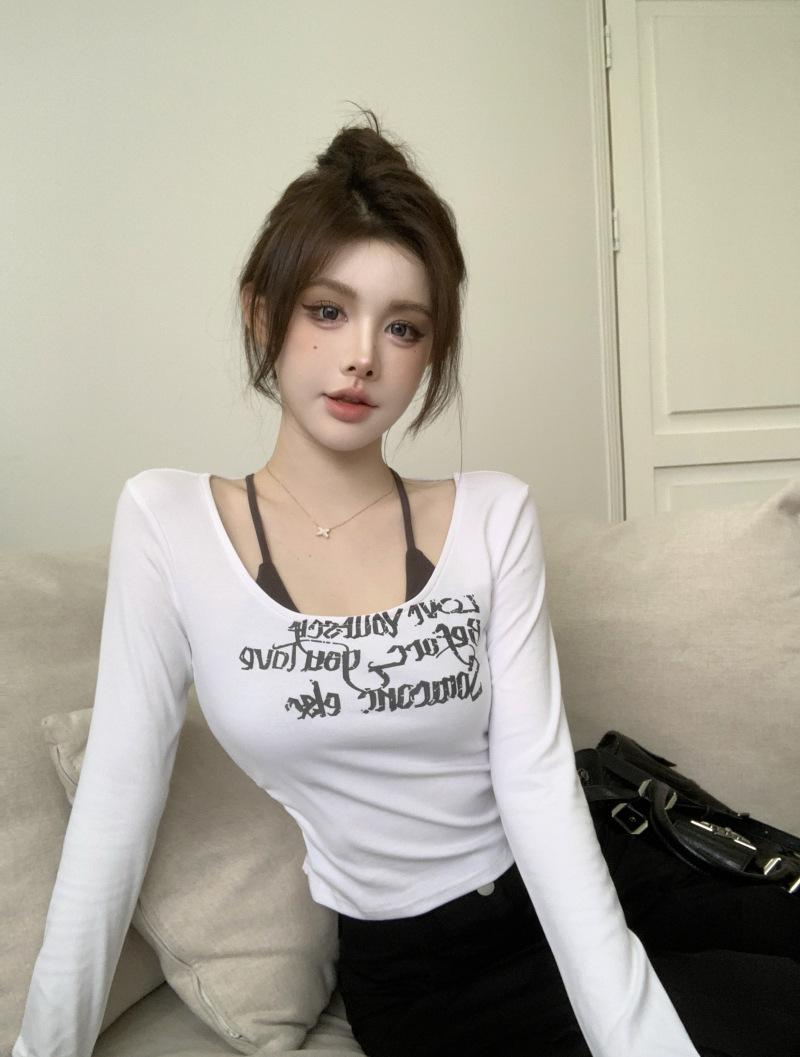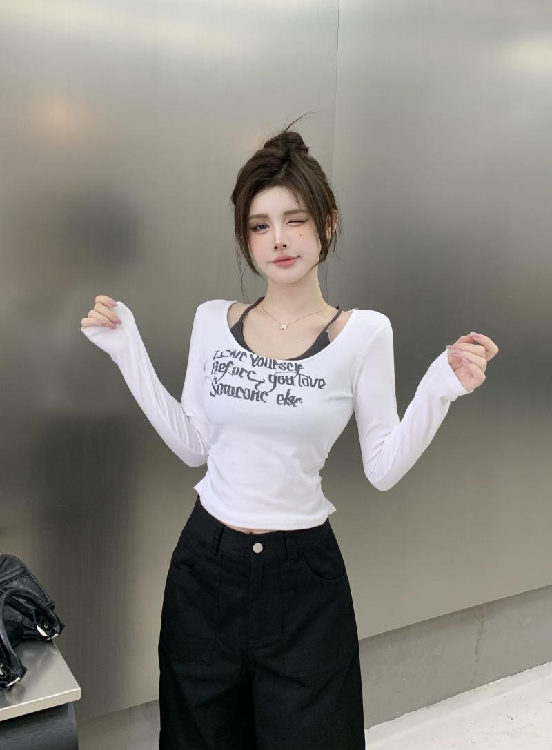 Camiseta de manga larga roja americana de otoño para mujer, sexy, con hombros descubiertos, estilo Spice Girl, ajustada, con cuello en U.