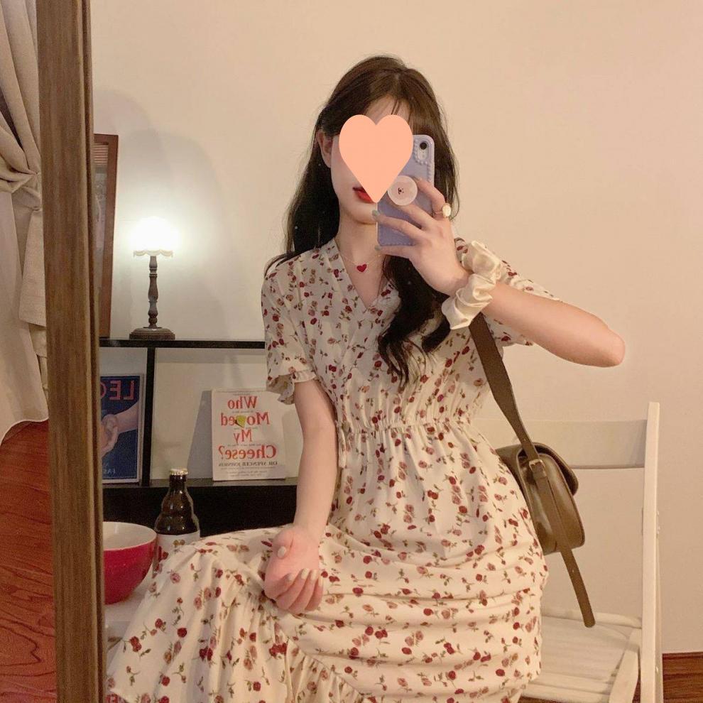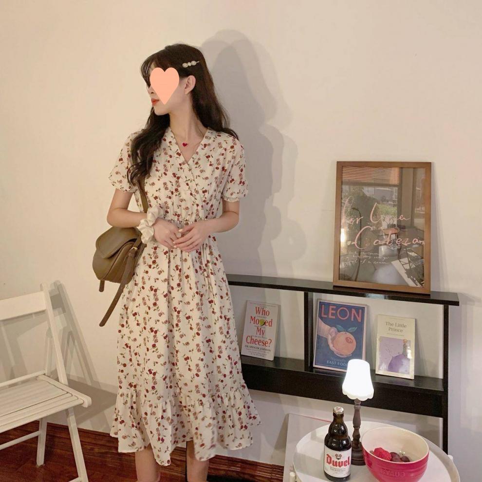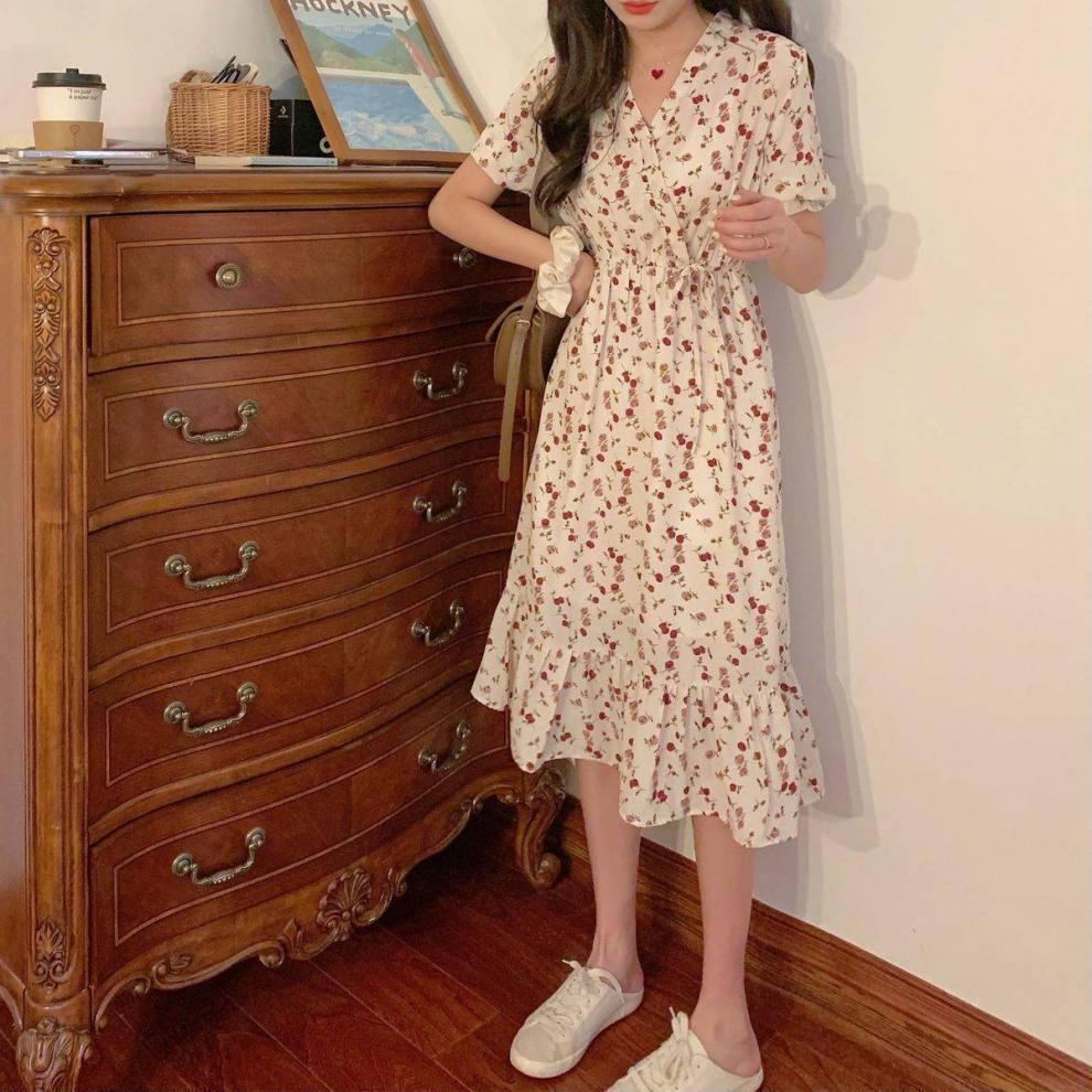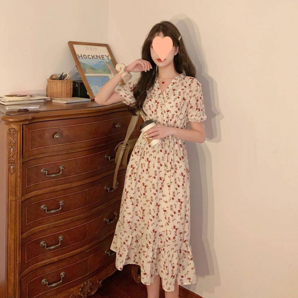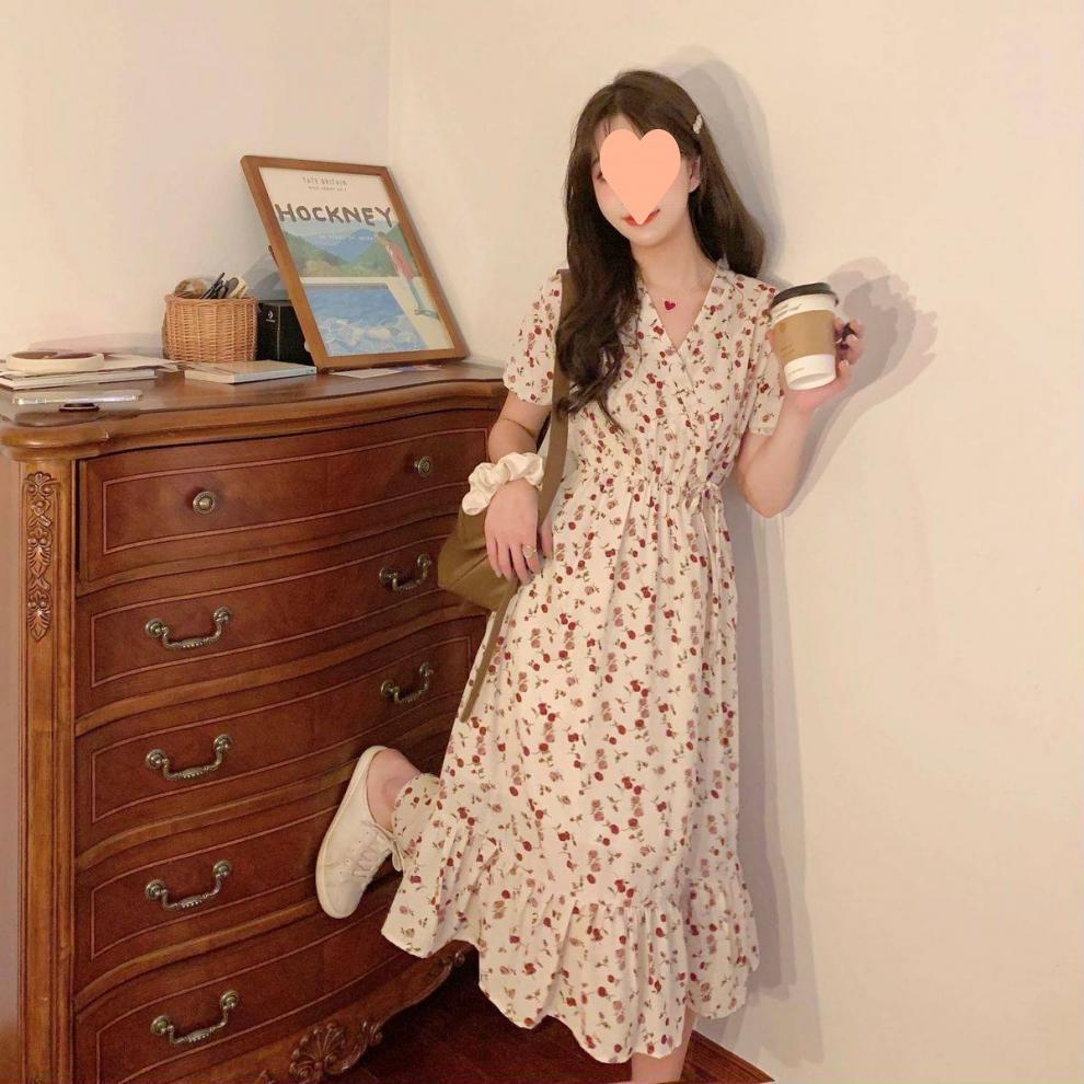 Vestido de verano para mujer, estilo francés, talla grande, temporada de flores rotas, gordito, para cubrir la cintura del vientre, adelgazante, largo medio.