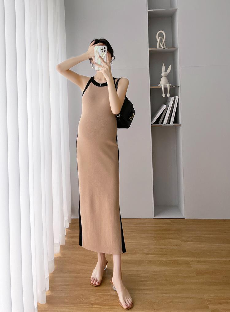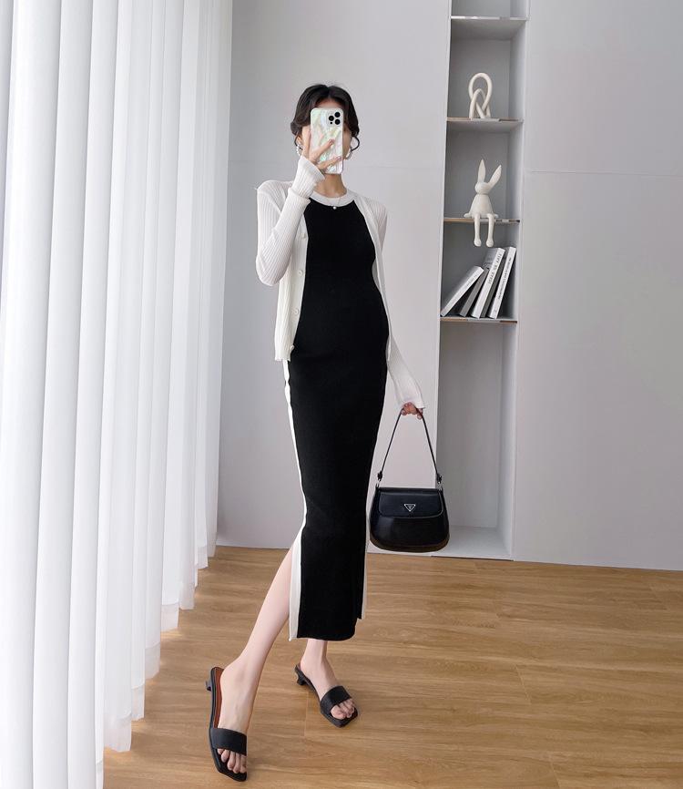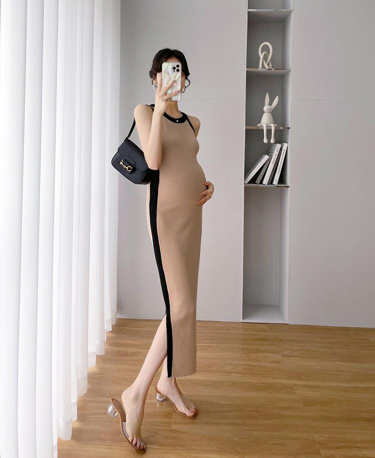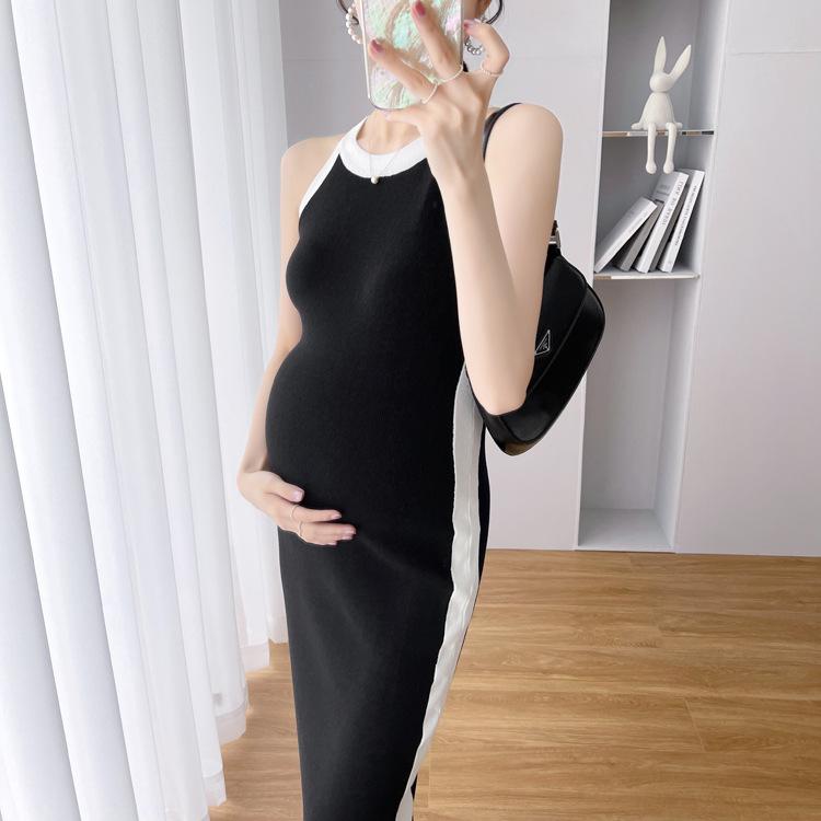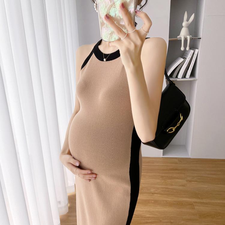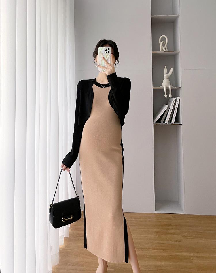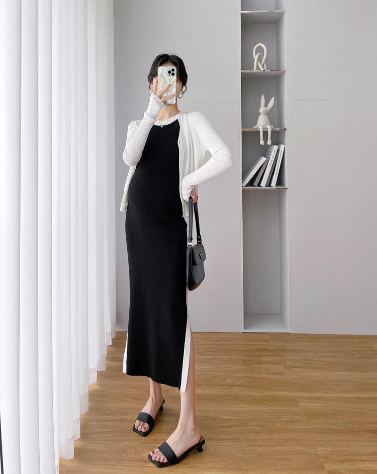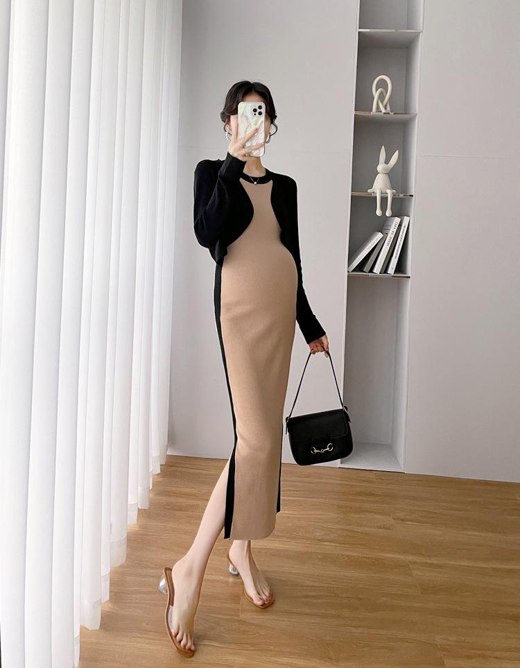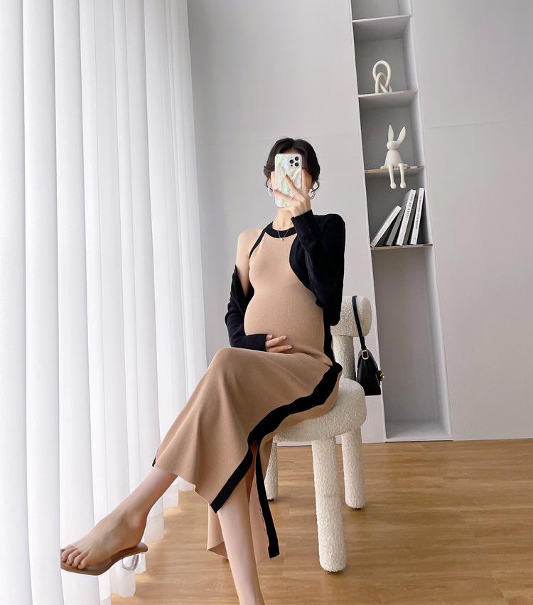 Vestido de maternidad Primavera y Otoño Nuevo elegante elástico tejido Vestido de Seda de Hielo chaleco falda cárdigan conjunto de dos piezas vestido para mujeres embarazadas
