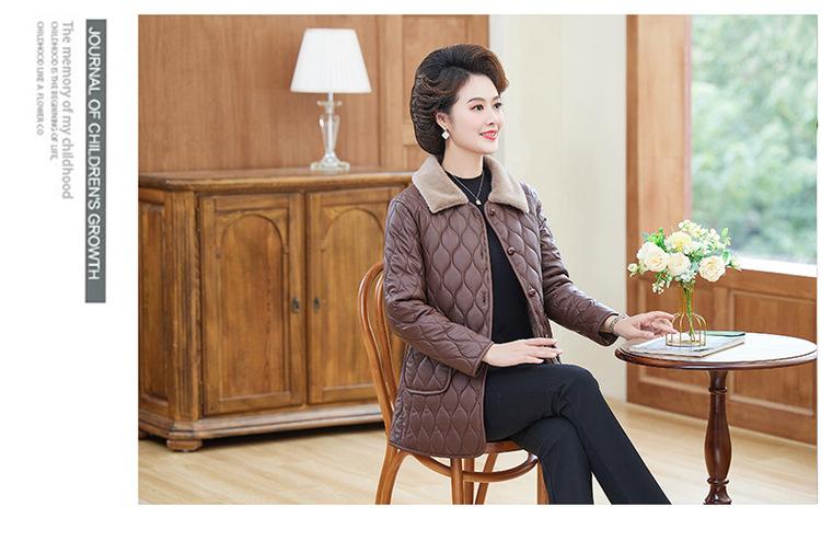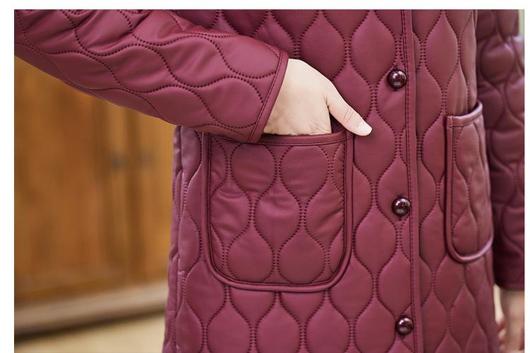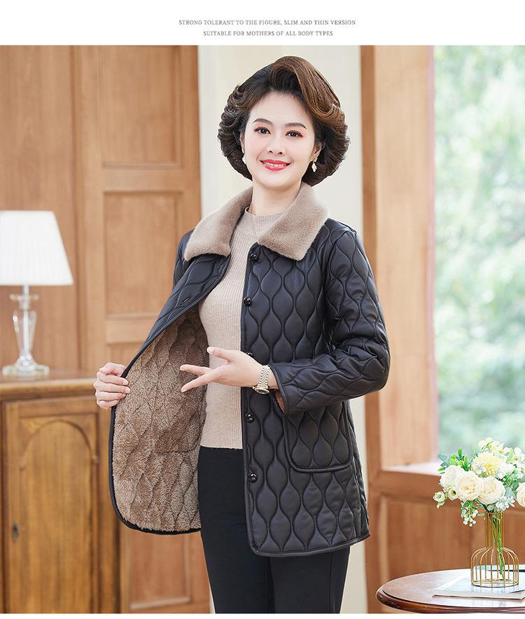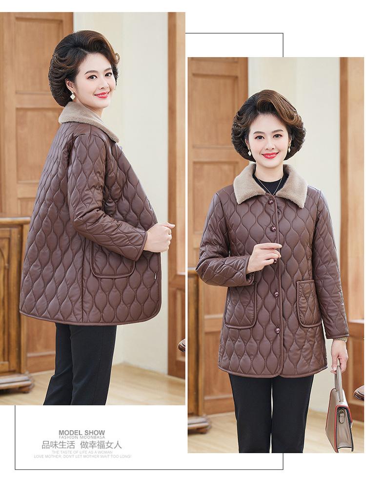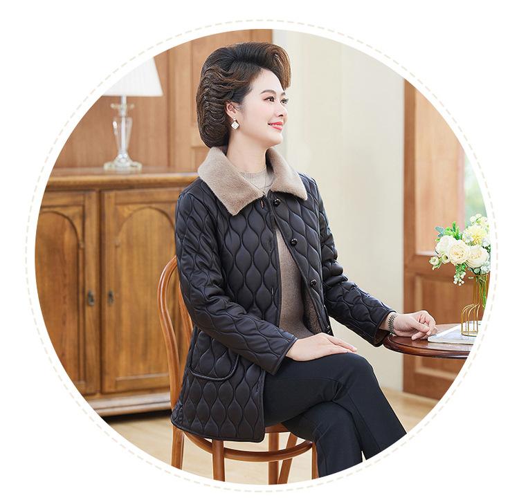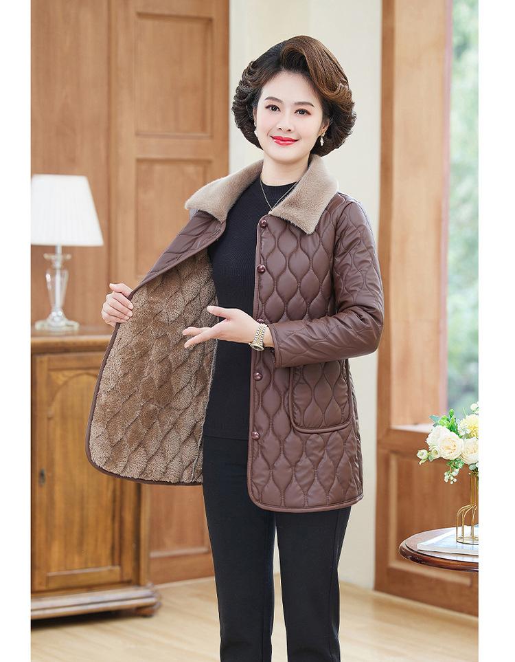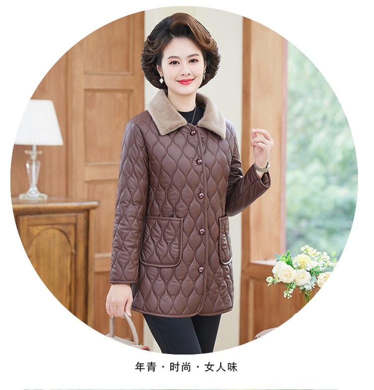 Ropa de invierno para madres, abrigo acolchado de algodón de longitud media grueso con forro polar, abrigo holgado de cuero y algodón para mujeres de mediana edad y mayores, abrigo acolchado de algodón de aspecto entallado