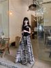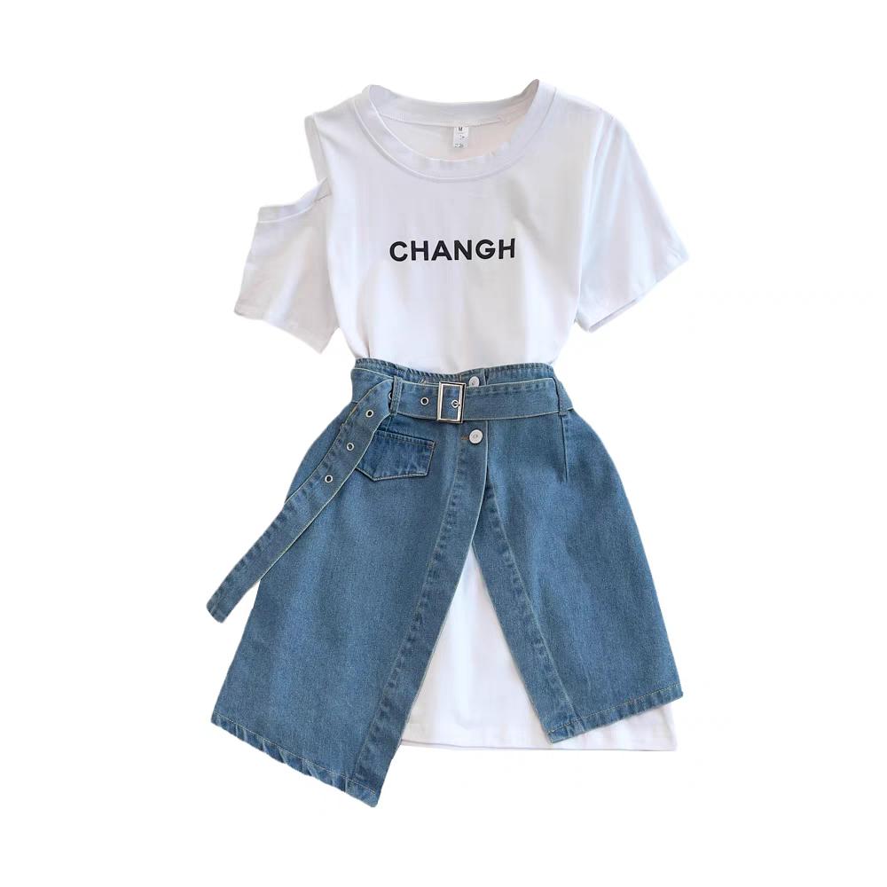 Traje de moda Color-block Spice Girl Top strapless con botones Dos piezas Falda de mezclilla con cintura alta y cordón elástico