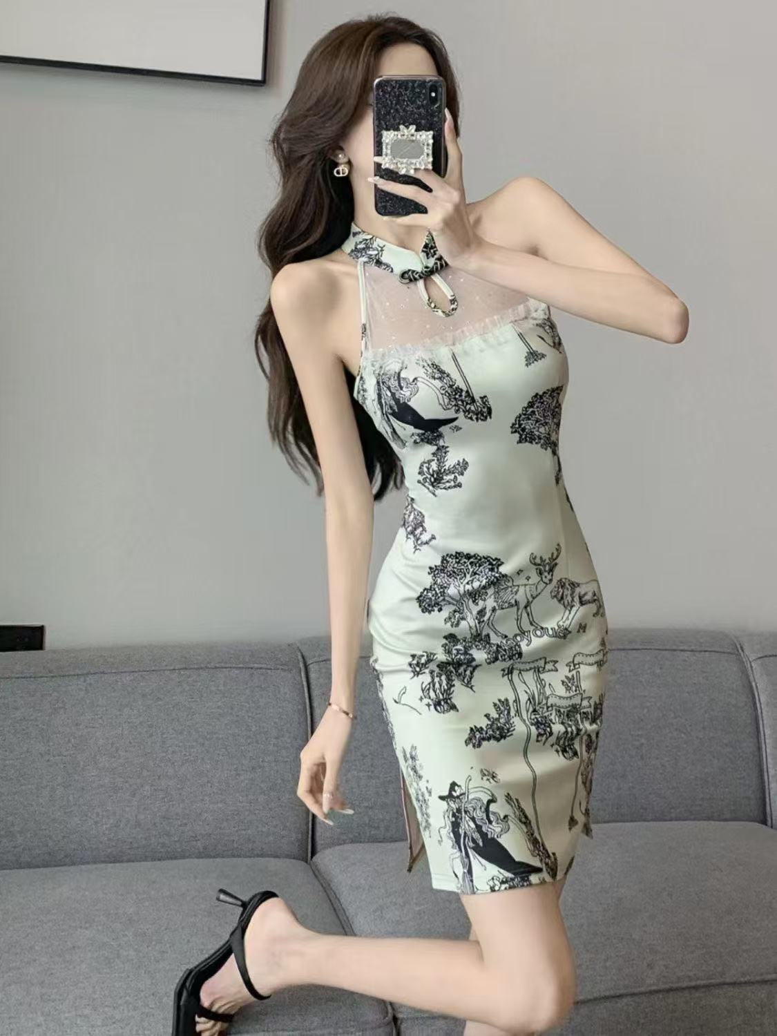 Cheongsam de estilo chino con hombros descubiertos, versión mejorada, falda corta, nuevo encaje de oreja empalmado, vestido ajustado y elegante que ciñe la cintura