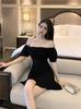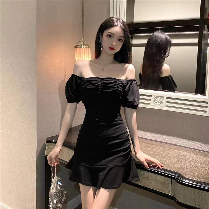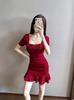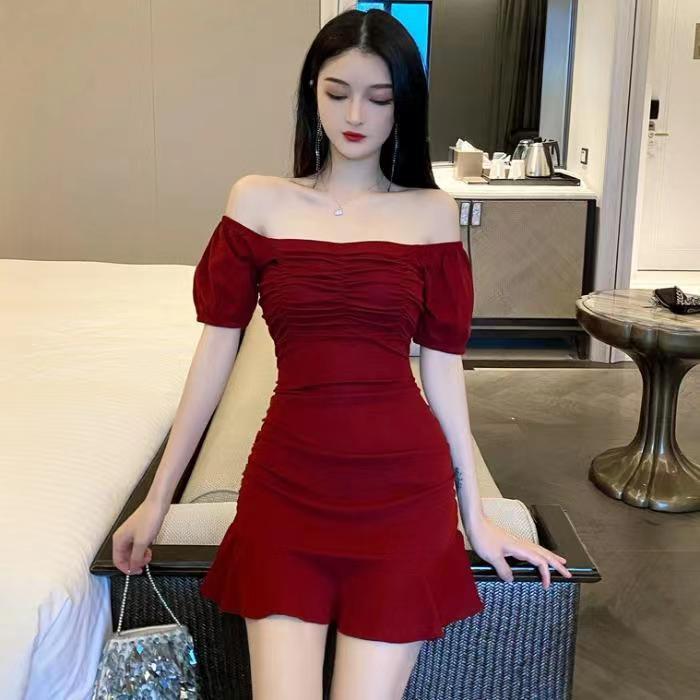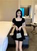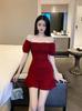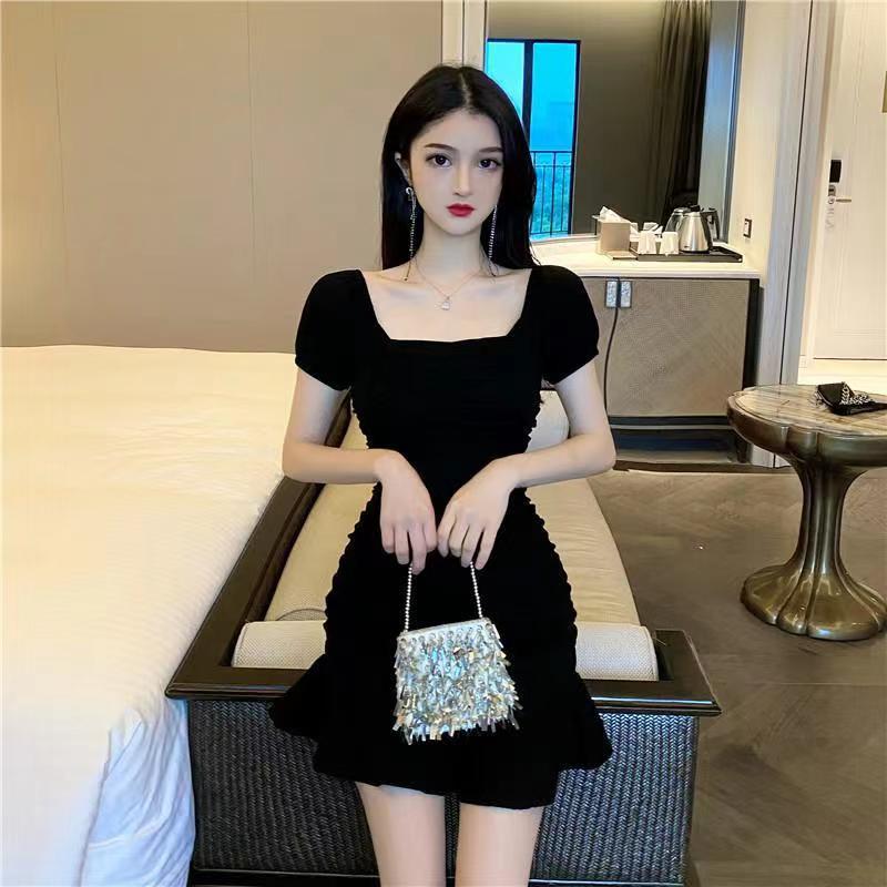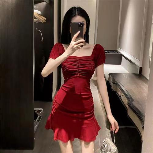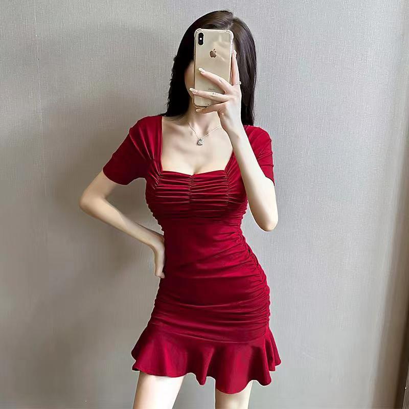 2025 Nuevo Verano Moda Femenina Sexy Cuello Cuadrado Escote Bajo Plisado Ajustado Ceñido a las Caderas Vestido de Manga Corta de Alta Elasticidad