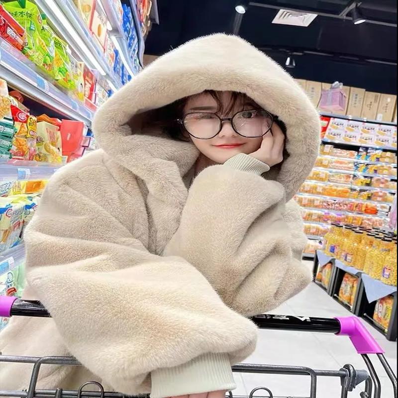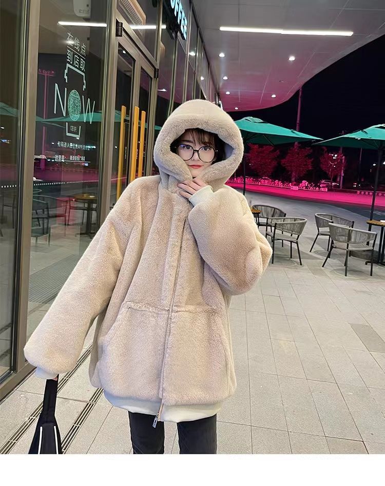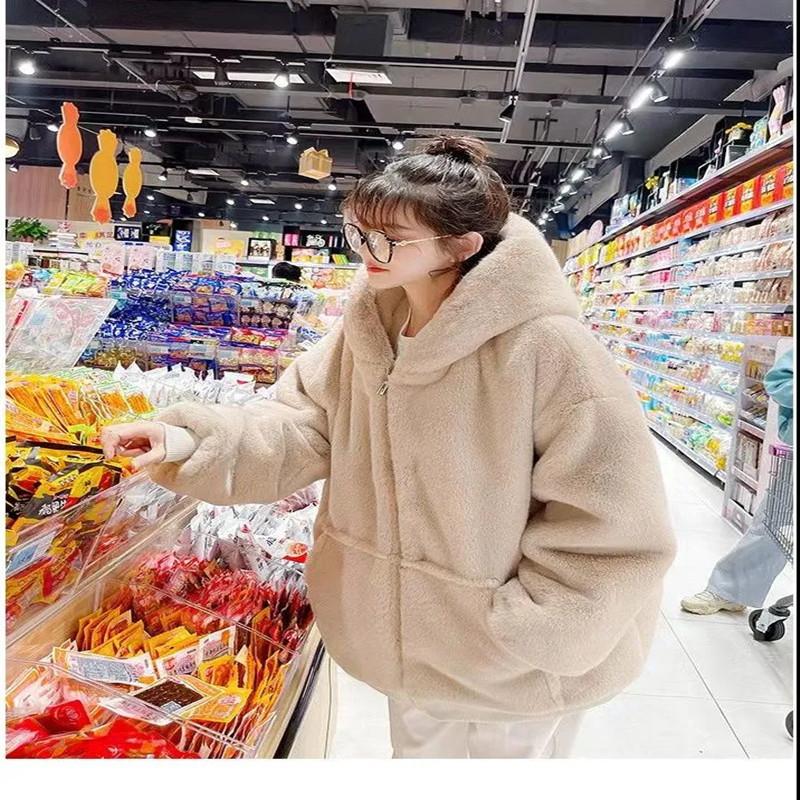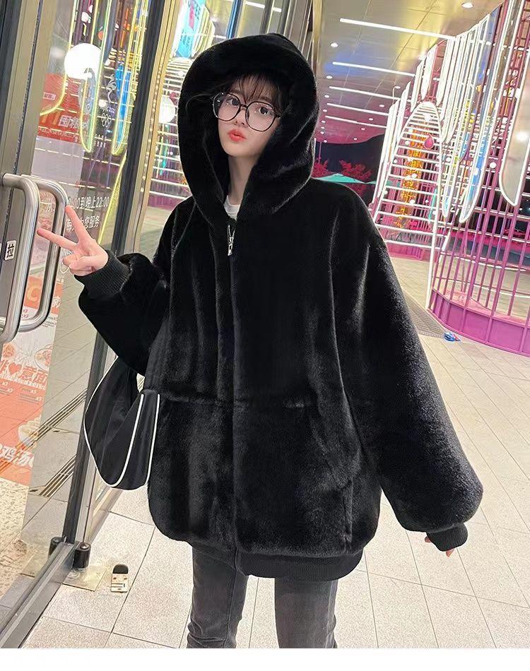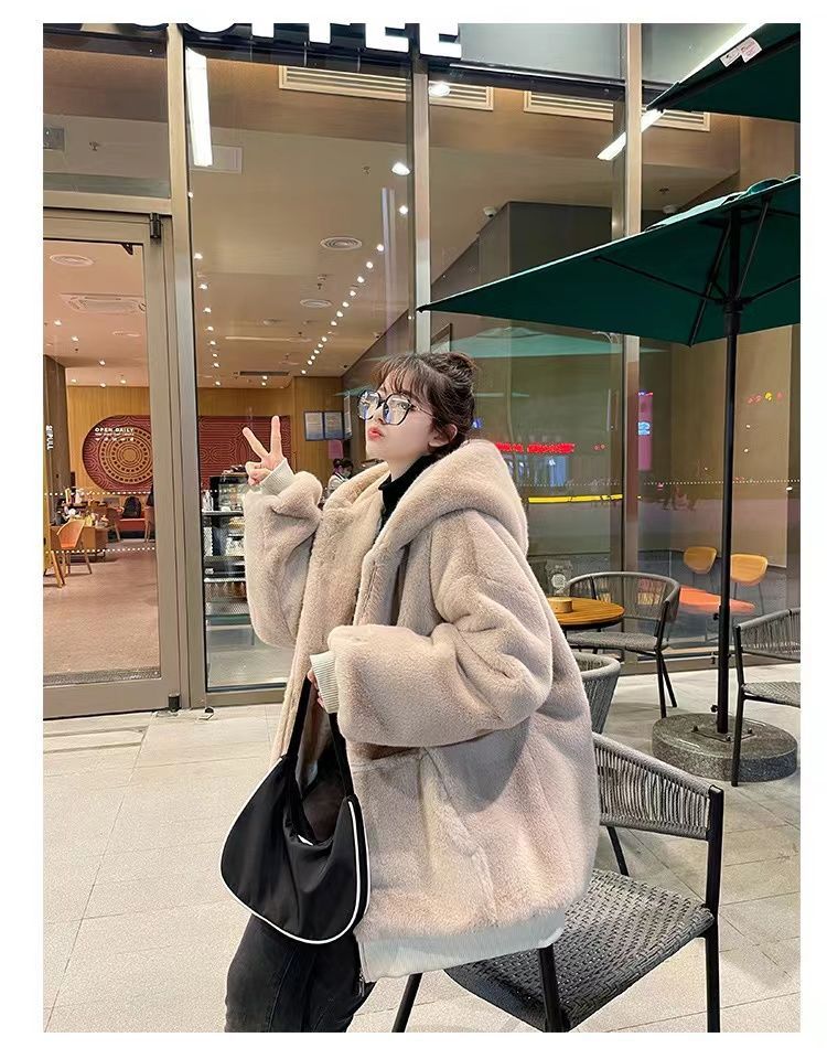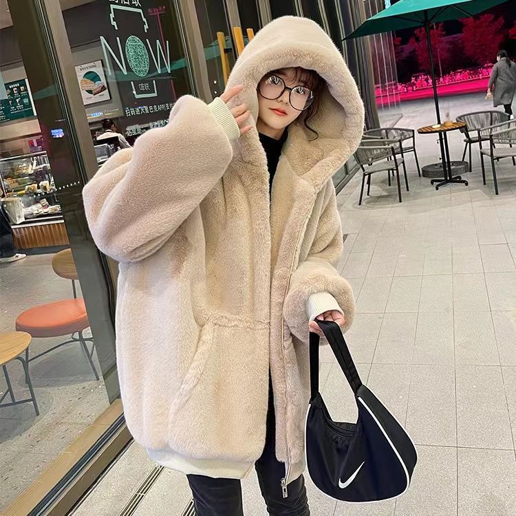 Abrigo de cachemir suelto estilo coreano 2024 para mujer, de imitación de conejo Rex, cordero, cachemir, largo medio, grueso, con capucha