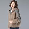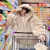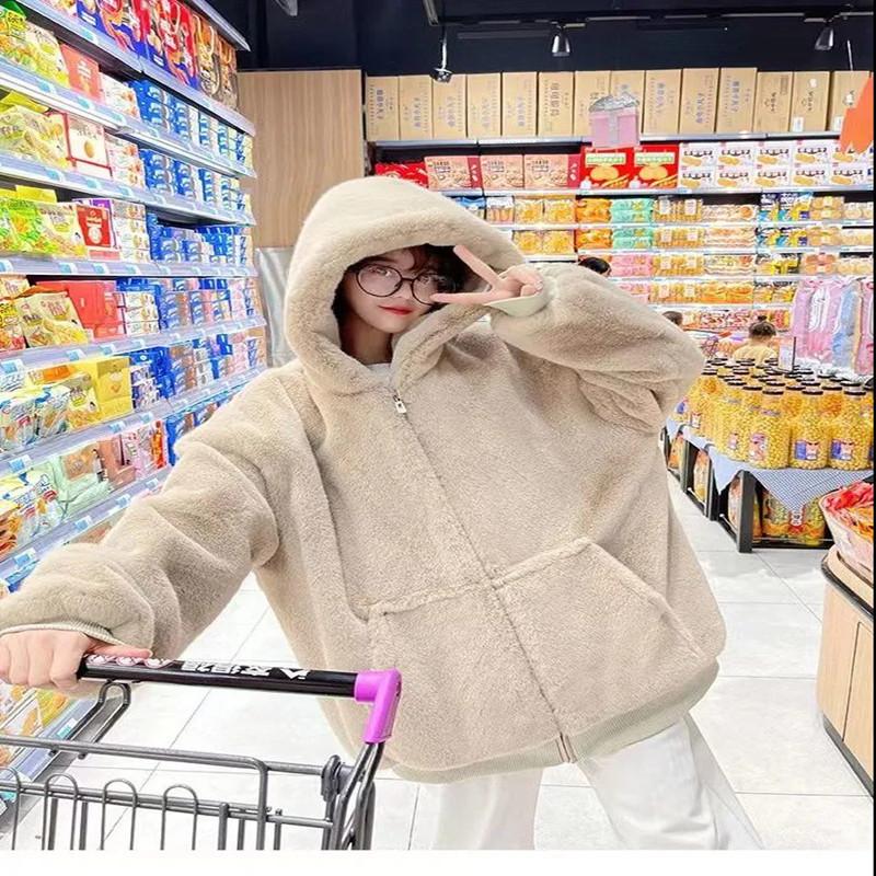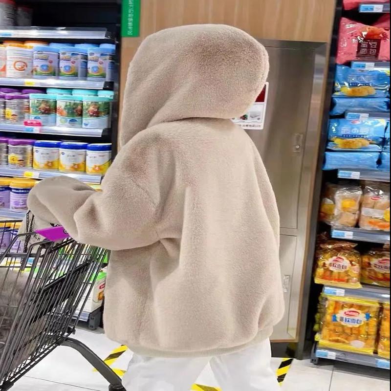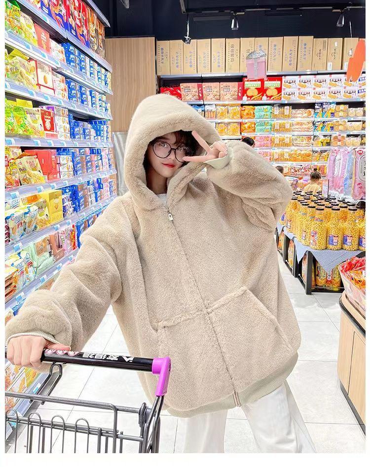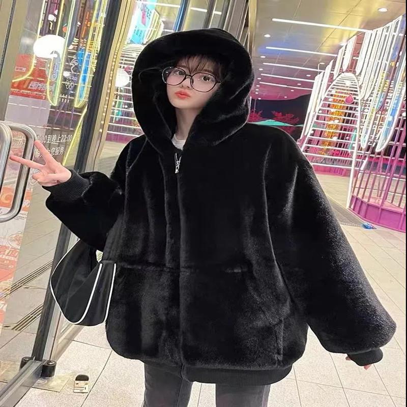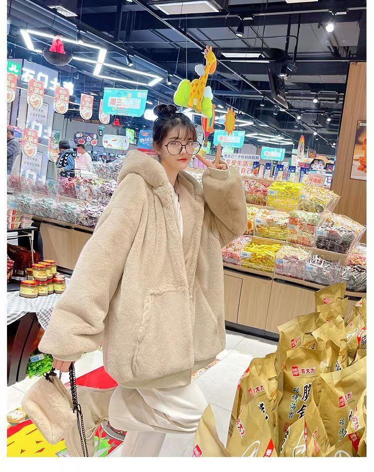 Abrigo de cachemir suelto estilo coreano 2024 para mujer, de imitación de conejo Rex, cordero, cachemir, largo medio, grueso, con capucha