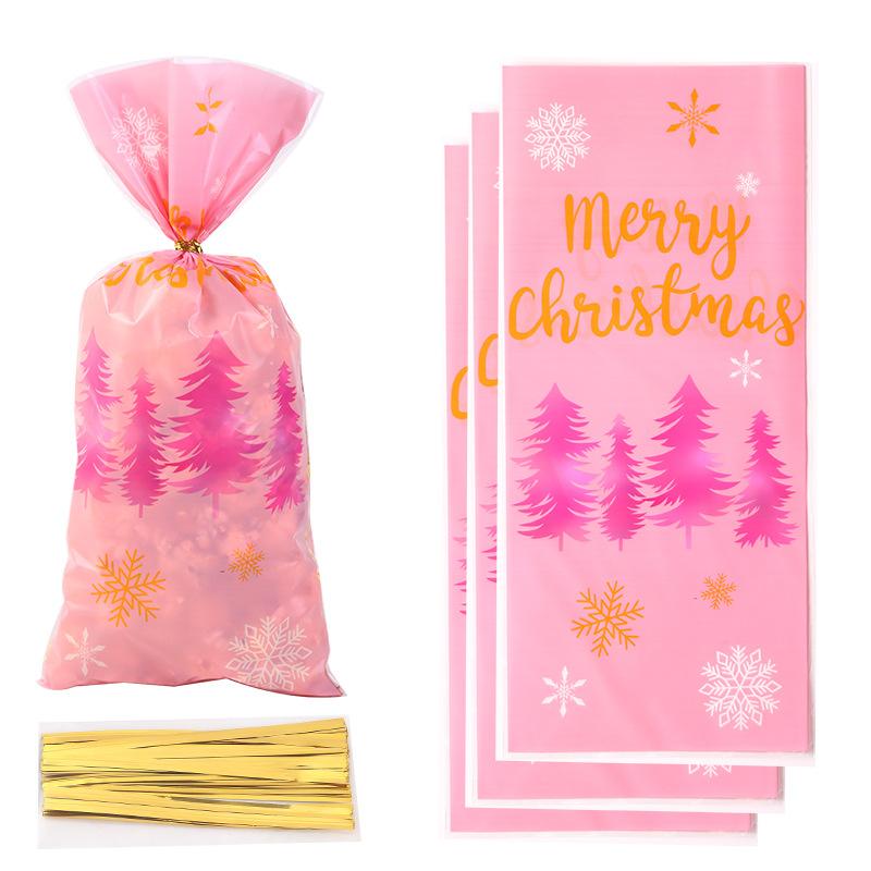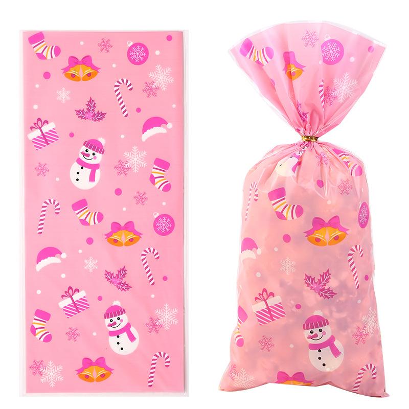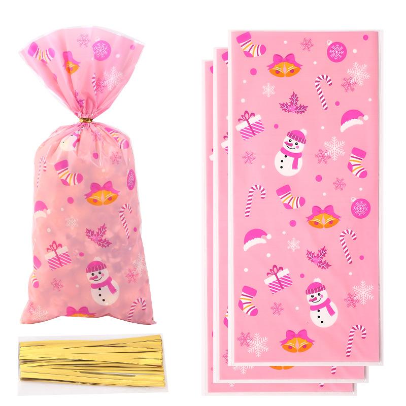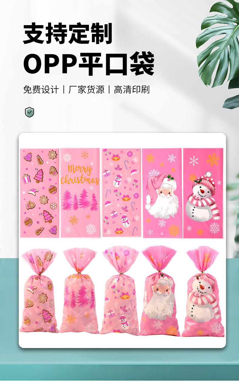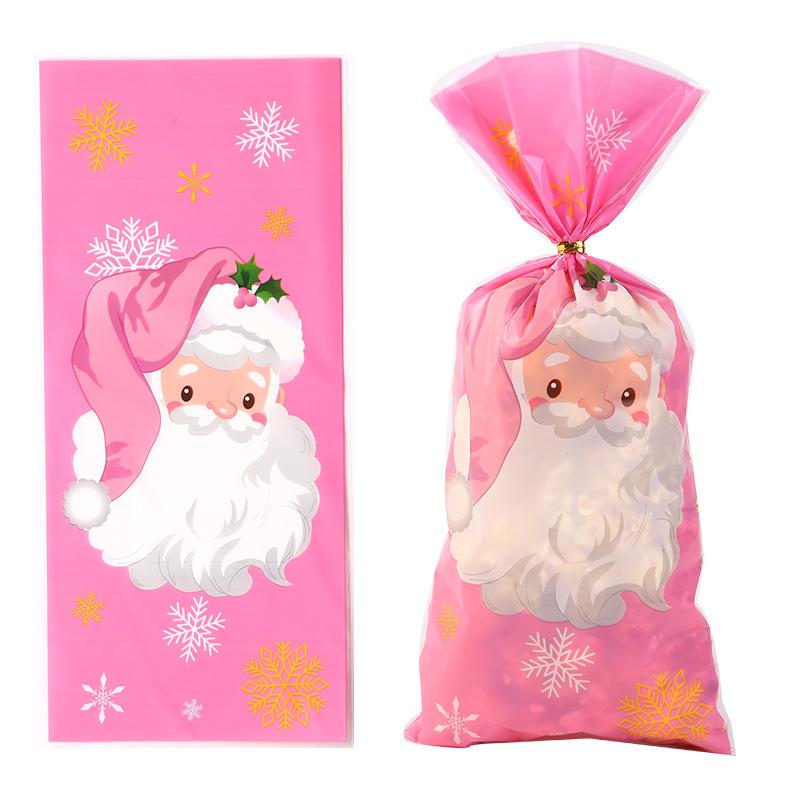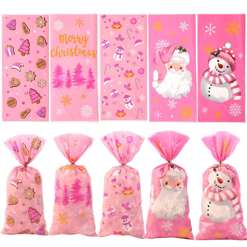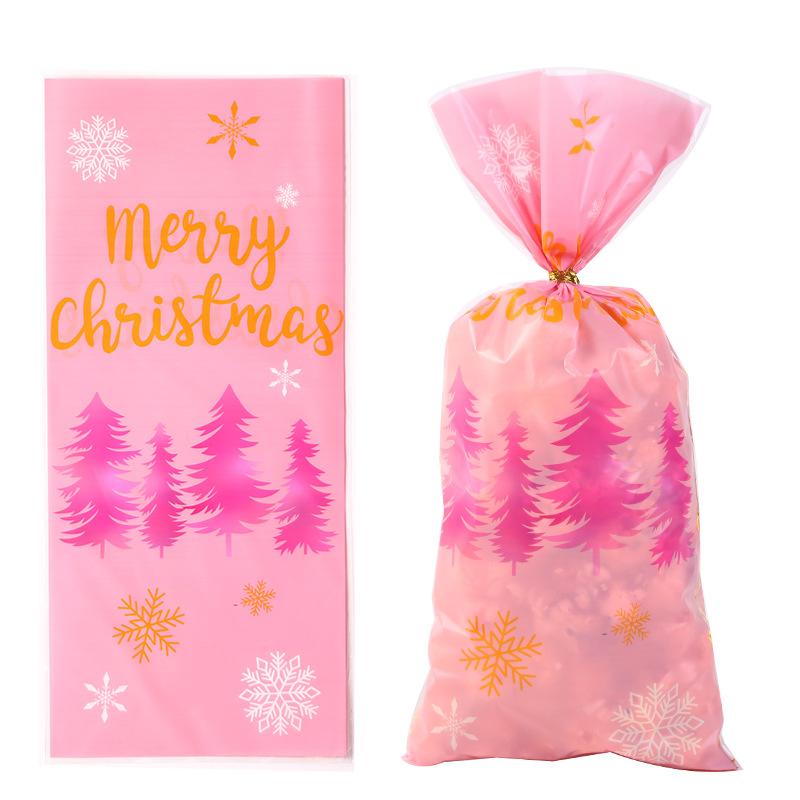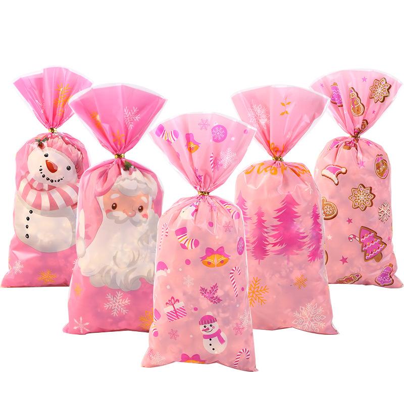 Bolsa de plástico con estampado de bolsillo plano, serie navideña rosa, para dulces, fiestas, regalos, repostería