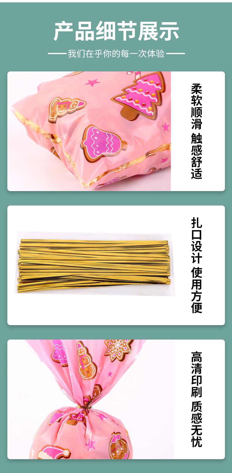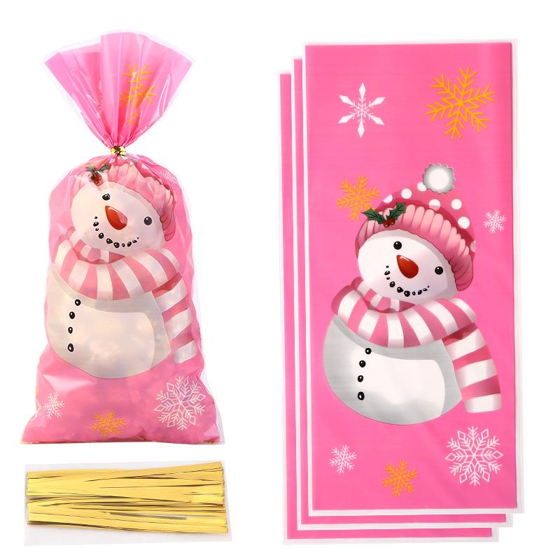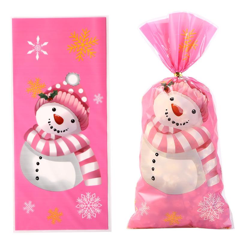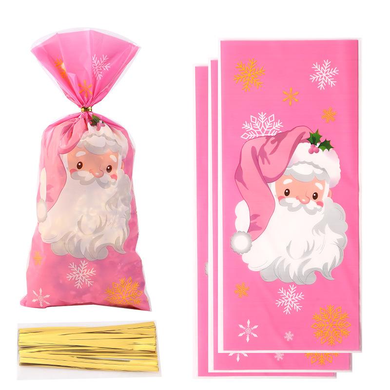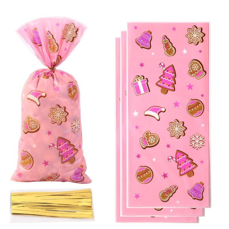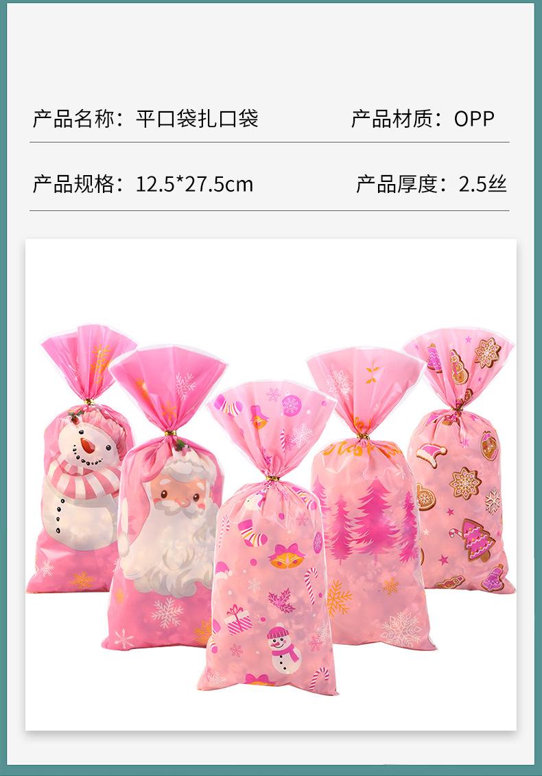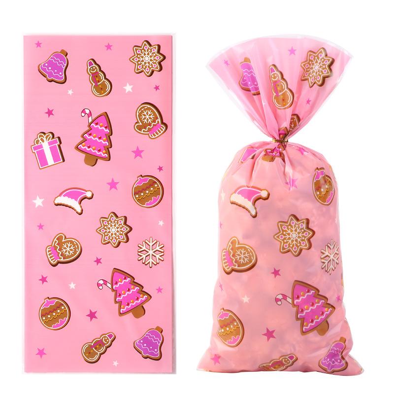Bolsa de plástico con estampado de bolsillo plano, serie navideña rosa, para dulces, fiestas, regalos, repostería