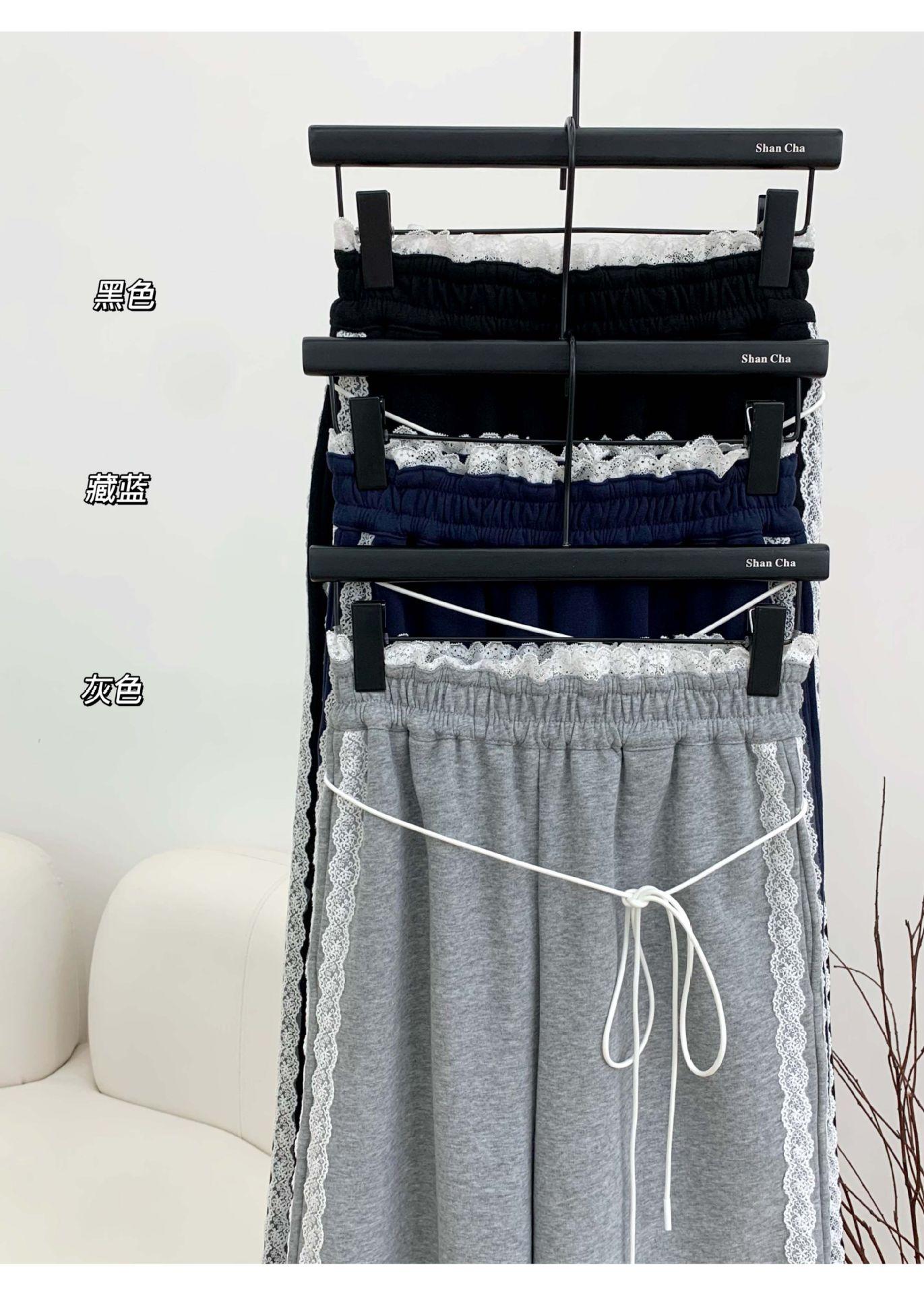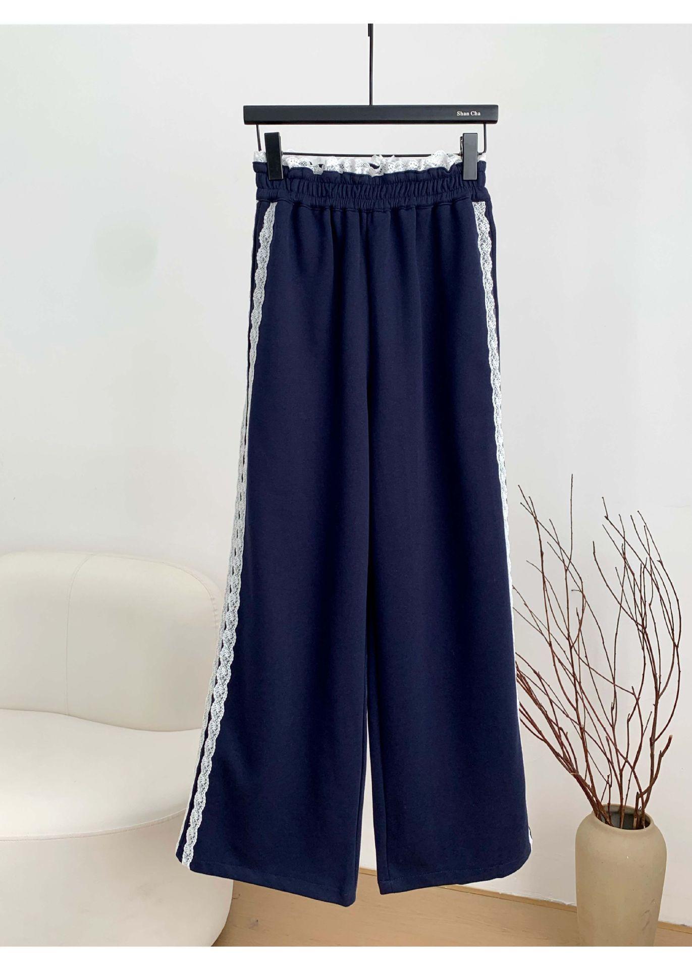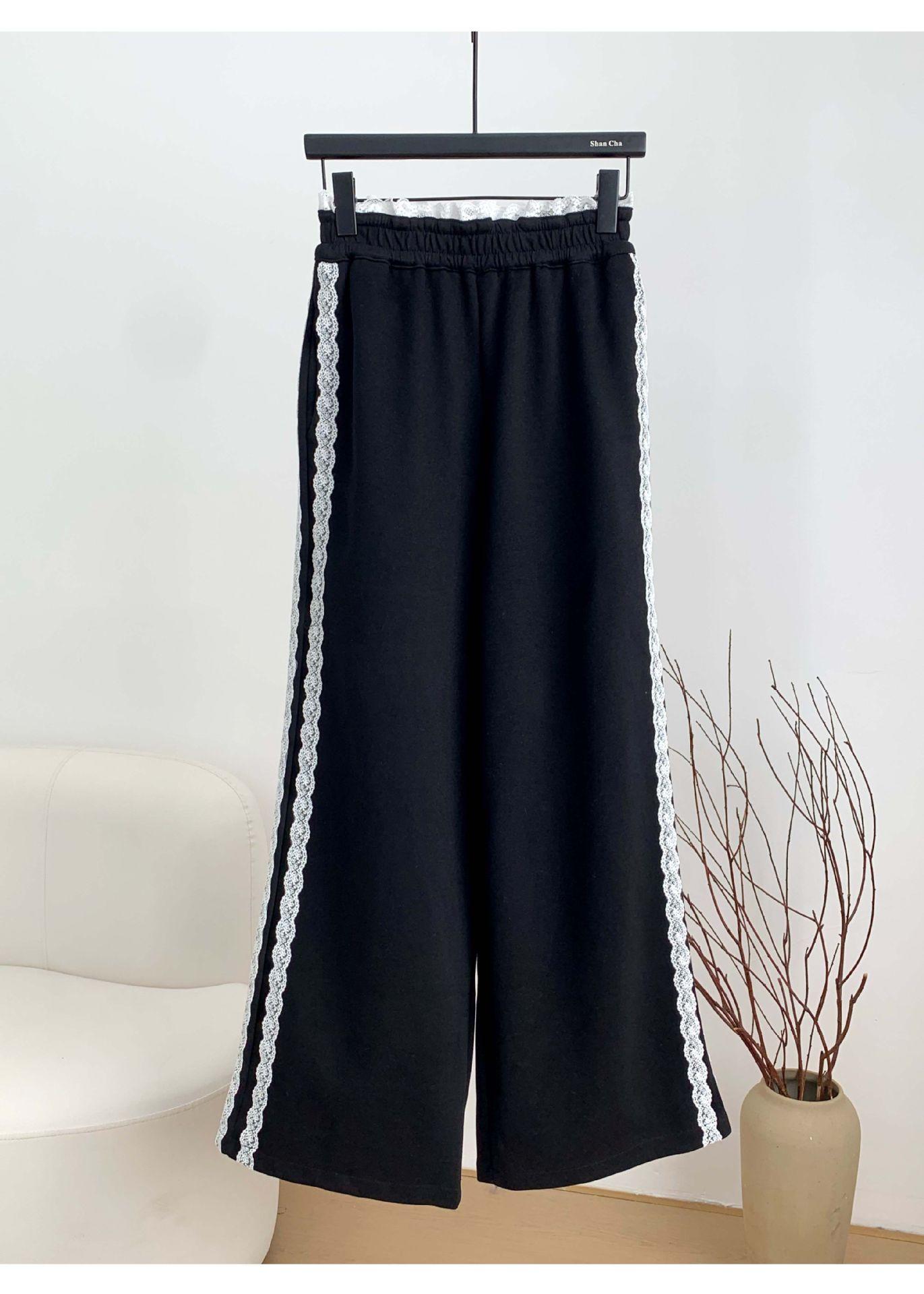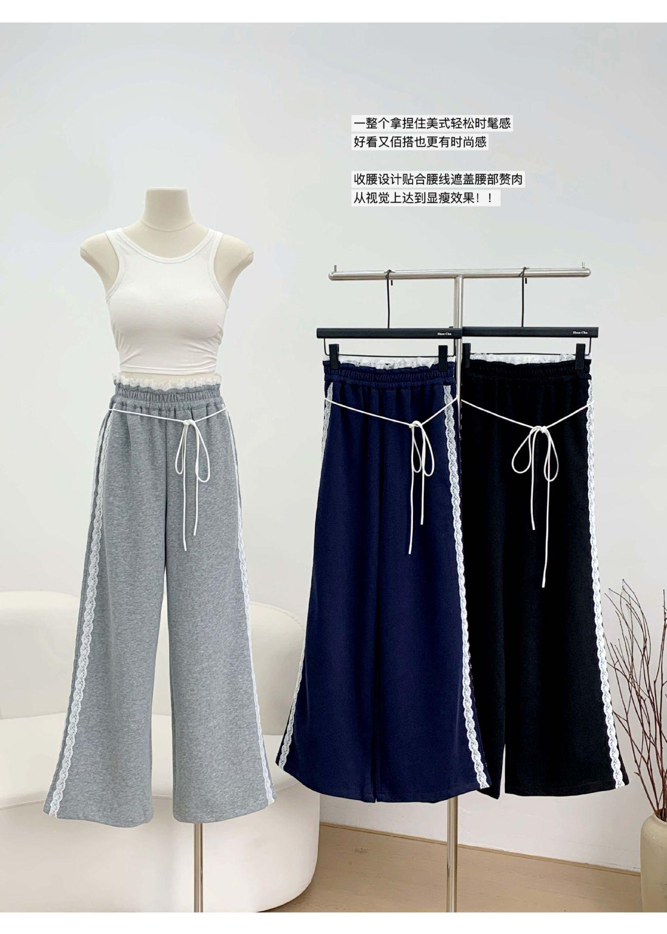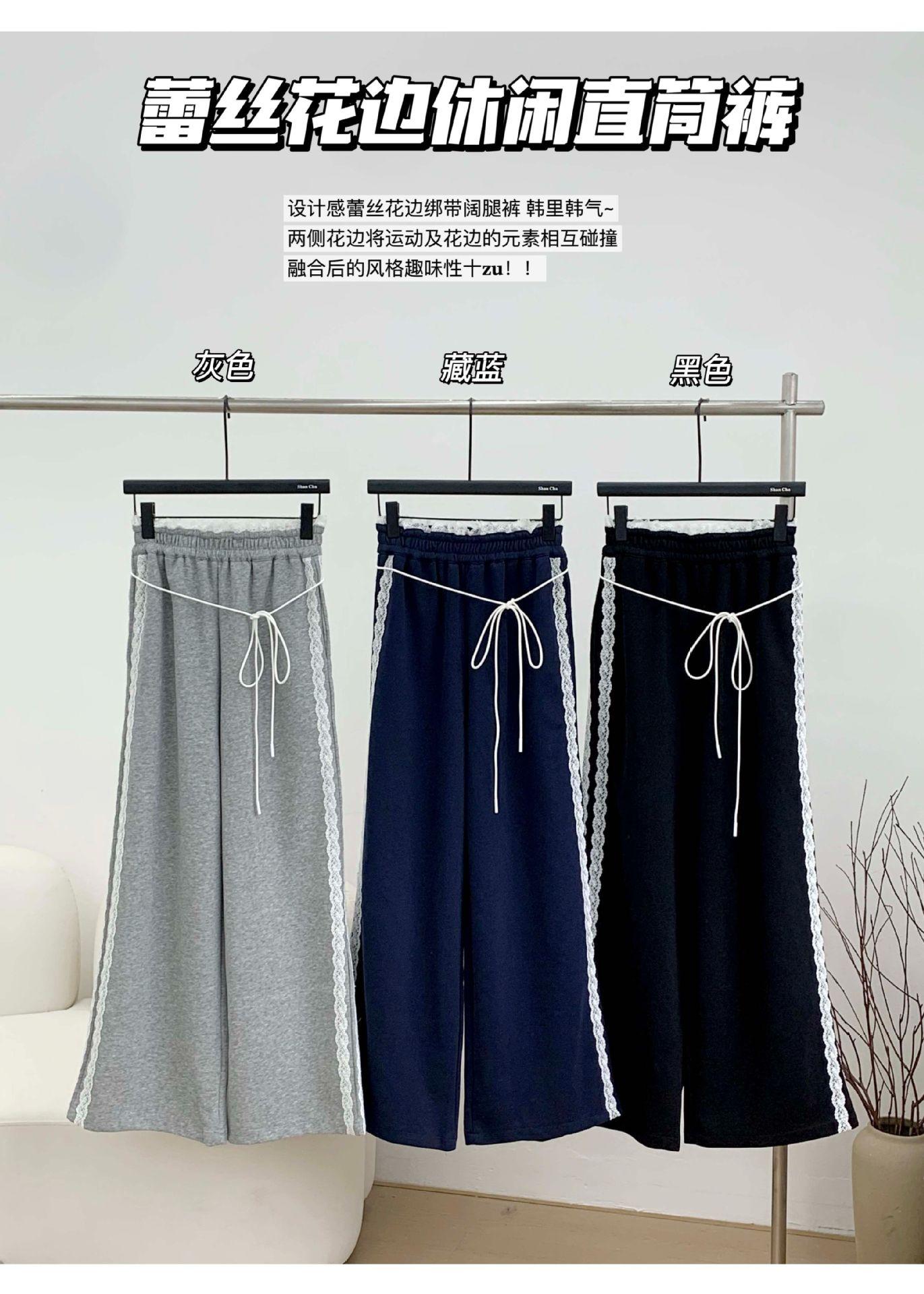 Pantalones casuales finos con tiras y borde de encaje para mujer, primavera y otoño 2025, nuevo estilo coreano, pantalones holgados, rectos, de cintura alta y pierna ancha.
