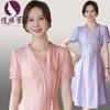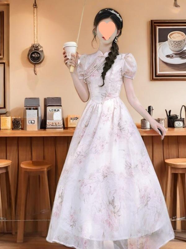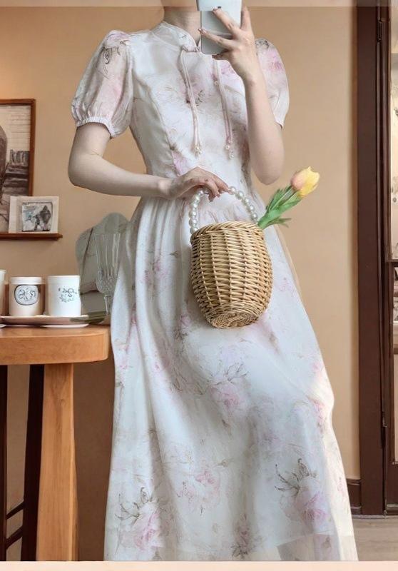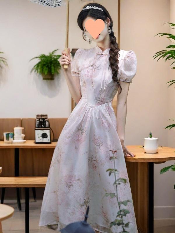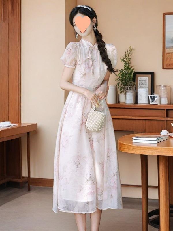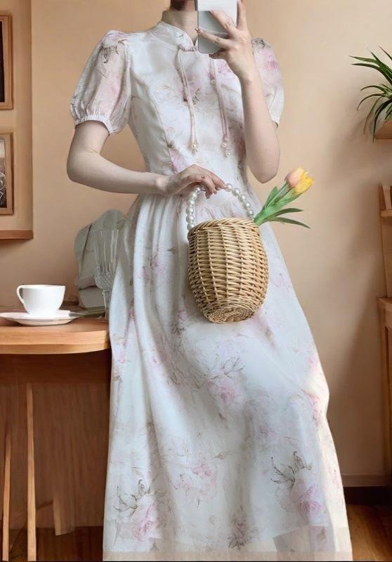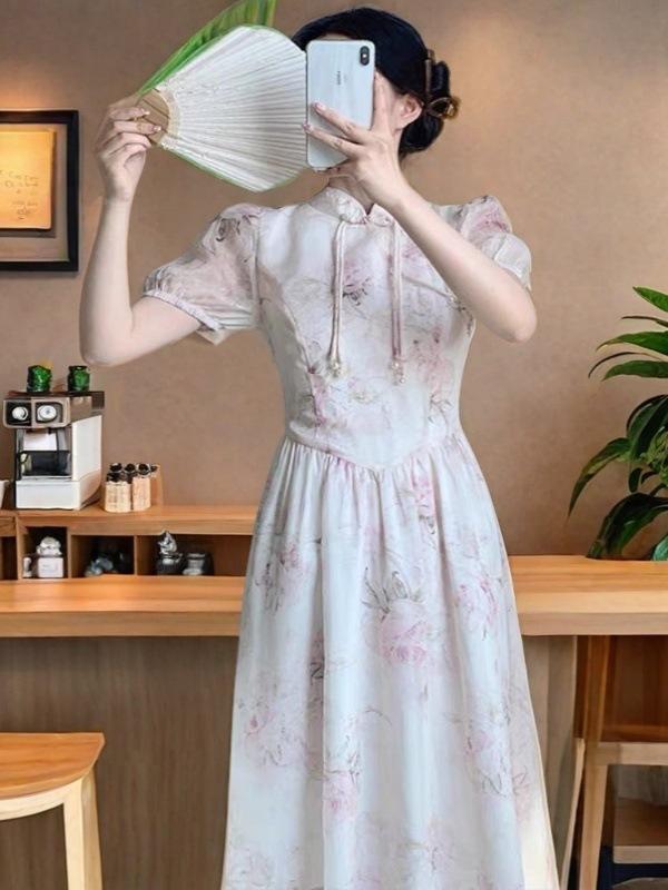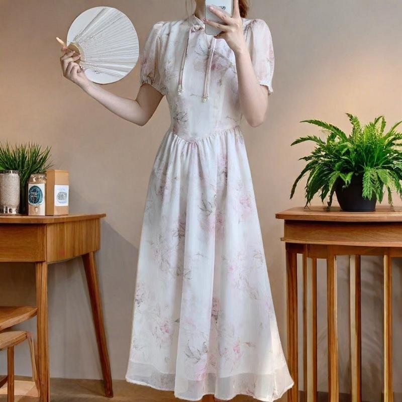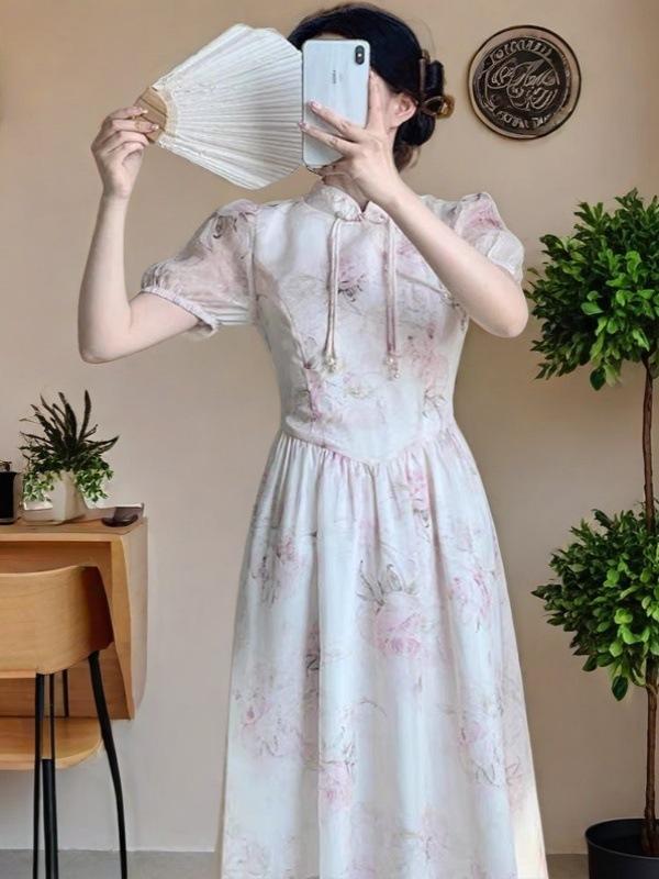 Vestido de primavera 2025, recién llegado, vestido floral, nuevo estilo chino, estilo nacional, falda de longitud media, manga corta
