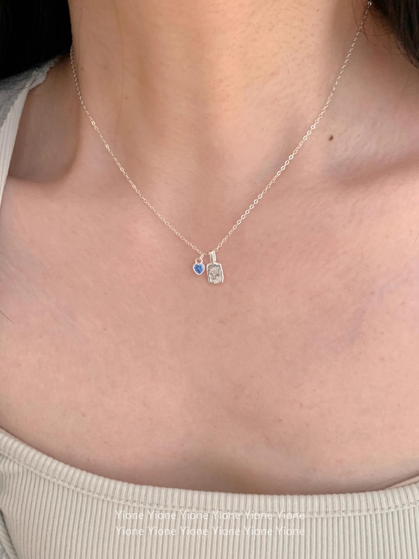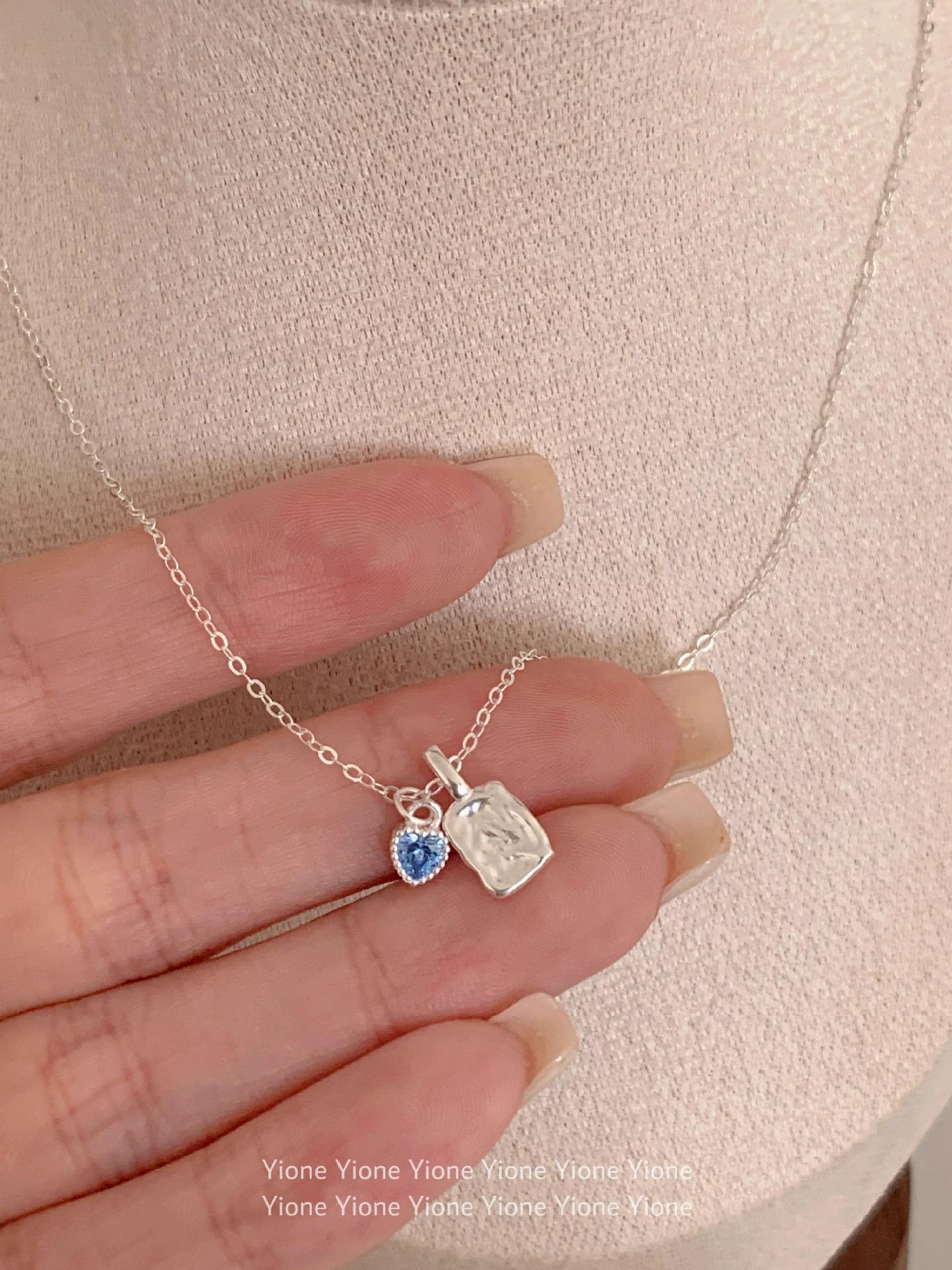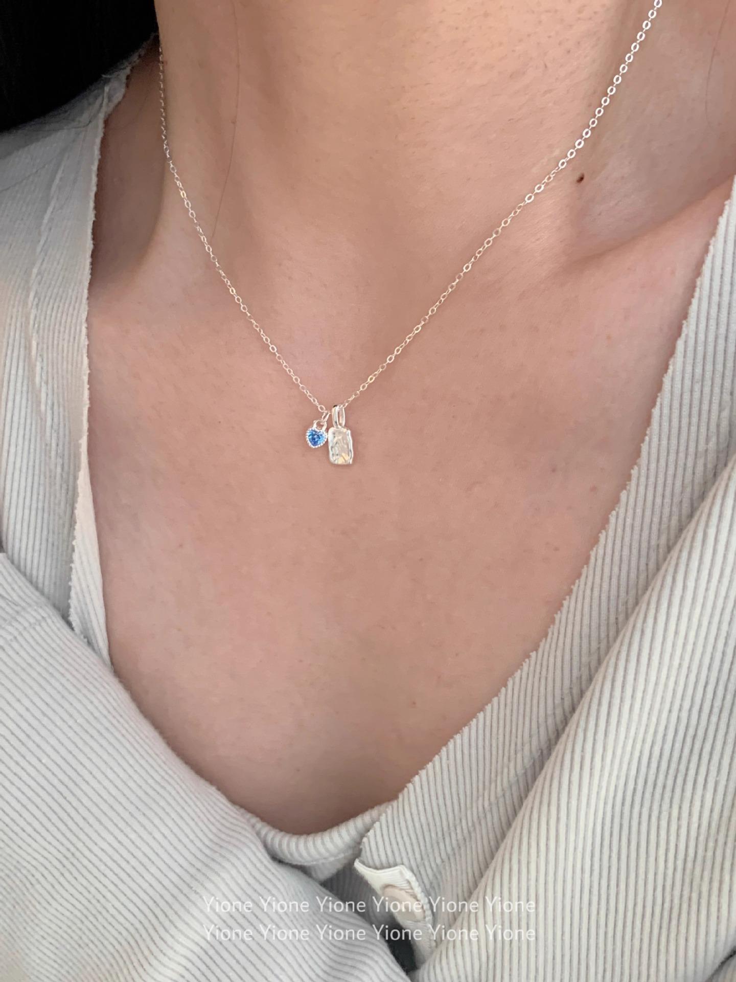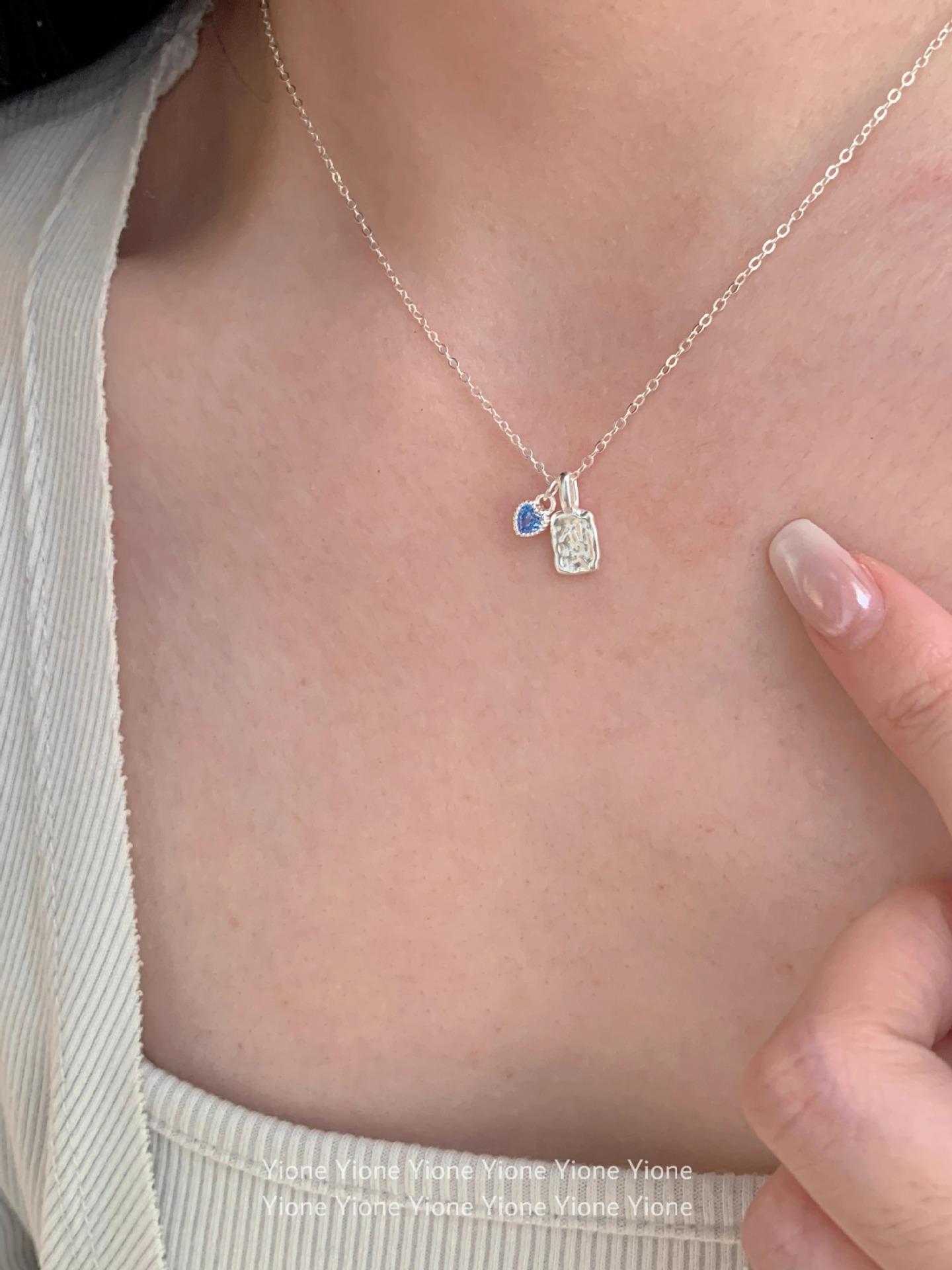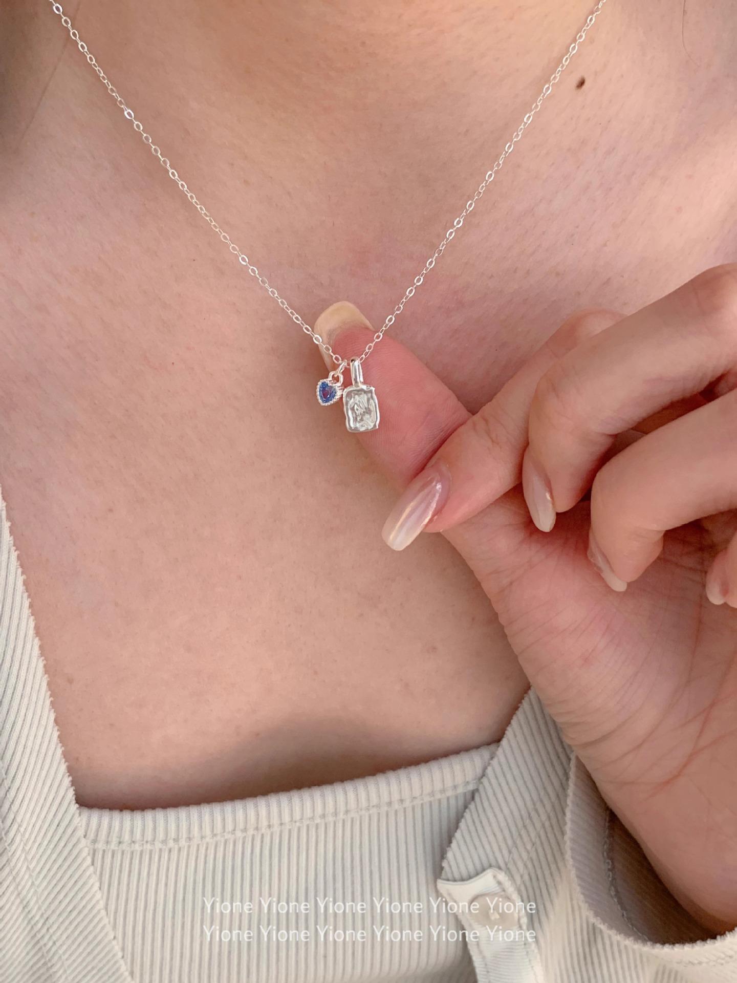 Collar con colgante cuadrado de textura irregular para mujer, sencillo y diario, con cadena de clavícula con circonita azul dulce y de gran sentido del amor.