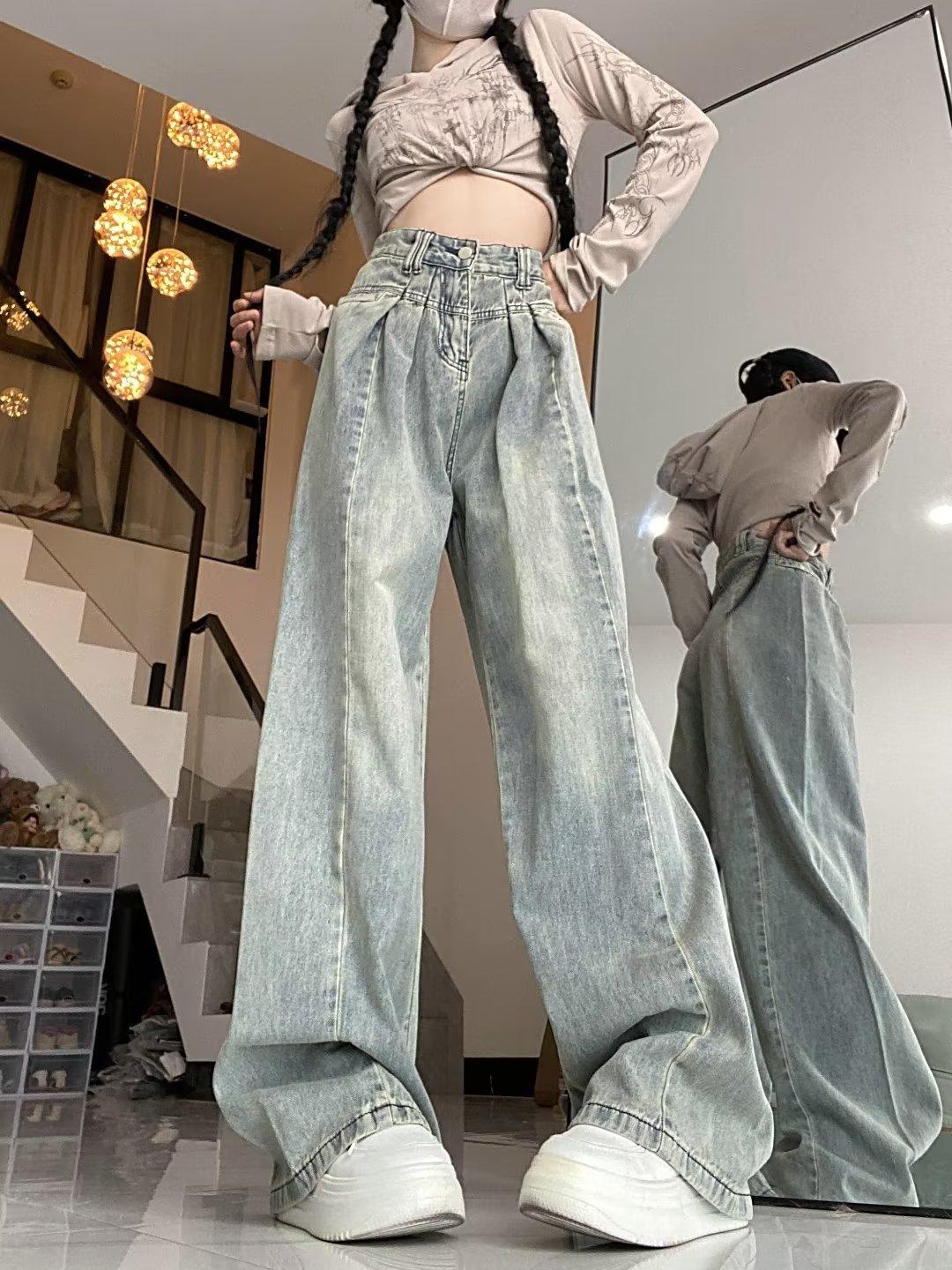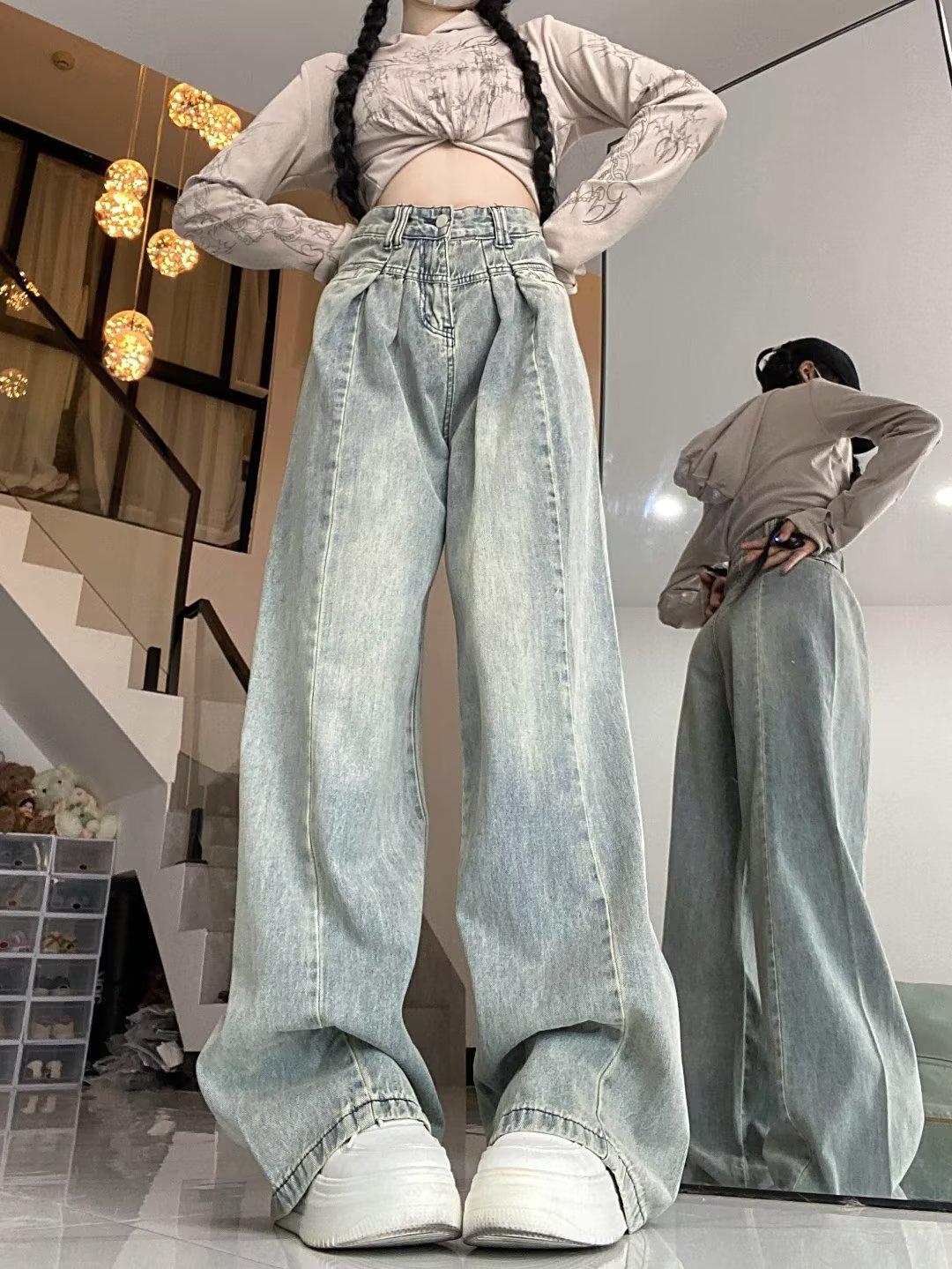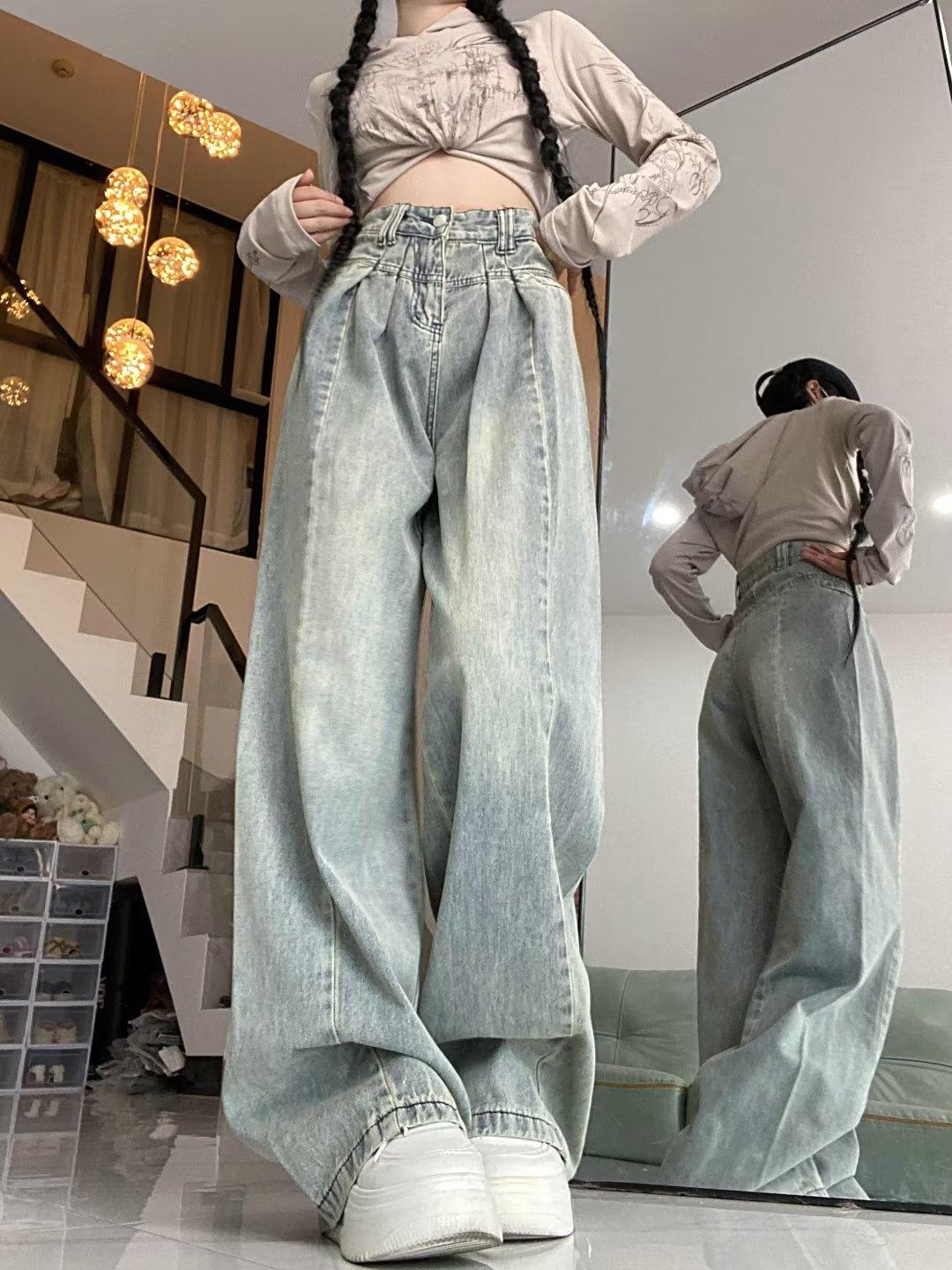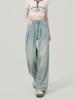 Pantalones vaqueros de pierna ancha con diseño plisado azul claro vintage para mujer, nuevos pantalones de verano de cintura alta, sueltos y drapeados, a la moda