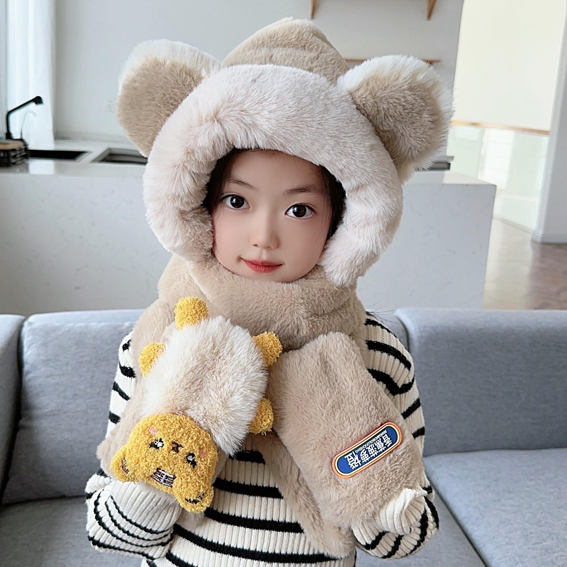 Conjunto de tres piezas de gorro, bufanda y guantes de invierno para niños, gorro esponjoso para niños y niñas, forrado de vellón, grueso, a prueba de frío, con protección para las orejas, gorro para el cabello