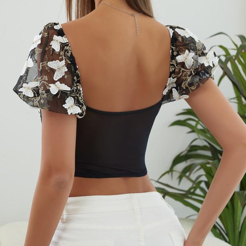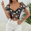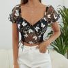 Top corto floral sexy de manga abullonada para mujer transfronteriza con ombligo expuesto, aro de acero, fruncido con cordón en la cintura, chaleco de manga