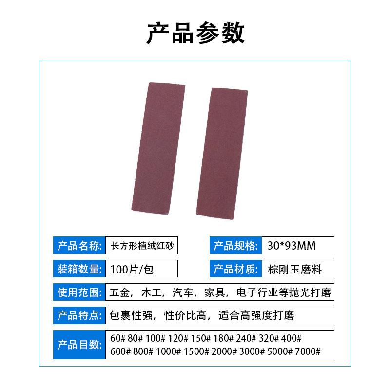Papel de lija rojo cuadrado de 30 x 93 mm, venta al por mayor transfronteriza, papel de lija cuadrado para carpintería, papel de lija flocado, papel de lija autoadhesivo.