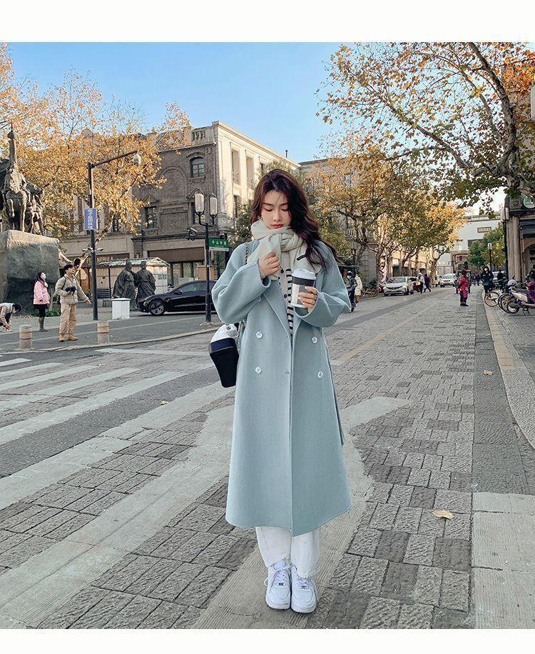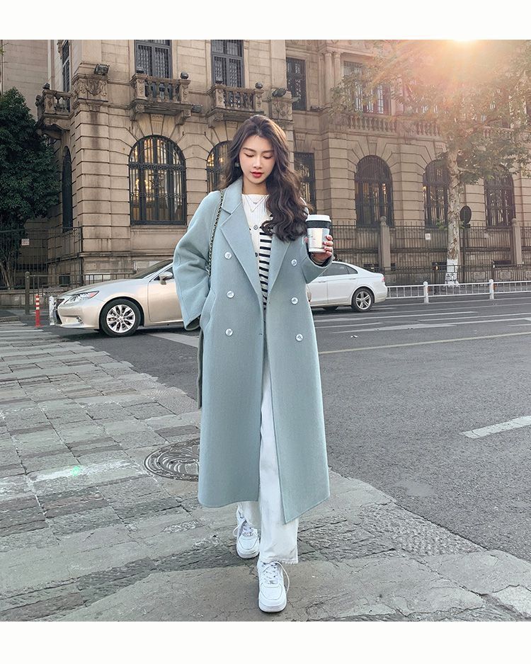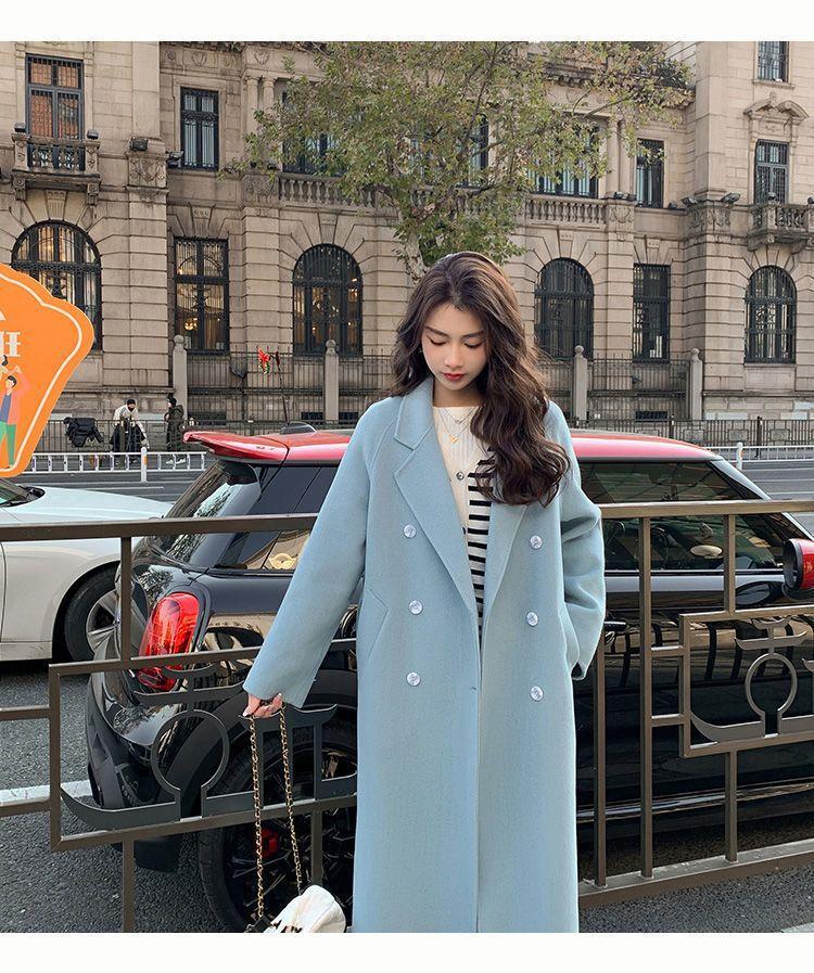 Abrigo de Lana Doble Faz Azul Transfronterizo para Mujer Otoño e Invierno 2024 Nuevo Coreano Suelto Largo Medio Tendencia Hepburn