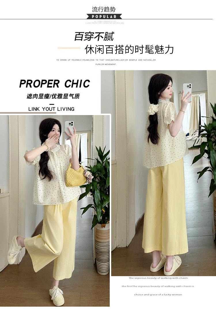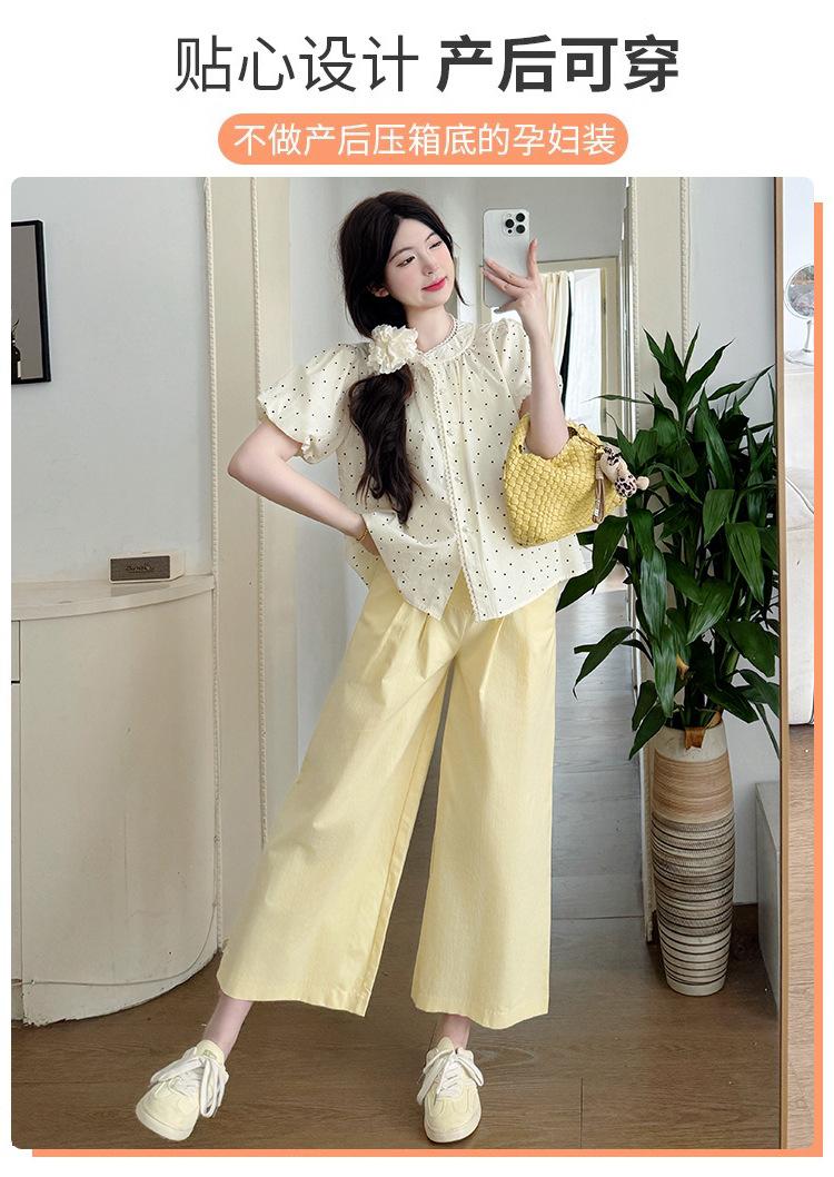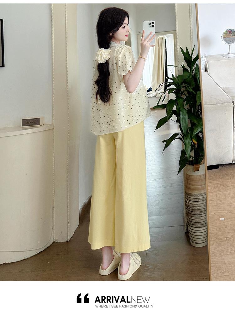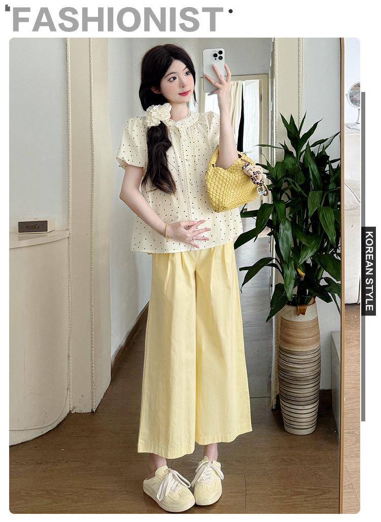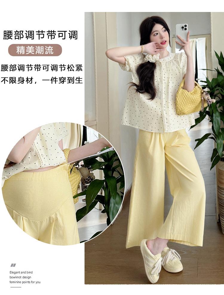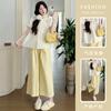 Vestido de verano 2025 para embarazadas, traje coreano dulce y bonito, top de punto tipo polo, pantalones anchos de pierna amarillo leche para embarazadas, conjunto de dos piezas