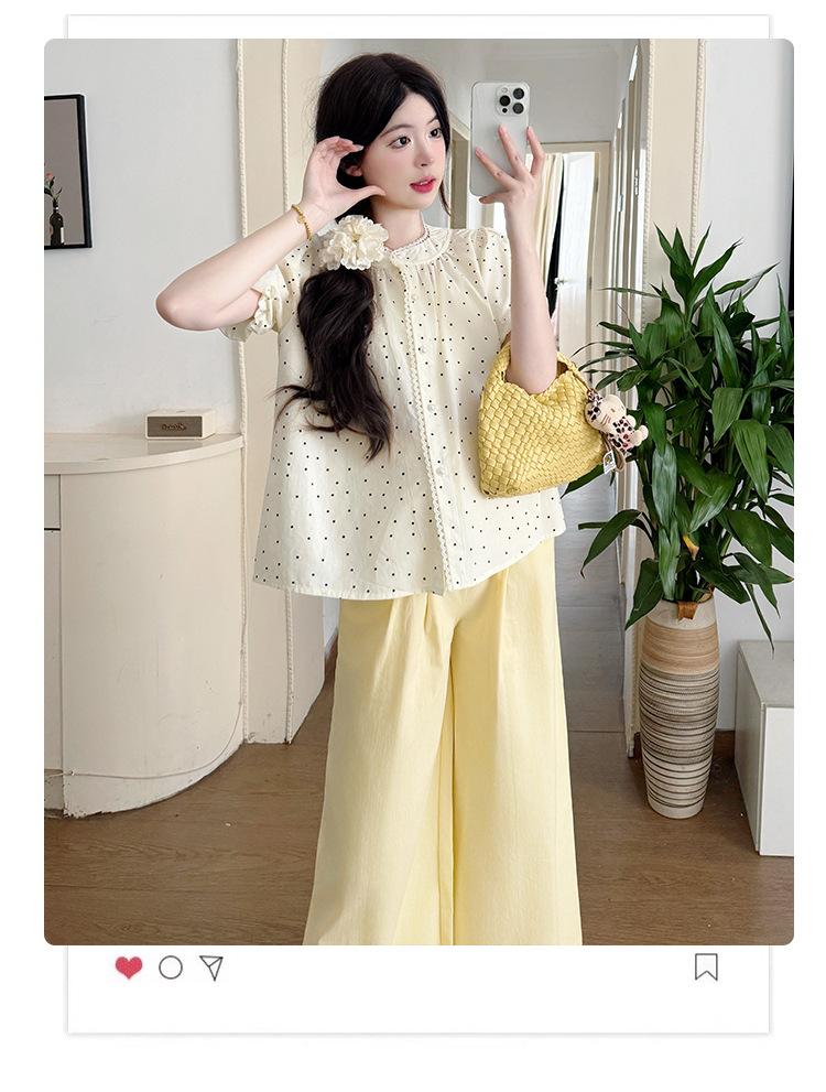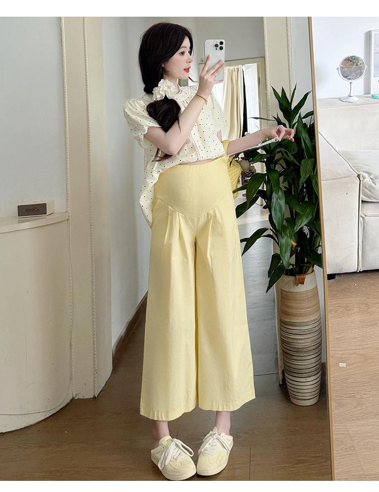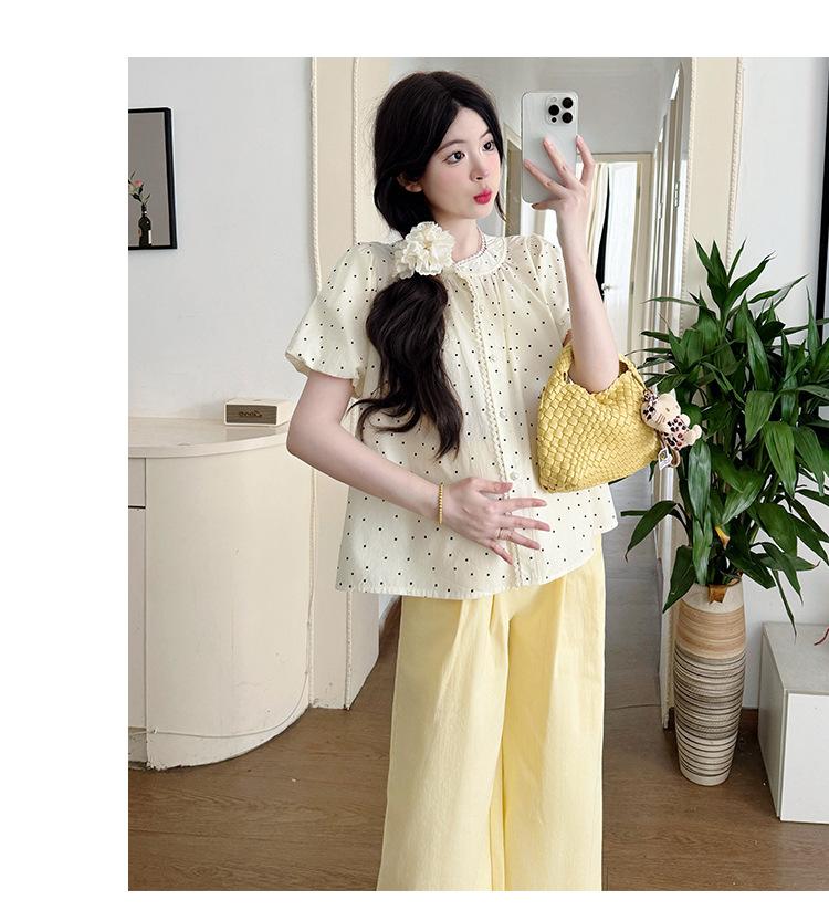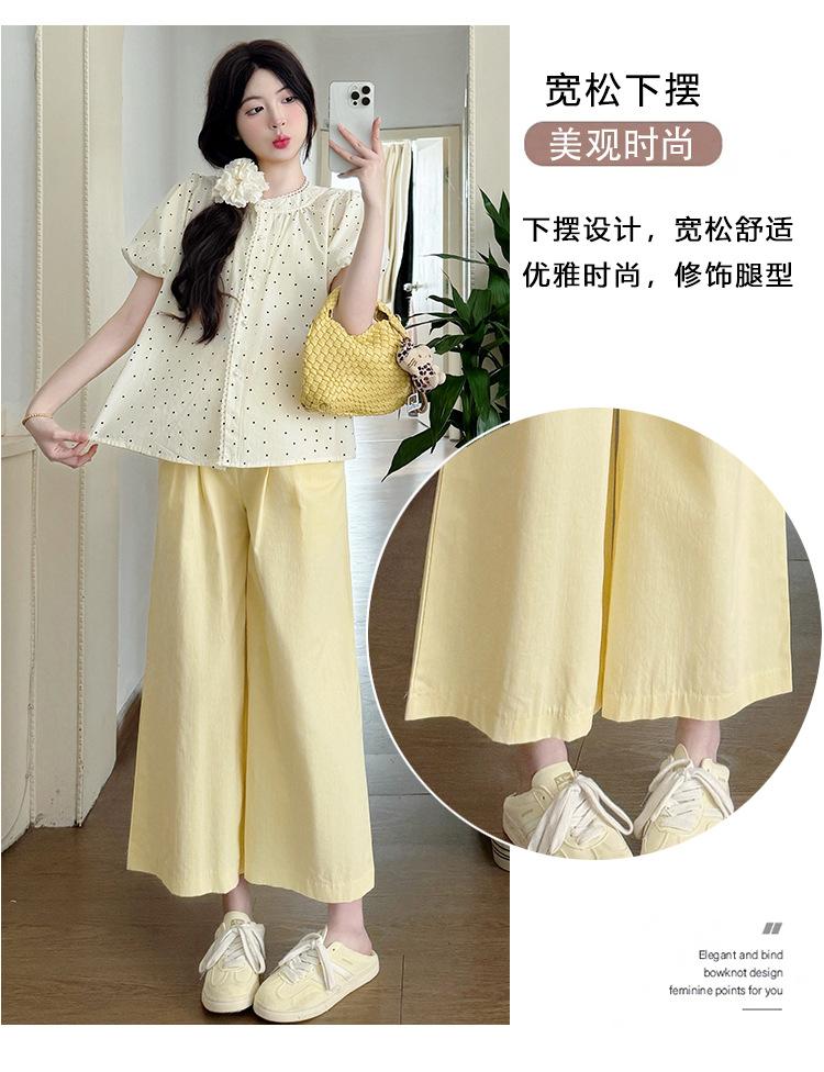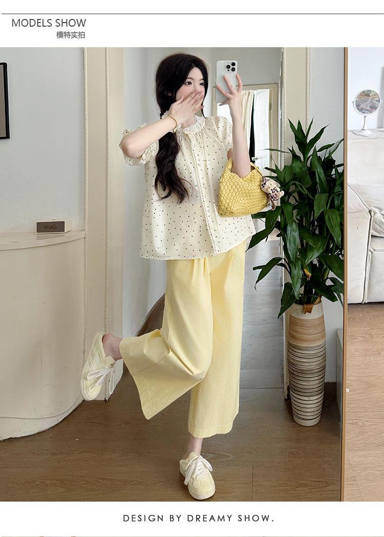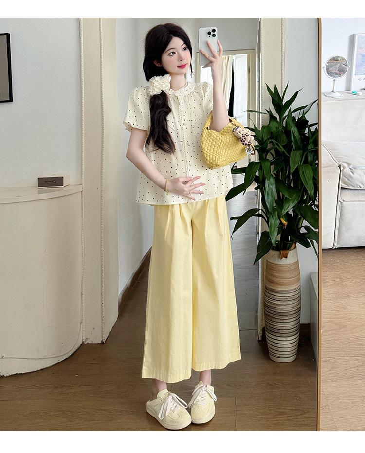 Vestido de verano 2025 para embarazadas, traje coreano dulce y bonito, top de punto tipo polo, pantalones anchos de pierna amarillo leche para embarazadas, conjunto de dos piezas