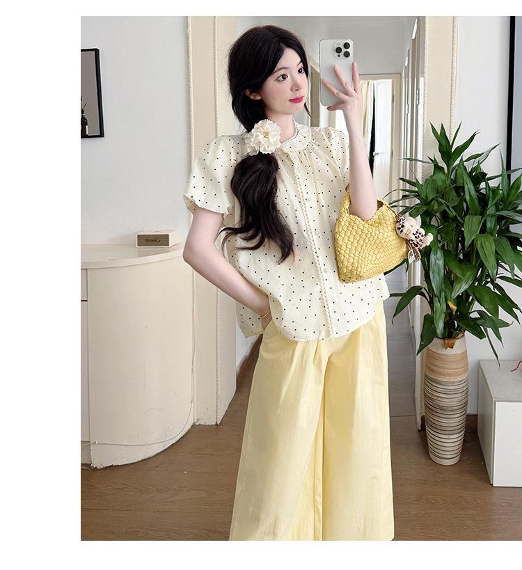 Cream wide leg pants, Polka dot top