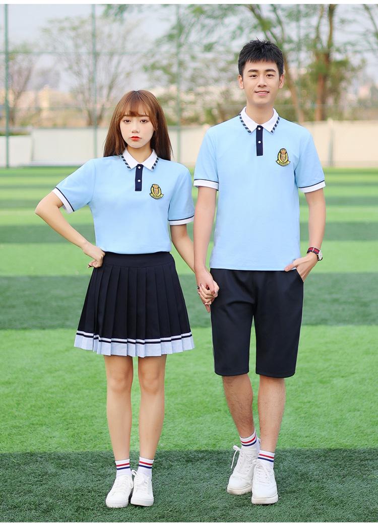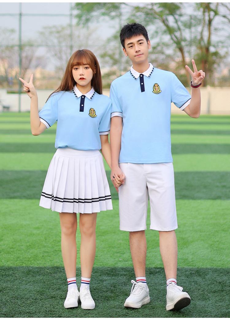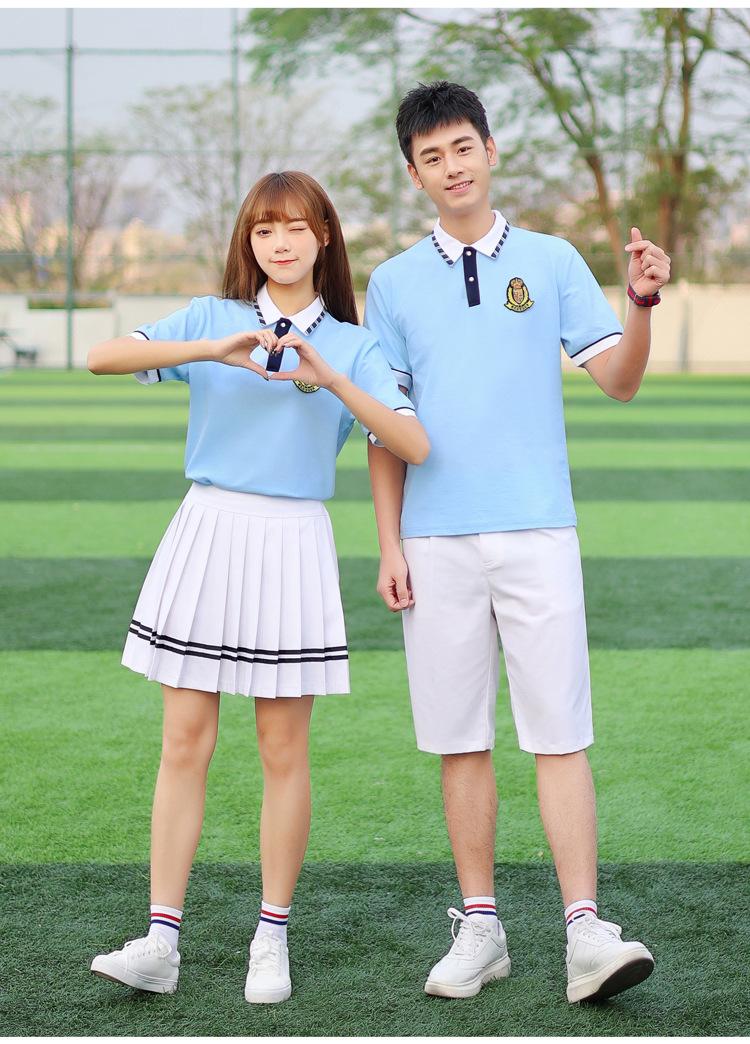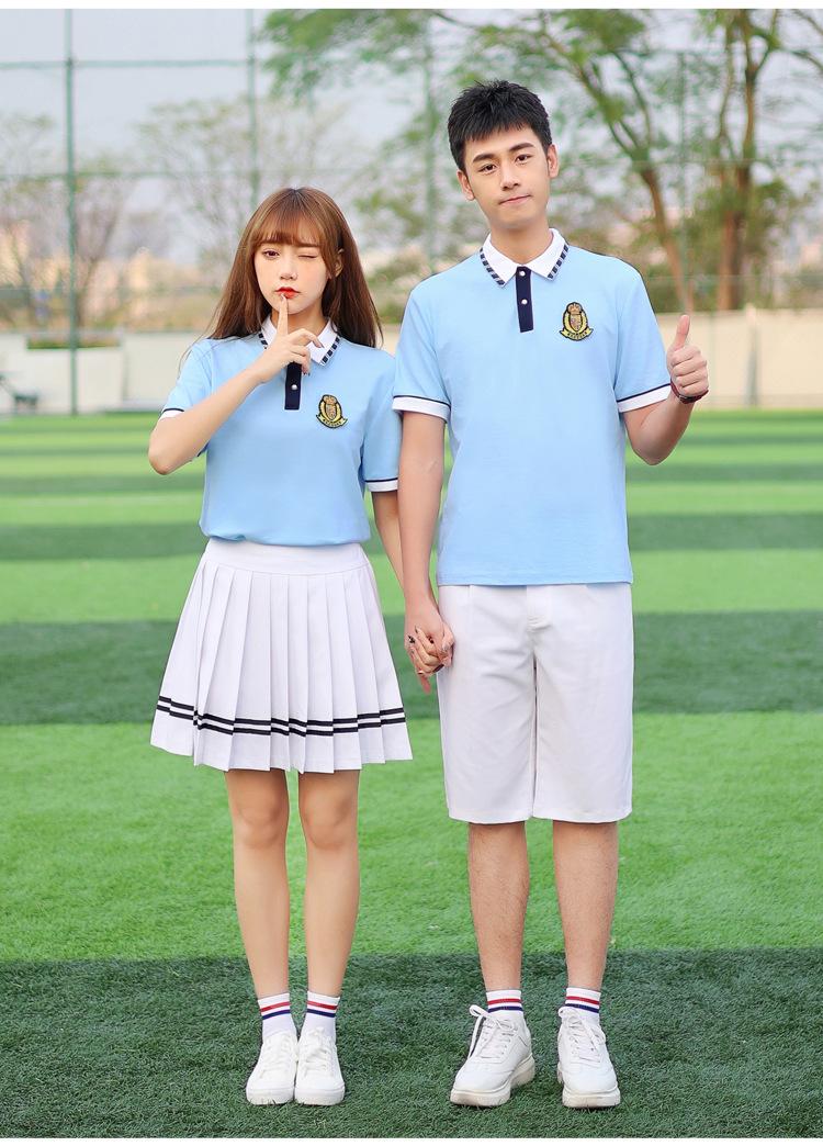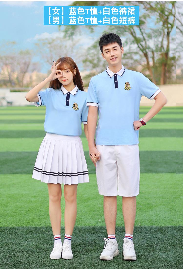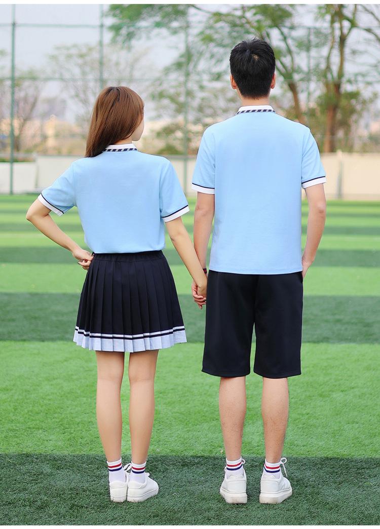 [Male] Blue T-shirt + white shorts, [Female] blue T-shirt + white trouser skirt, [Male] Blue T-shirt + navy sp...