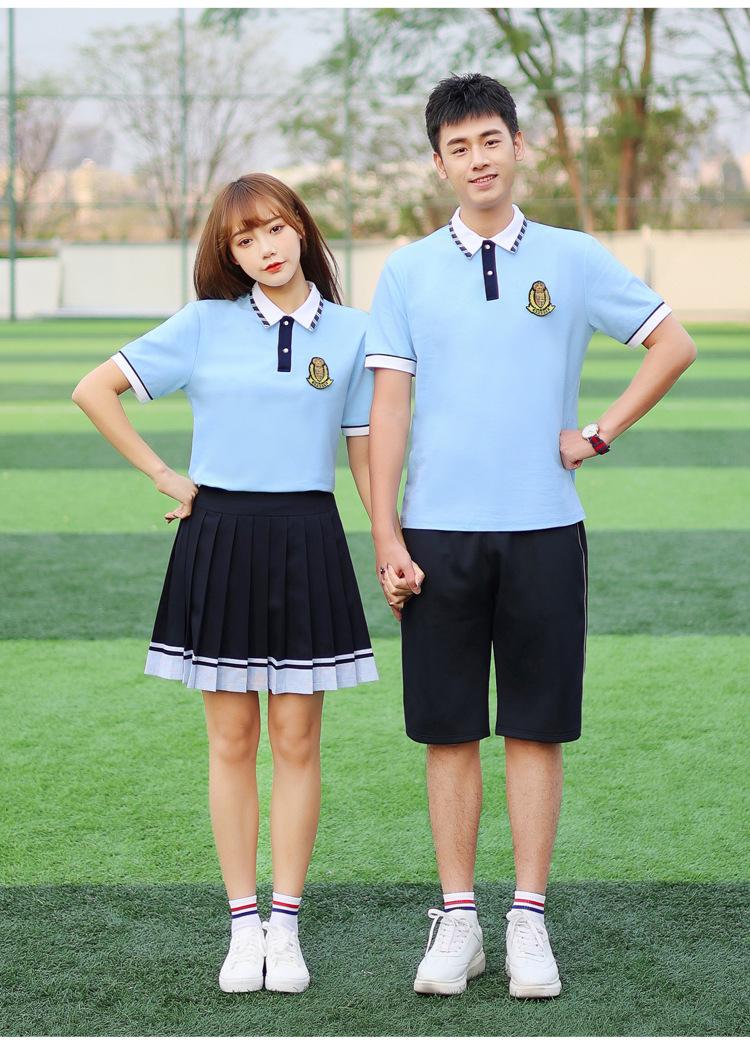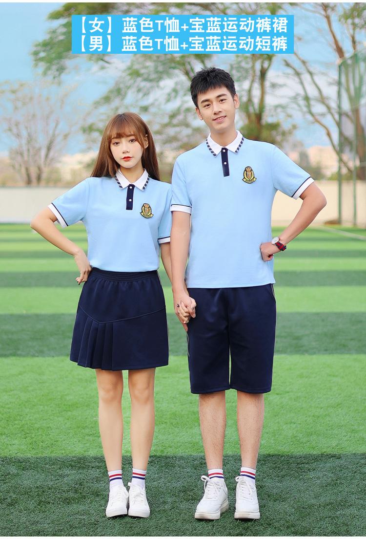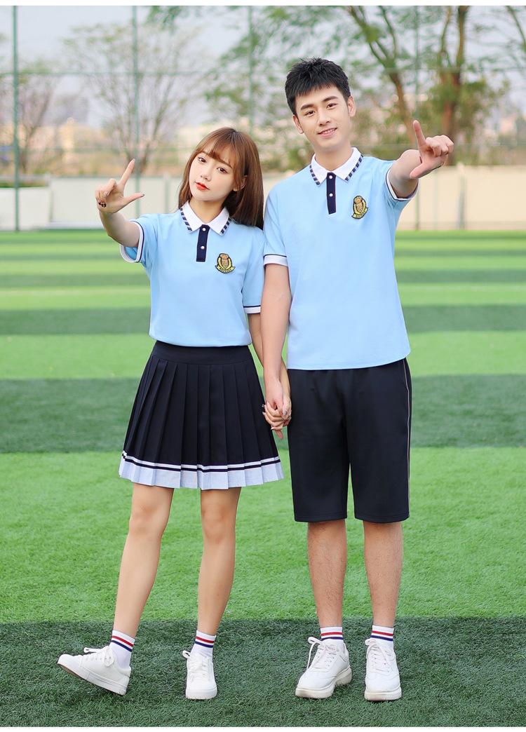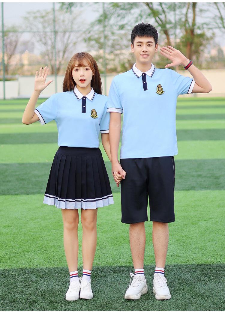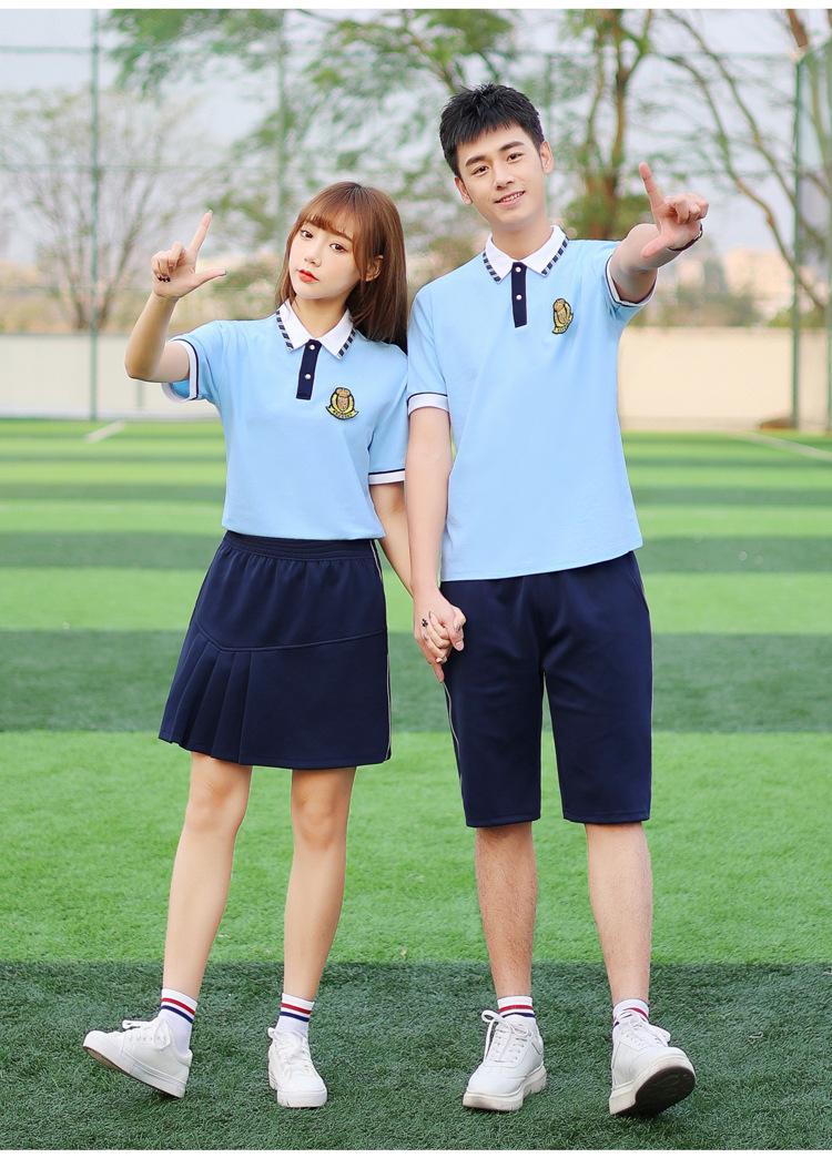 [Male] Blue T-shirt + white shorts, [Female] blue T-shirt + white trouser skirt, [Male] Blue T-shirt + navy sp...
