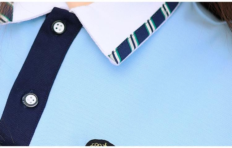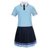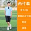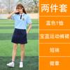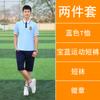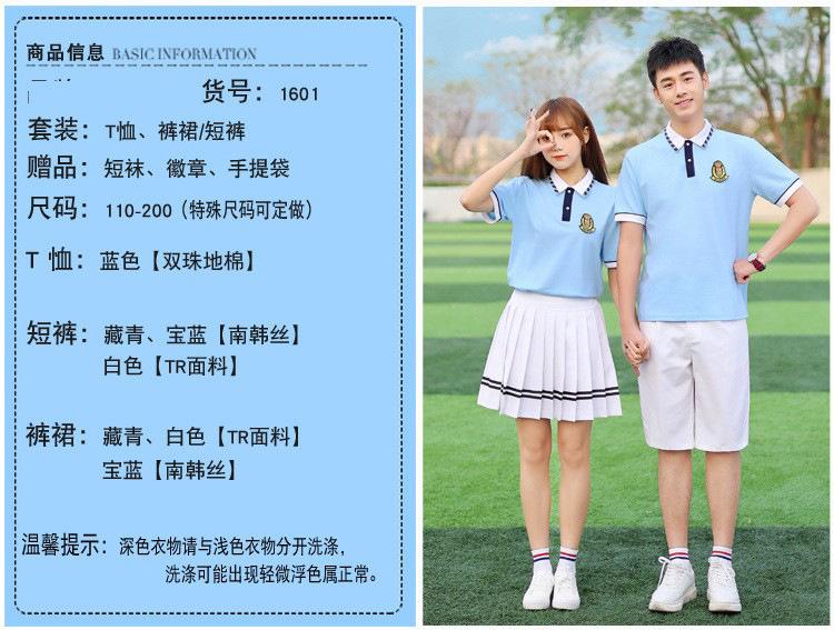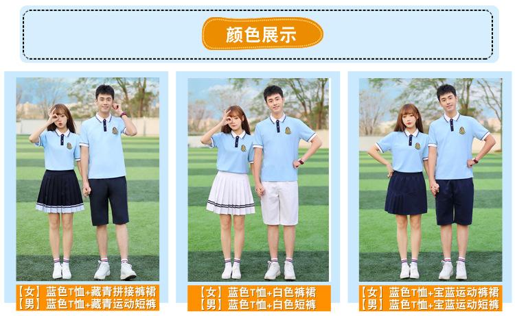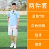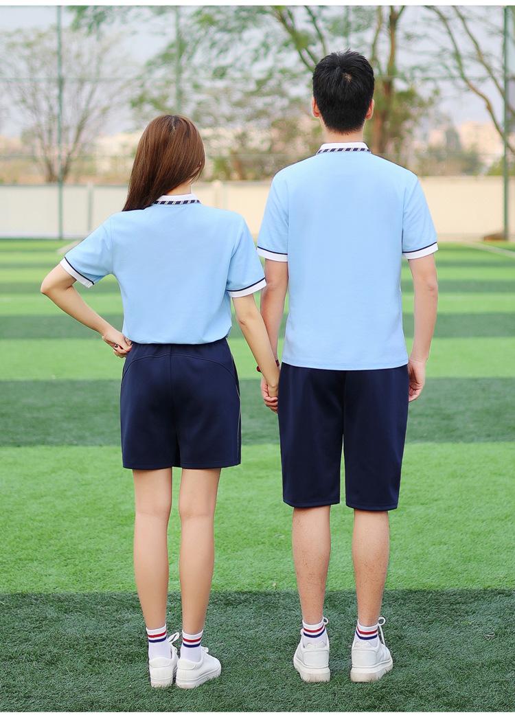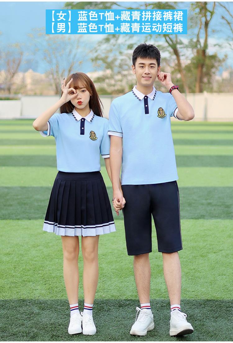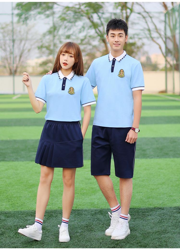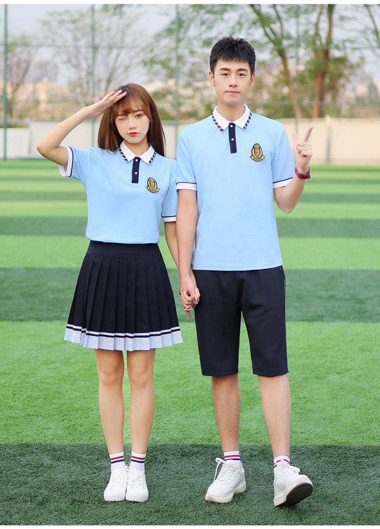 [Male] Blue T-shirt + white shorts, [Female] blue T-shirt + white trouser skirt, [Male] Blue T-shirt + navy sp...