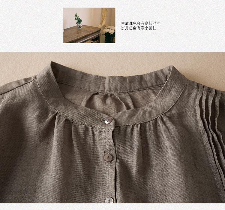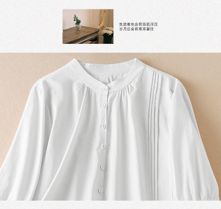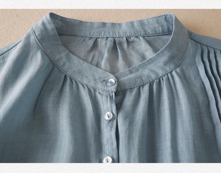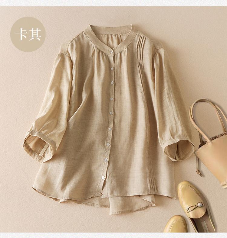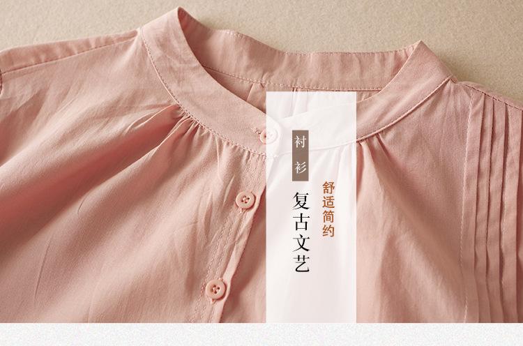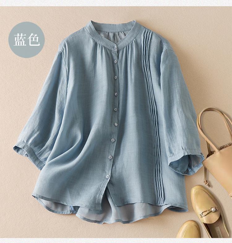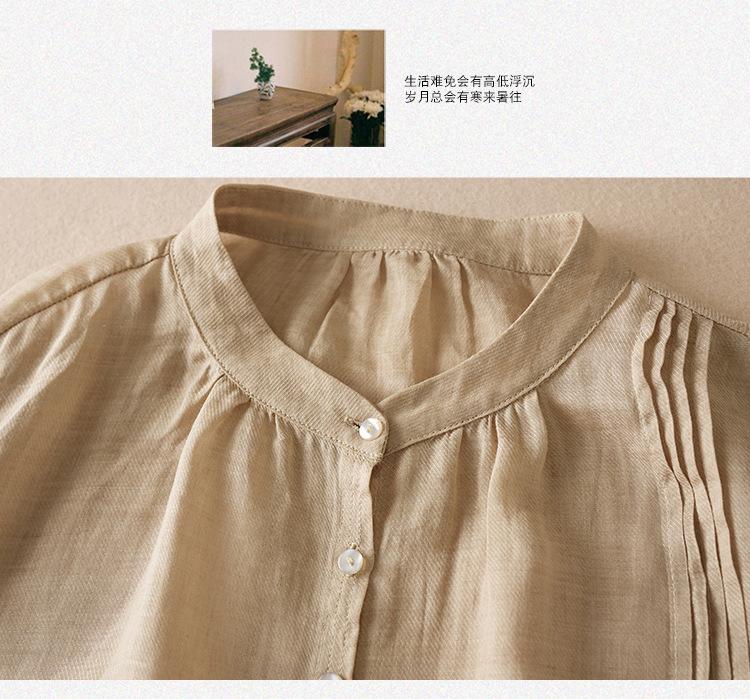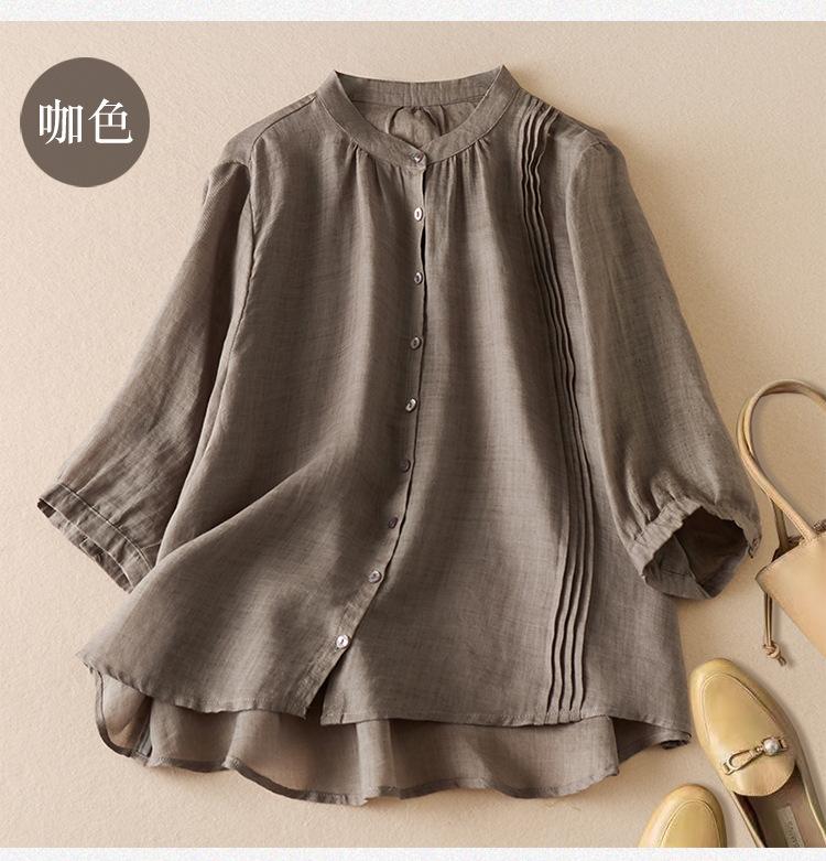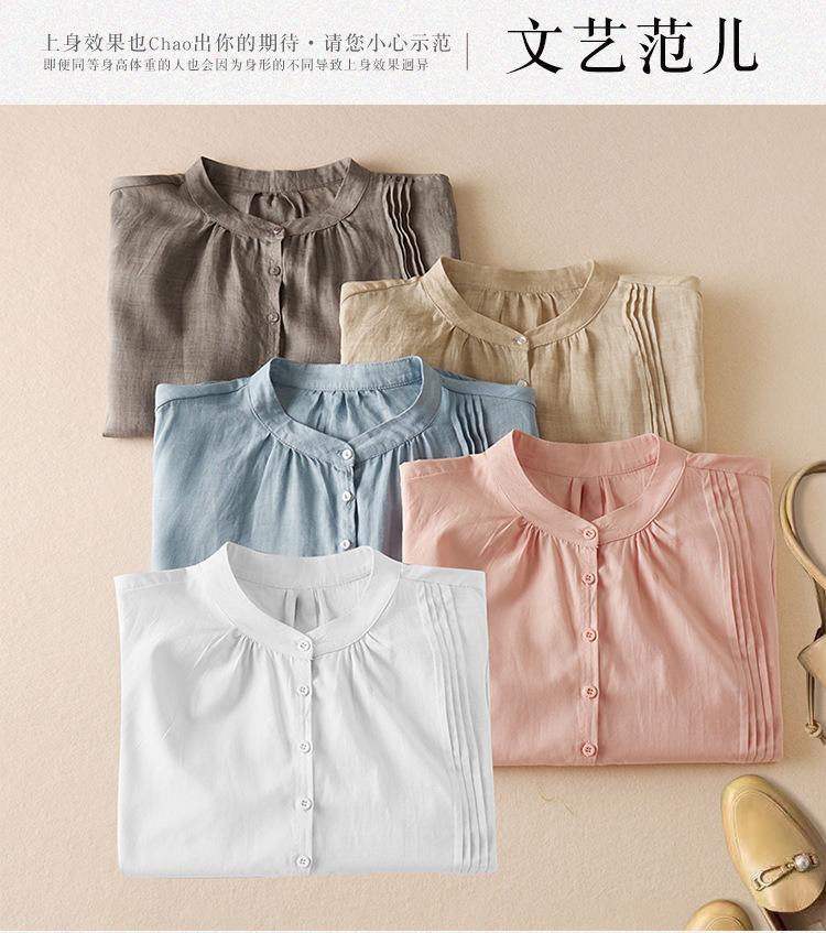 Foto real 2024 verano nuevo arte de algodón y lino suelto cuello alto plisado de órgano camisa top mujer #7178