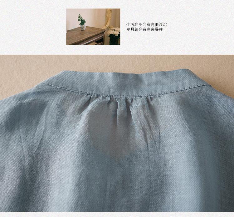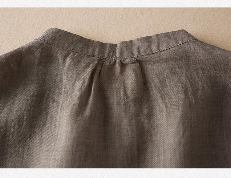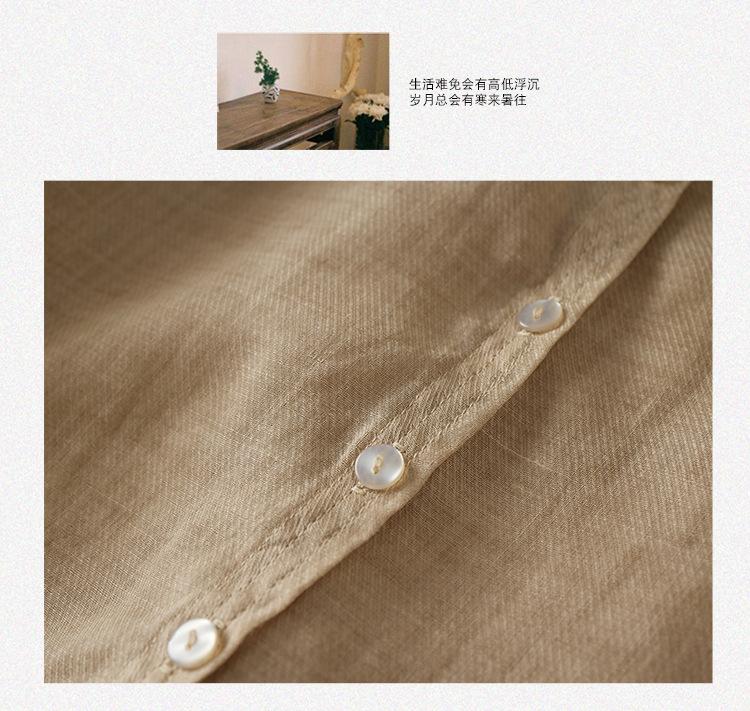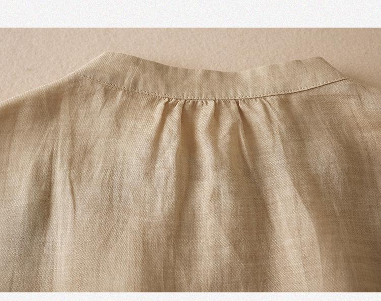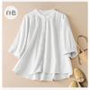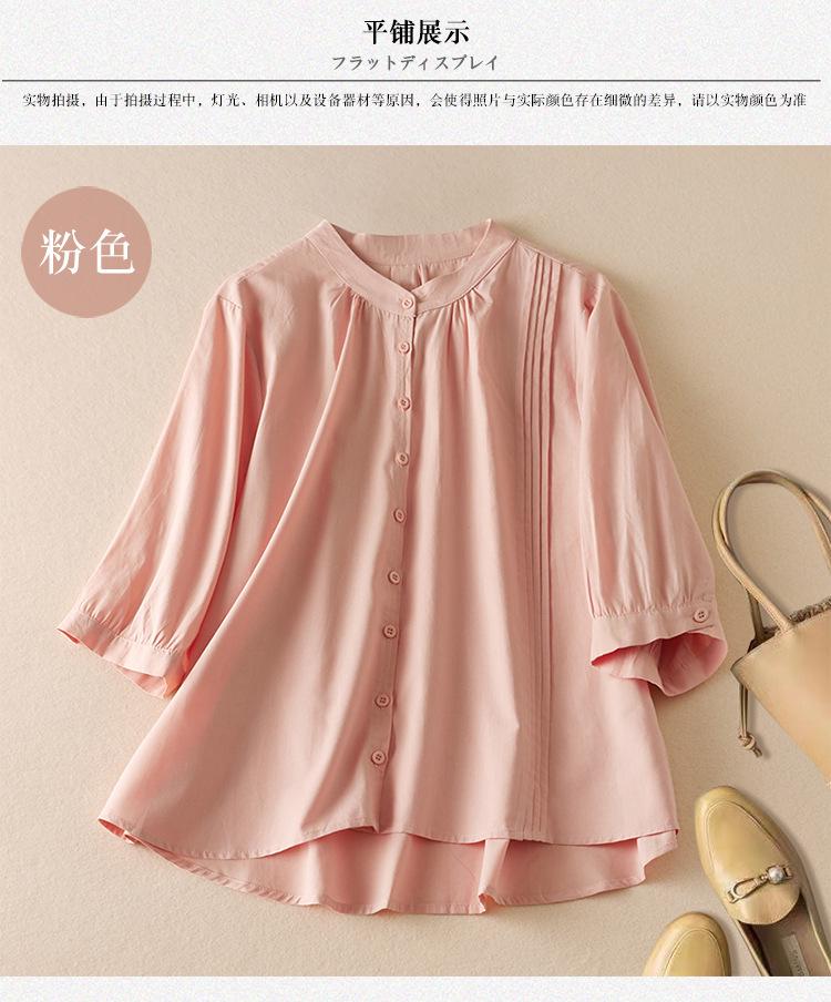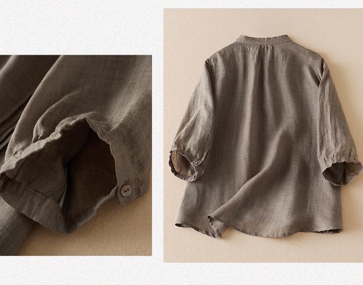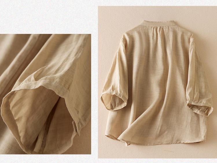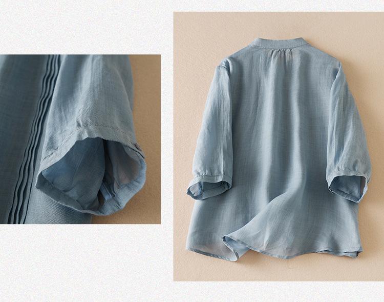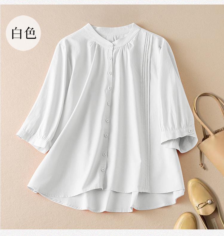 Foto real 2024 verano nuevo arte de algodón y lino suelto cuello alto plisado de órgano camisa top mujer #7178