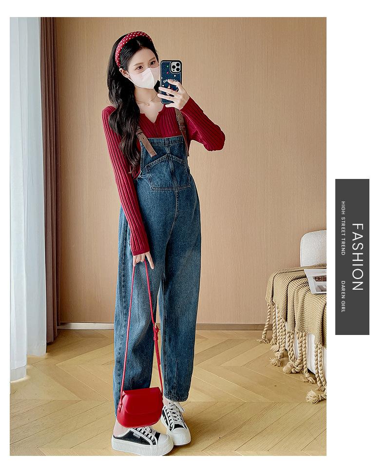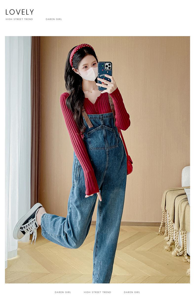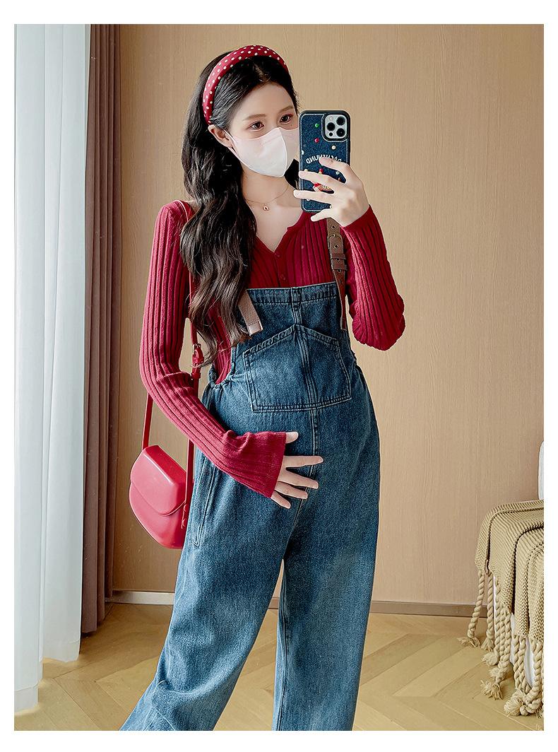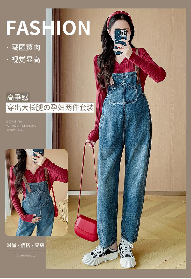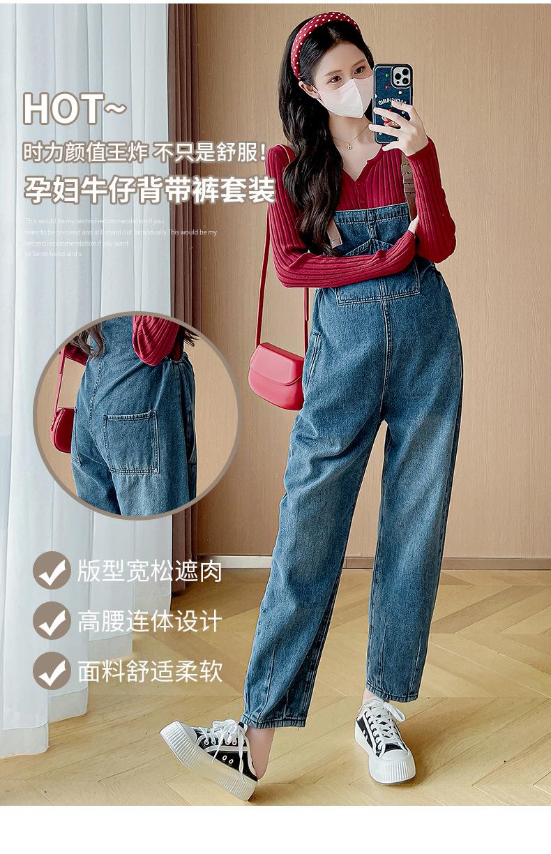 Ropa de maternidad de tiro real, nuevos tirantes casuales vintage, de moda, de pierna ancha, tirantes de mezclilla, traje de suéter rojo