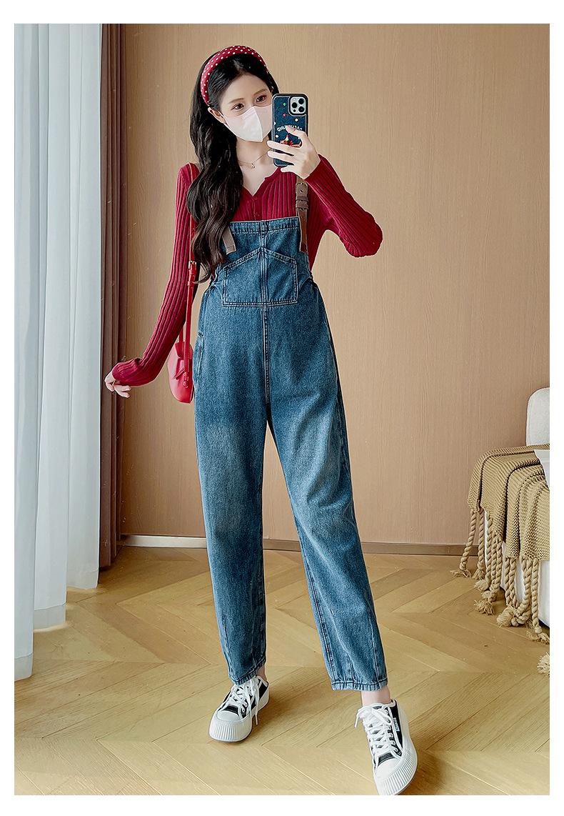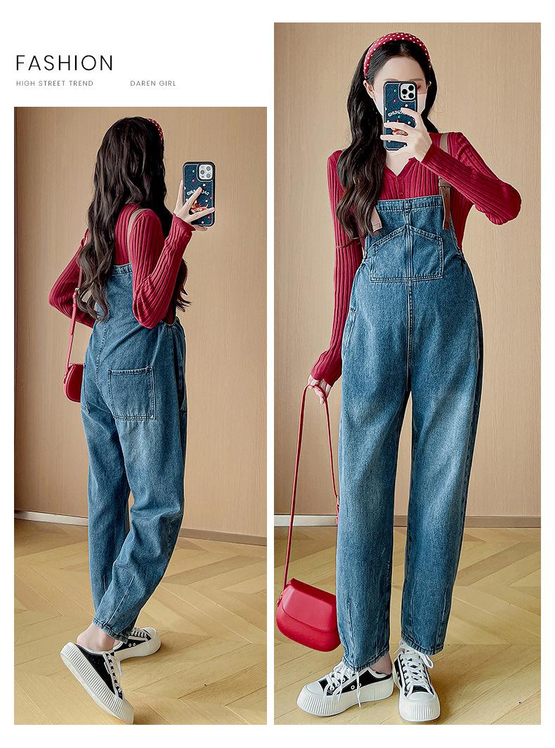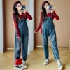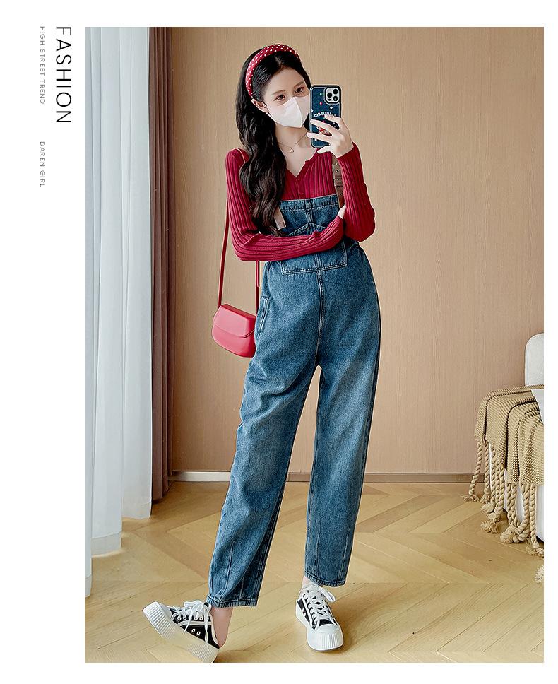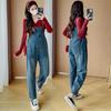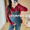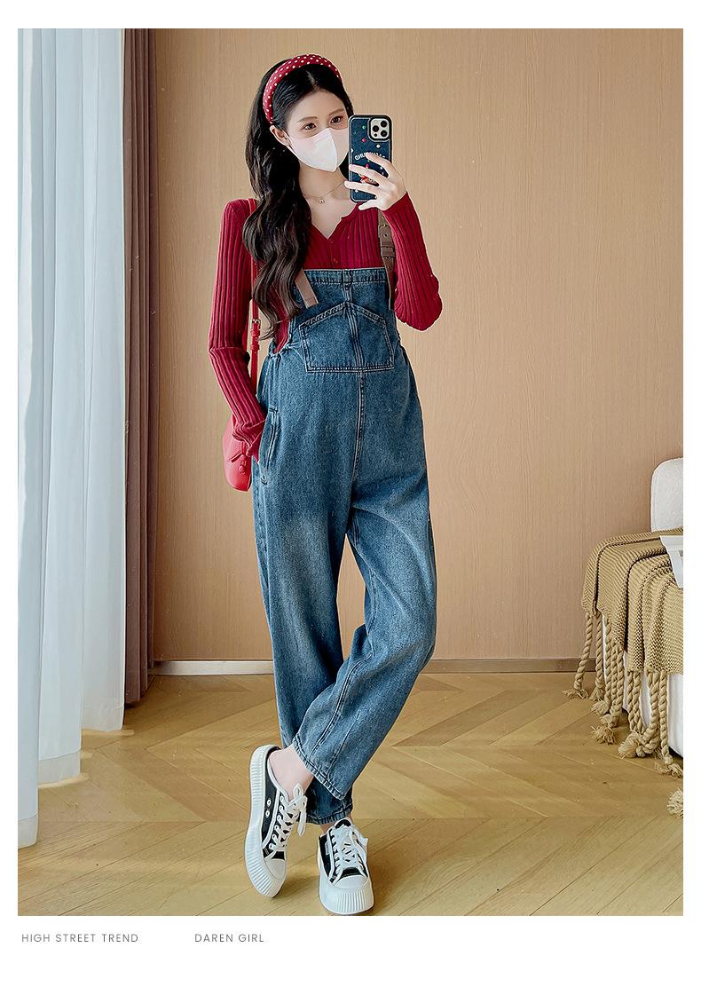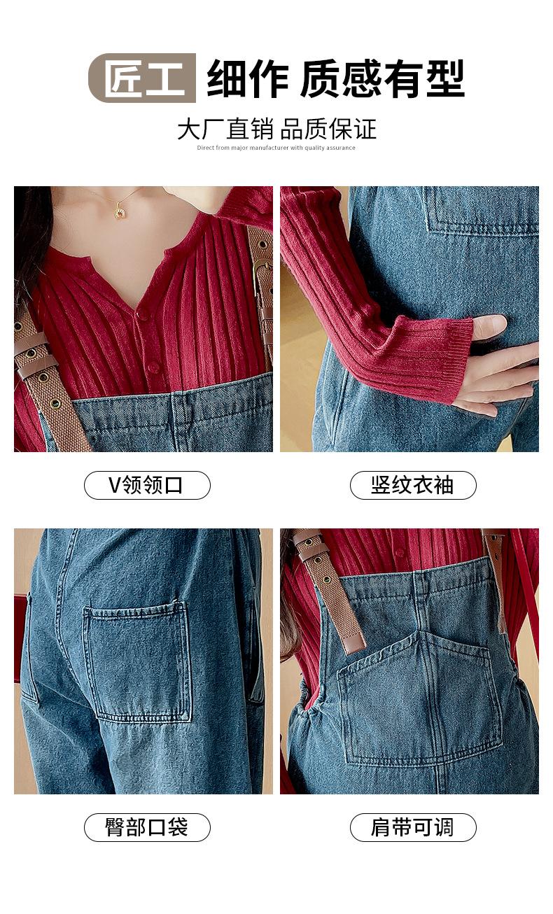 Ropa de maternidad de tiro real, nuevos tirantes casuales vintage, de moda, de pierna ancha, tirantes de mezclilla, traje de suéter rojo