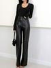 Pantalones de cuero negro holgados para mujer, de pierna ancha, rectos, de cintura alta y de cuero PU, para Europa y América.